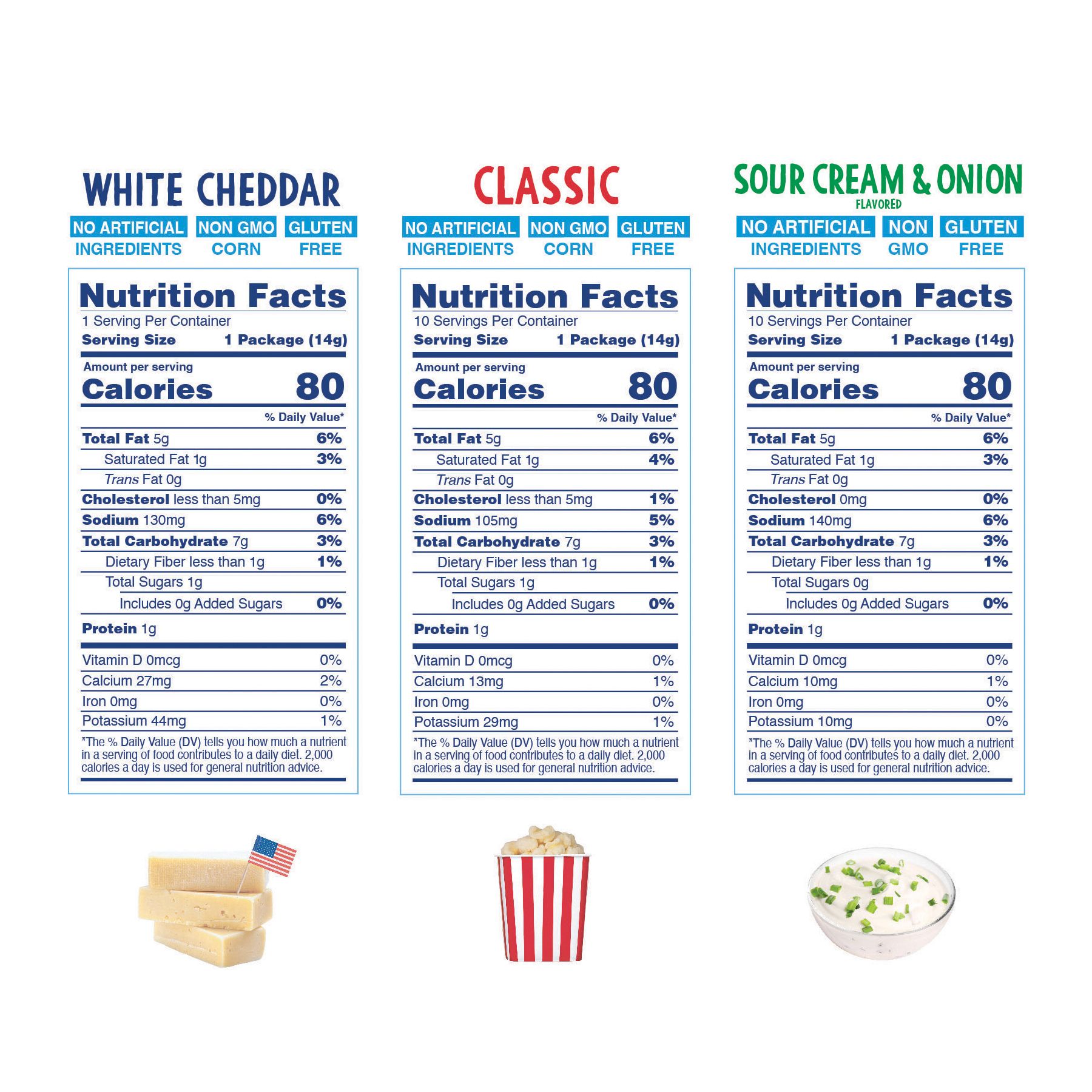 Ingredients: Sour Cream and Onion: Non-GMO Corn Meal, Non-GMO Sunflower Oil and/or Non-GMO Canola Oil, Non-GMO Sour Cream & Onion Seasoning (Maltodextrin, Salt, Sour Cream [Cream, Cultures, Lactic Acid], Nonfat Dry Milk, Onion Powder, Yeast Extract, Natural Flavors, Citric Acid, Lactic Acid, Garlic Powder, Parsley). Classic: Non-GMO Corn Meal, Non-GMO Sunflower Oil and/or Non-GMO Canola Oil, Like Air Classic Seasoning (Whey, Butter, Salt, Non-Fat Dry Milk, Natural Flavors). White Cheddar: Non-GMO Corn Meal,Non-GMO Sunflower Oil and/or Non-GMO Canola Oil, White Cheddar Seasoning (Whey, Buttermilk Solids, Cheddar Cheese (Milk, Salt, Cultures, Enzymes), Non-Fat Dry Milk, Salt, Natural Flavors, Butter, Yeast Extract, Lactic Acid, Dehydrated Onion, Citric Acid).