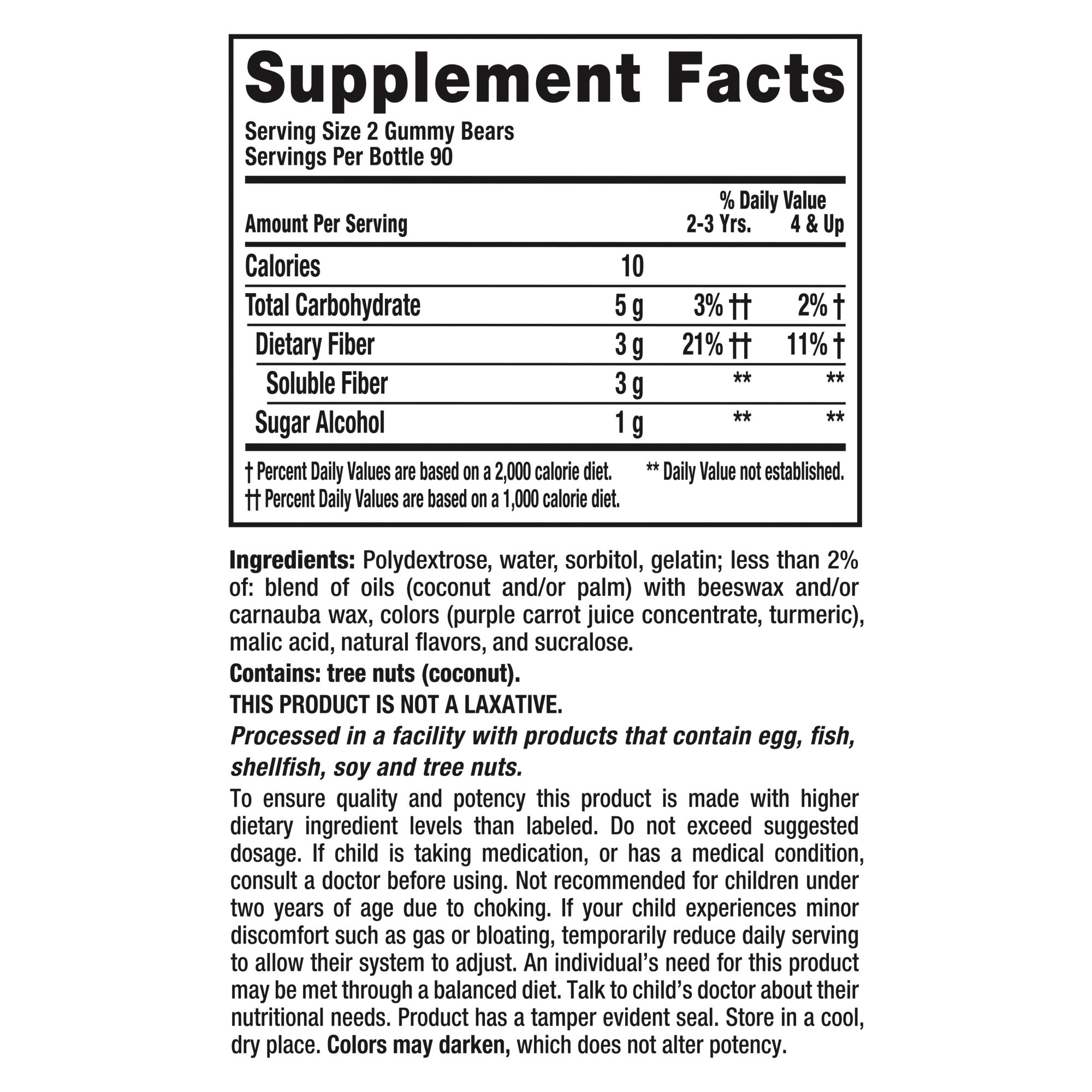 Keep Things Running Smoothly In Your Household!* L'il Critters Fiber Gummy Bears is a great way to support your child's digestive system with 3 grams of soluble fiber in every delicious gummy serving;* that's more fiber than in 1 cup of asparagus! L'il Critters Fiber Gummy Bears are also sugar-free. Did you know? One serving of L'il Critters Fiber Gummy Bears has as much fiber as four prunes. Processed in a facility with products that contain egg, fish, shellfish, soy and tree nuts. Tips for Everyday Regularity: 1.) Make sure your child drinks plenty of water. 2.) Encourage your child to exercise. 3.) Add high-fiber foods such as fruits and vegetables to their diets, and talk to your child’s doctor about supplementing with L'il Critters Fiber Gummy Bears if your child still isn’t getting enough. 4.) Set up a regular bathroom routine.