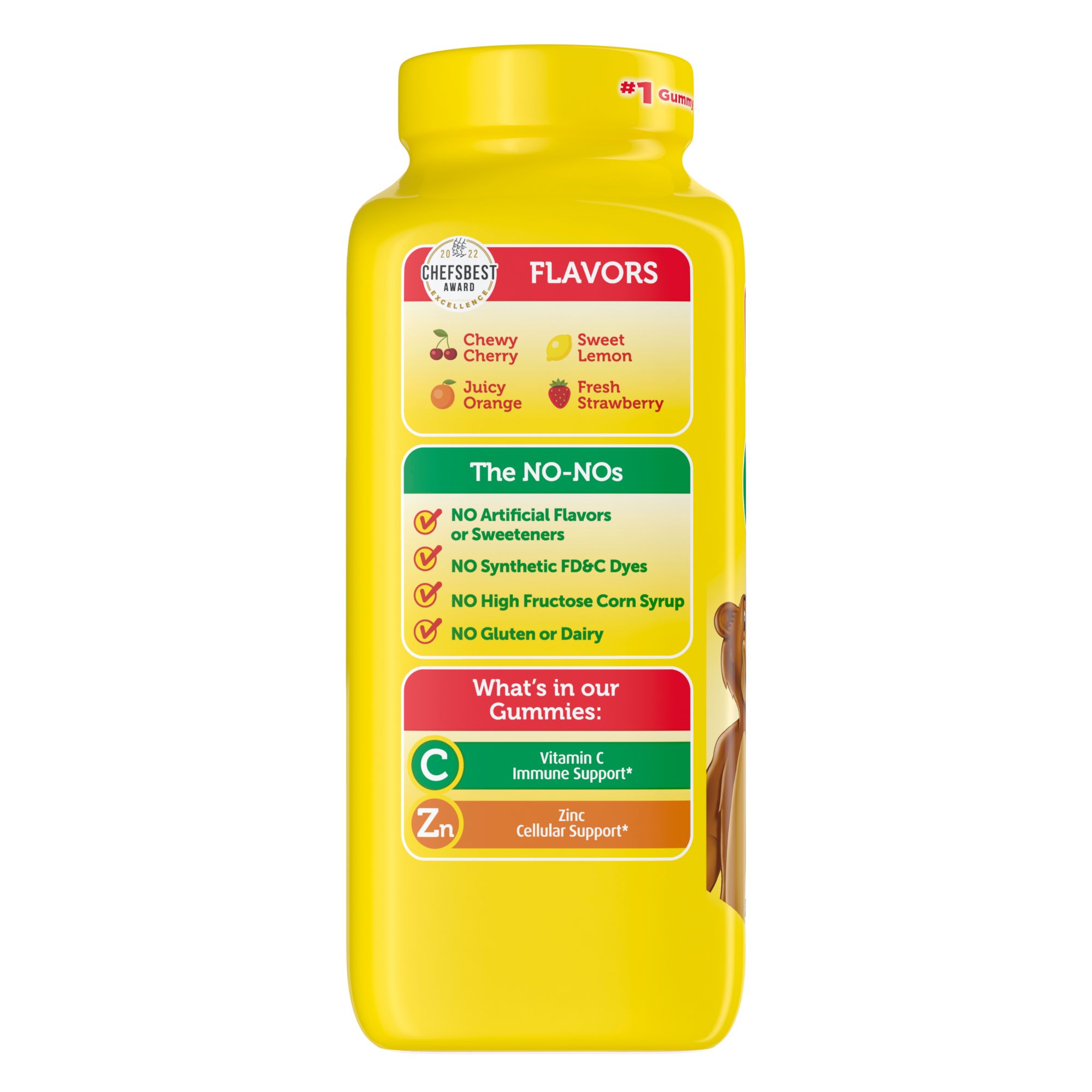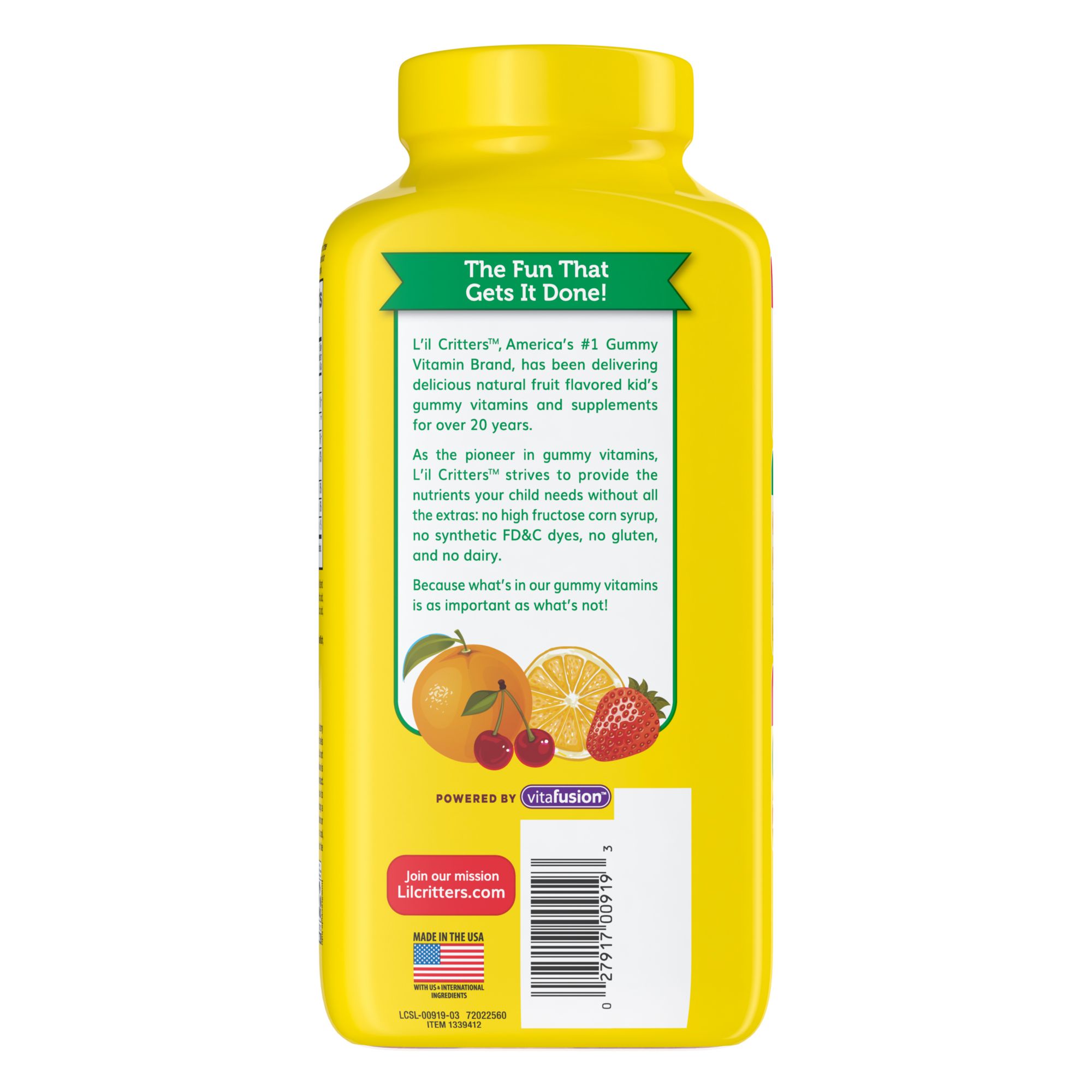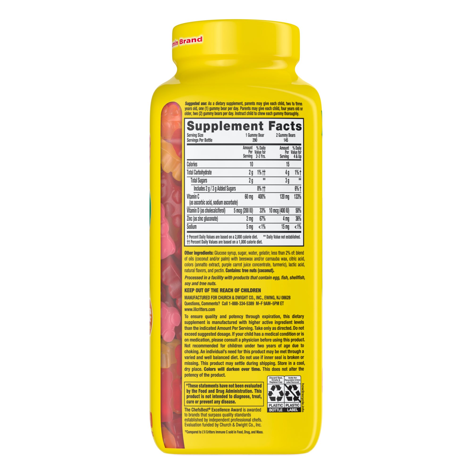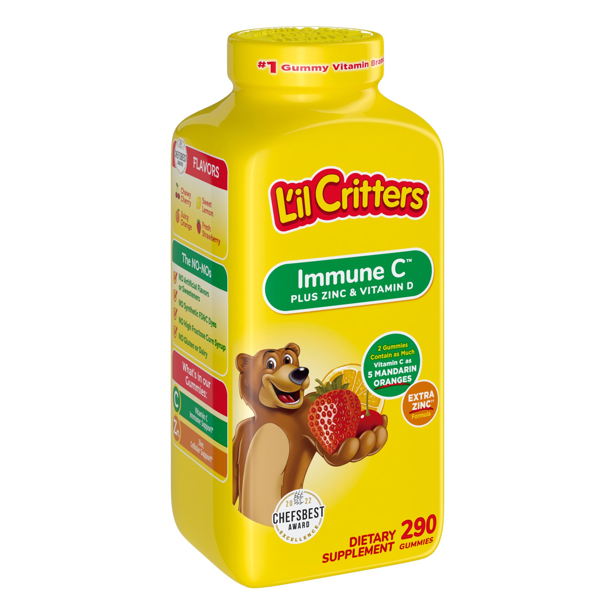 L'il Critters, America's #1 gummy vitamin brand. One serving of L'il Critters Immune C Plus Zinc and Vitamin D provides kids with 120mg of Vitamin C for immune support, 2.3mg of Zinc for cellular support, and 10 mcg of Vitamin D. L'il Cirtters Immune C does not use FD&C Red #40, Blue #1, or Yellow #6. L'il Critters also does not contain High Fructose Corn Syrup, Artificial Flavors or Sweeteners, Gluten, or Dairy. A two-gummy serving provides an excellent source of Vitamin C, ZInc, and Vitamin D. Based on 52 week Unit Sales, Nielsen all outlet data, through March 2019.