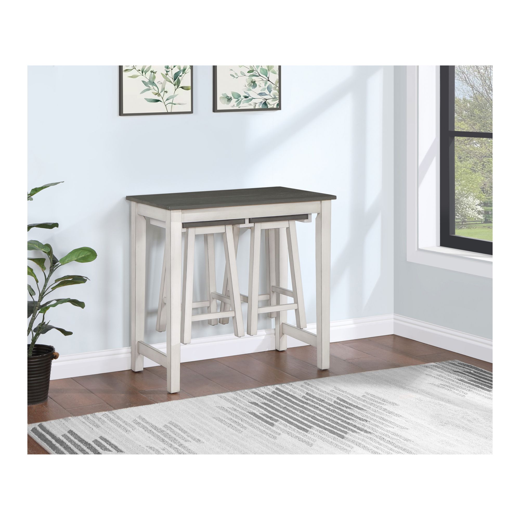 Set includes one counter height table and two stools