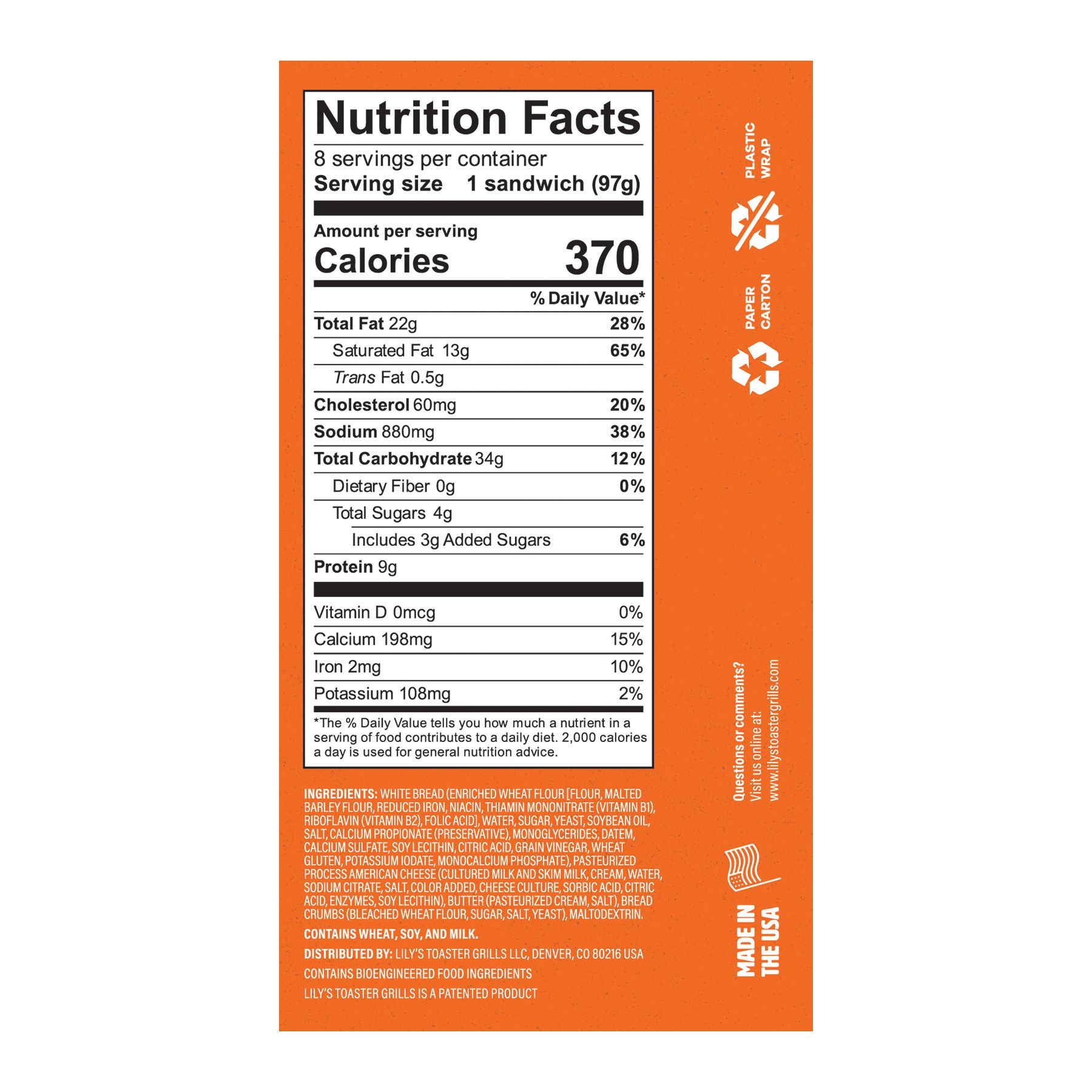 Ingredients: White Bread (Enriched Wheat Flour [Flour, Malted Barley Flour, Reduced Iron, Niacin, Thiamin Mononitrate (Vitamin B1), Riboflavin (Vitamin B2), Folic Acid], Water, Sugar, Yeast, Soybean Oil, Salt, Calcium Propionate (Preservative), Monoglycerides, Datem, Calcium Sulfate, Soy Lecithin, Citric Acid, Grain Vinegar, Wheat Gluten, Potassium Iodate, Monocalcium Phosphate), Pasteurized Process American Cheese (Cultured Milk And Skim Milk, Cream, Water, Sodium Citrate, Salt, Color Added, Cheese Culture, Sorbic Acid, Citric Acid, Enzymes, Soy Lecithin), Butter (Pasteurized Cream, Salt), Bread Crumbs (Bleached Wheat Flour, Sugar, Salt, Yeast), Maltodextrin.