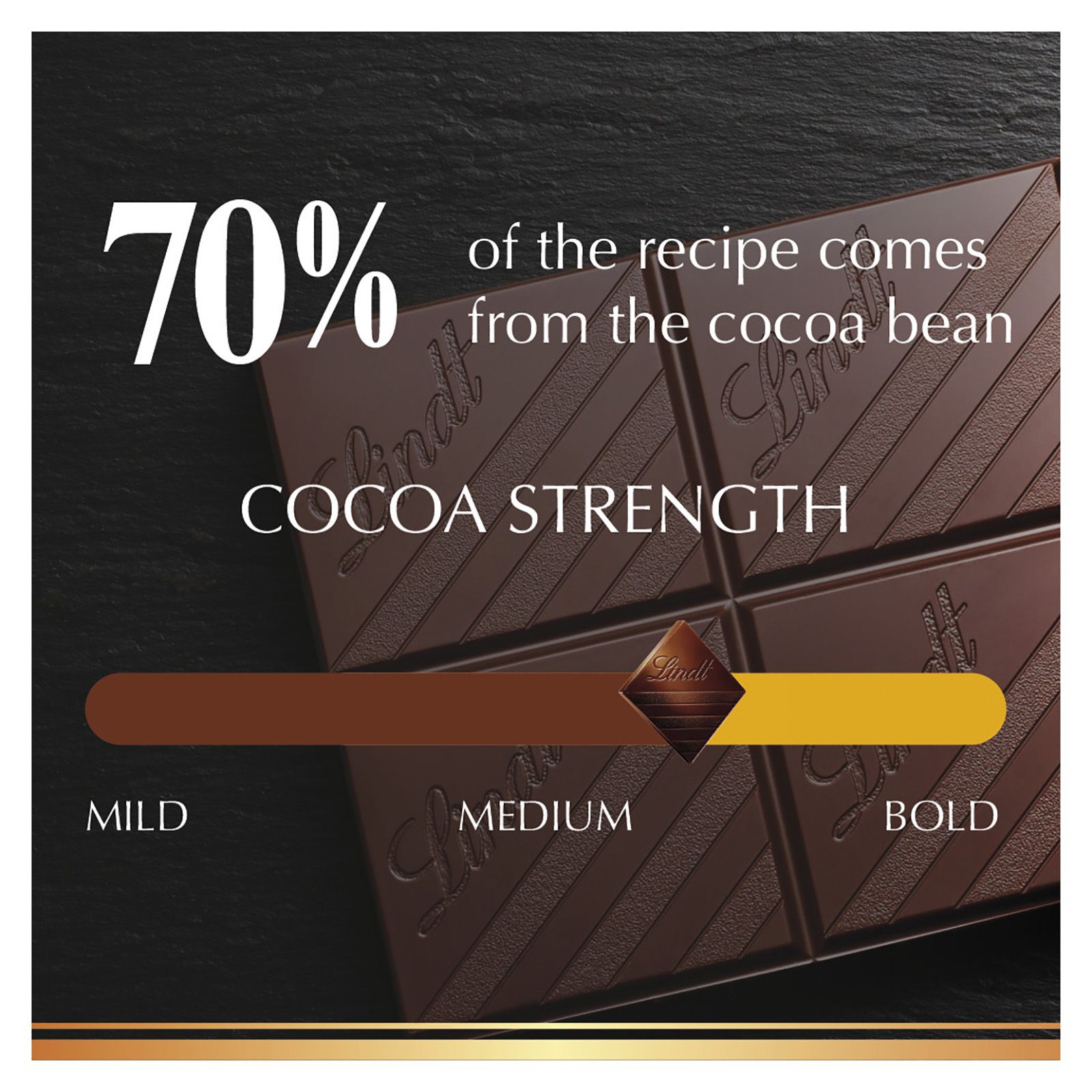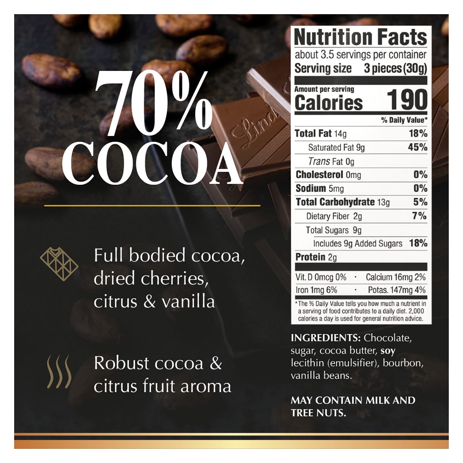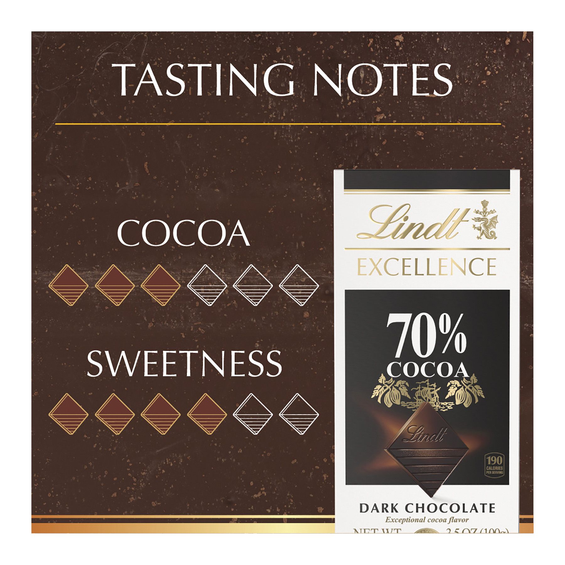 Dive into the refined richness of a Lindt Excellence 70% Cocoa Dark Chocolate Bar with all your senses. This full-bodied dark chocolate bar features a deep, dark color and attractive aroma with well-balanced cocoa notes that are robust, but not too intense, with an exceptionally silky feel. The sophisticated flavors in this dark chocolate candy bar make this gourmet chocolate the perfect pairing with cabernet sauvignon. Give a dark chocolate candy bar to your favorite chocolate connoisseur, or use them as baking chocolate for intense cocoa flavor in your premium chocolate desserts. This Lindt dark chocolate bar comes portioned into bite size squares, ensuring balanced complexity in each bite. Lindt chocolate is masterfully crafted using the highest-quality ingredients from world-renowned regions, embodying the passion and craftsmanship of Lindt Master Chocolatiers.