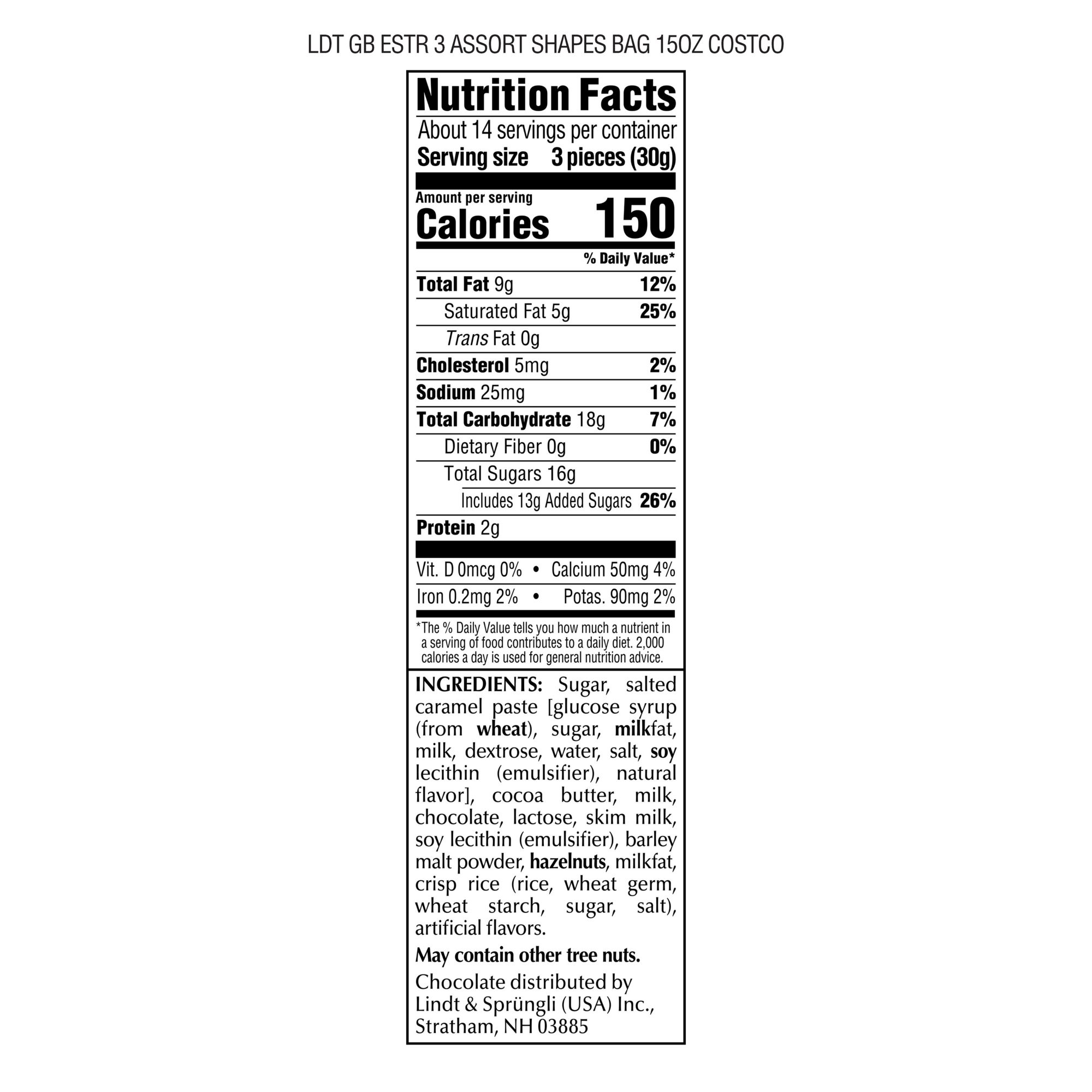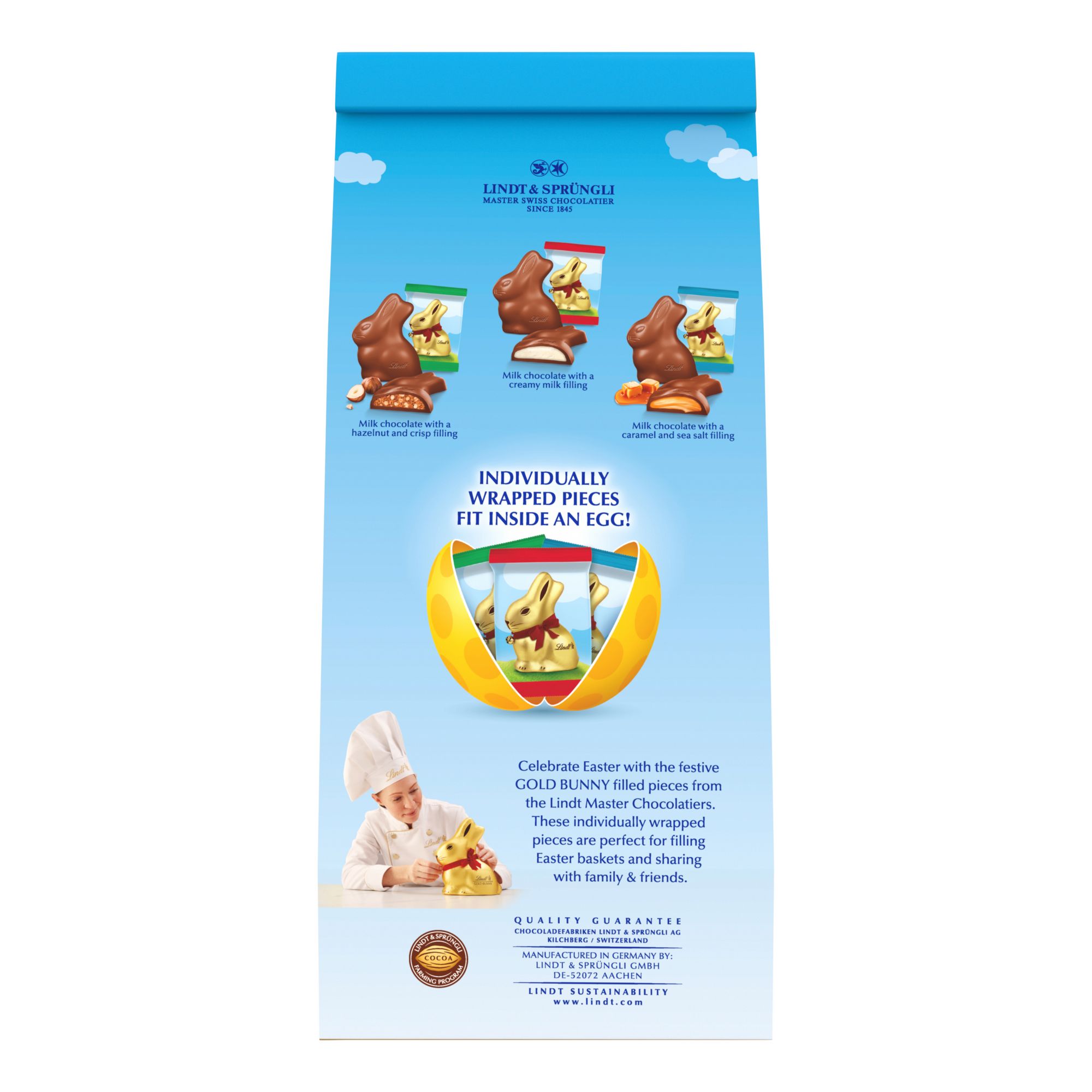 Includes individually wrapped milk chocolate, hazelnut and salted caramel bunny shapes, 15.2 oz.