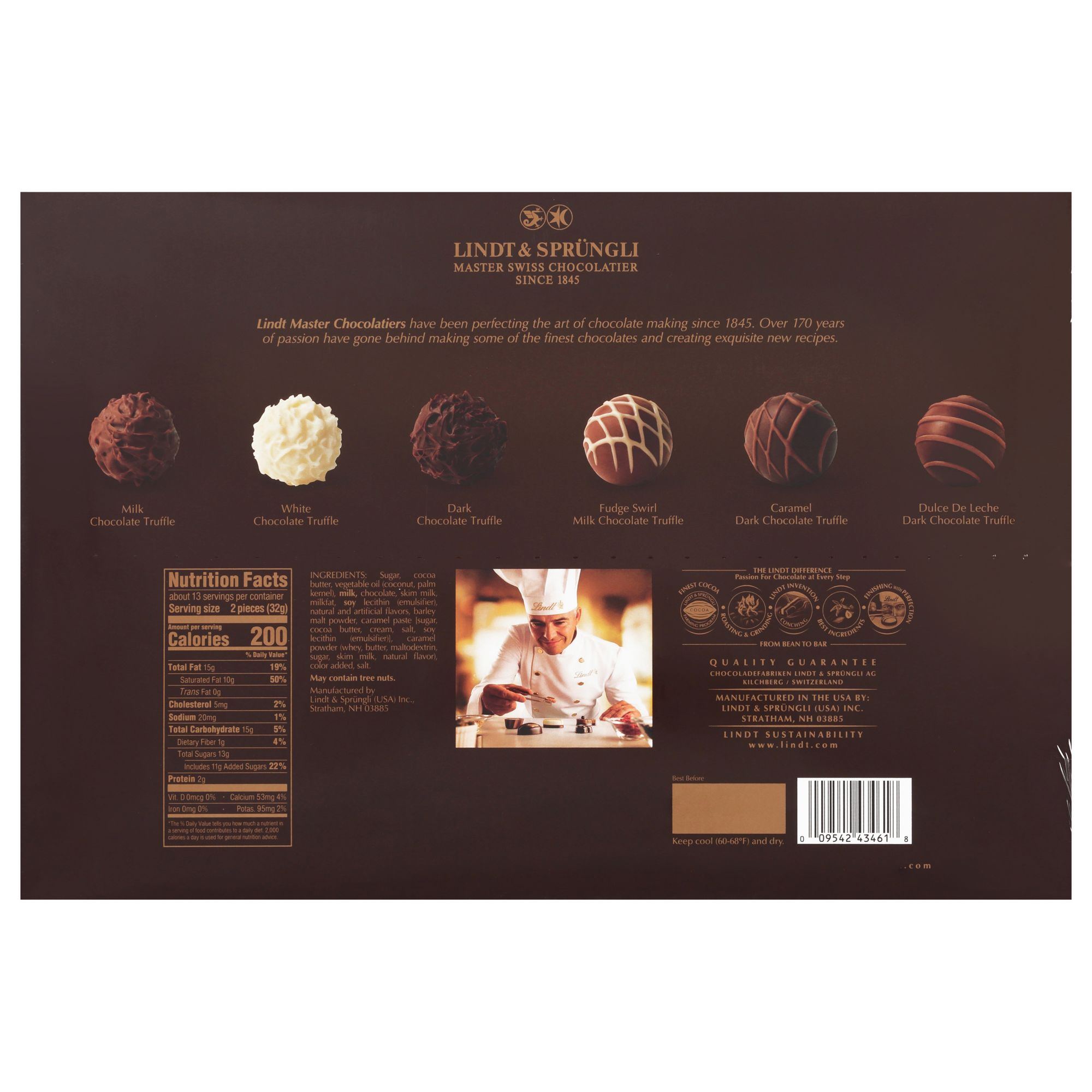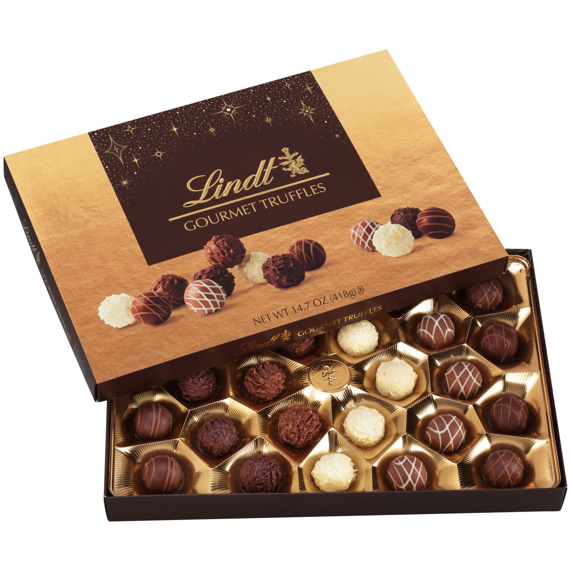 Assorted chocolate truffles in dark chocolate, milk chocolate, white chocolate, fudge swirl and caramel dark chocolate varieties Gourmet chocolates are perfect for gifting and sharing with others Gift box packaging makes these chocolates ready-to-give Lindt chocolate embodies the passion and expert craftsmanship of Lindt master chocolatiers, delivering a unique chocolate experience that offers a distinctly smooth and rich gourmet taste Includes 14.7 oz. of Lindt gourmet chocolate truffles gift box