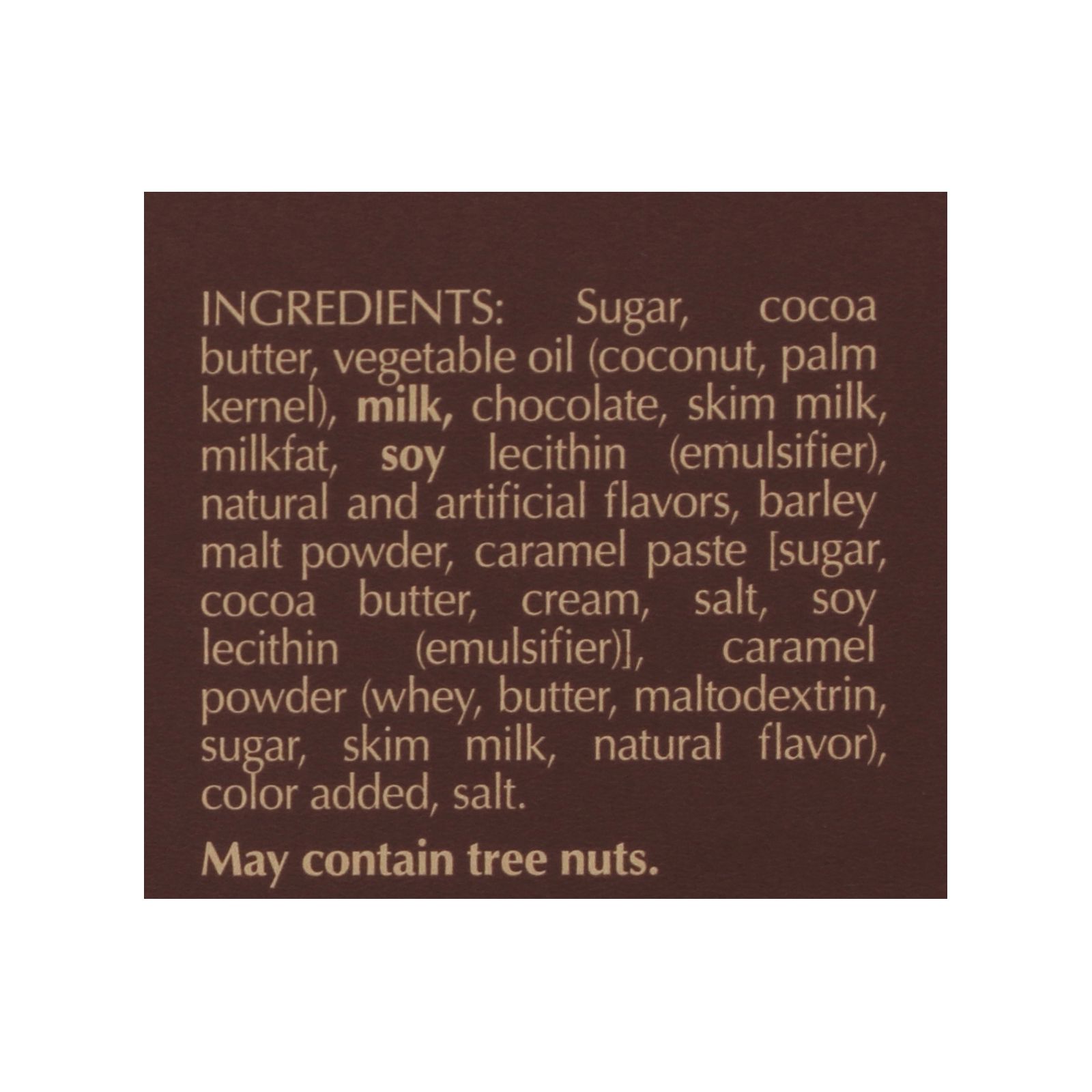 Sugar, Cocoa Butter, Vegetable Oil (Coconut, Palm Kernel), Milk, Chocolate, Skim Milk, Milkfat, Soy Lecithin (Emulsifier), Natural and Artificial Flavors, Barley Malt Powder, Caramel Paste [Sugar, Cocoa Butter, Cream, Salt, Soy Lecithin (Emulsifier)], Caramel Powder (Whey, Butter, Maltodextrin, Sugar, Skim Milk, Natural Flavor), Color Added, Salt