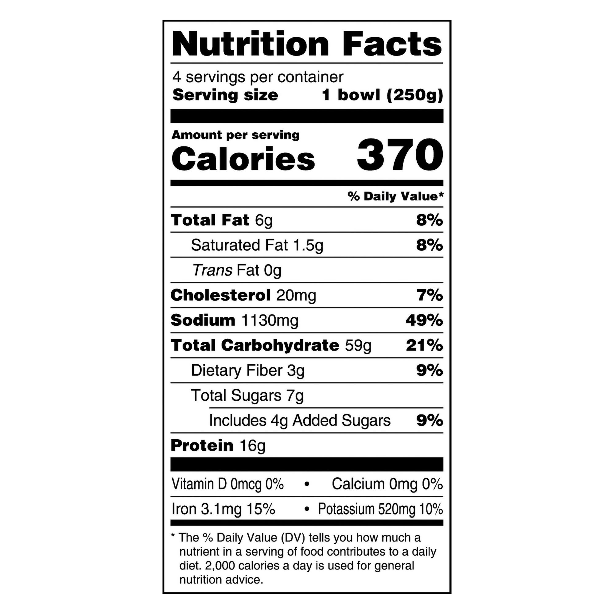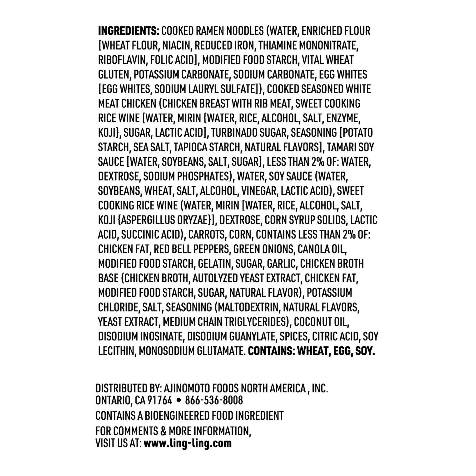 Ingredients: Ramen Noodles, Modified Food Starch, Wheat Starch, Salt, Egg Whites, Wheat Gluten, Potassium Carbonate, Sodium Carbonate, Xanthan Gum, Citric Acid), Cooked Seasoned Chicken Breast With Rib Meat, Water, Turbinado Sugar, Less Than 2% Soy Sauce [Water, Wheat, Soybeans, Salt], Tapioca Starch, Soybean Oil, Sea Salt, Natural Flavoring), Water, Soy Sauce (Water, Wheat, Soybeans, Salt), Mirin (Water, Mirin [Water, Rice, Alcohol, Salt, Enzymes, Koji], Dextrose, Corn Syrup Solids, Lactic And Succinic Acid), Carrots, Corn, Contains Less than 2% of: Red Bell Pepper, Green Onion, Garlic, Chicken Fat, Gelatin, Modified Food Starch, Chicken Broth Base (Chicken Broth, Autolyzed Yeast Extract, Chicken Fat, Modified Food Starch, Sugar, Natural Flavor), Coconut Oil, Spice, Disodium Inosinate and Guanylate, Canola Oil, Soy Lecithin, Sugar, Salt. Contains: Wheat, Egg, Soy, Treenut (Coconut).