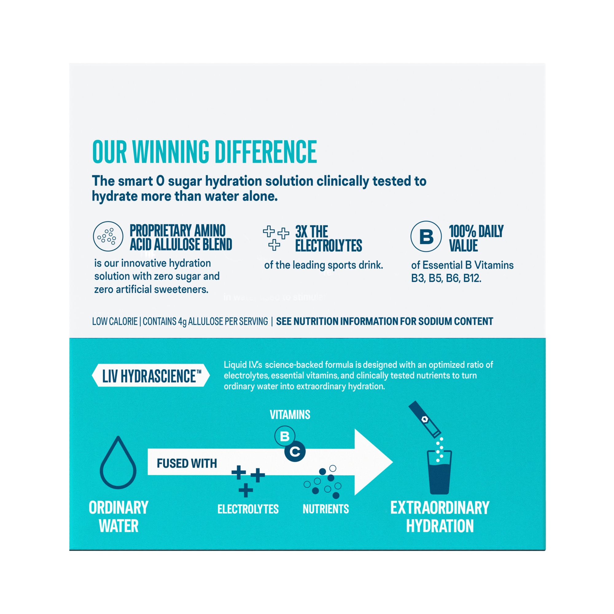 Hydration Multiplier Sugar-Free is a great-tasting, non-GMO electrolyte drink mix powered by a proprietary Amino Acid Allulose Blend to hydrate better than water alone with 0 sugar and 0 artificial sweeteners. One stick contains three times the electrolytes of the leading sports drink with eight vitamins and nutrients for faster hydration and everyday wellness. Liquid I.V. products use smart hydration technology to hydrate better than water alone, through multiple modes of transport. LIV Hydrascience is the delivery system, used in Hydration Multiplier, designed to enhance rapid absorption of water and other key ingredients into your body. The Amino Acid Allulose Blend is our latest smart hydration solution, used in Hydration Multiplier Sugar-Free, that hydrates more effectively than water alone with zero sugar. Enjoy the taste of luscious white peach and a blend of freshly picked ripe strawberries topped with decadent notes of whipped cream and refreshing, crisp watermelon.