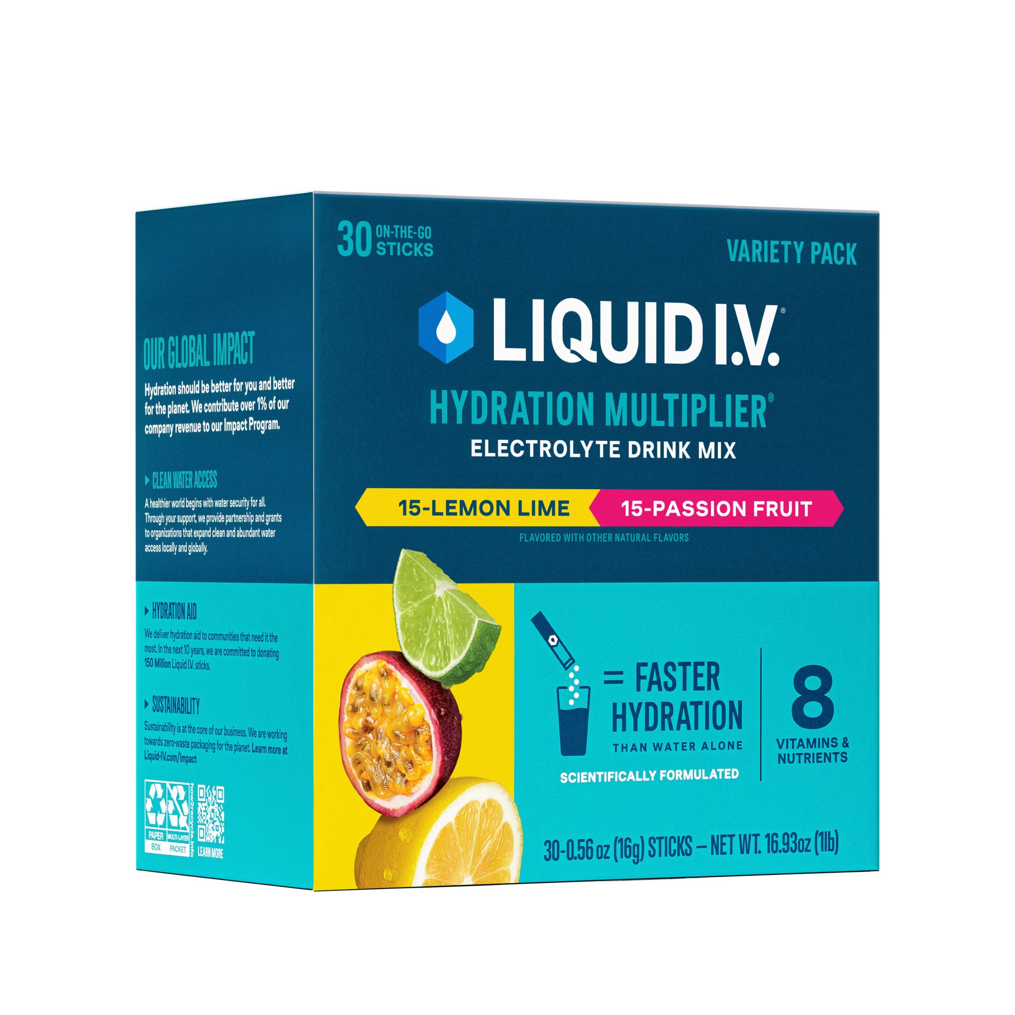 Liquid I.V. Hydration Multiplier is a great-tasting electrolyte drink powder that hydrates faster than water alone. One stick contains 3x the electrolytes of the leading sports drink with 8 vitamins and nutrients for faster hydration and everyday wellness. Liquid I.V.’s science-backed formula is designed with an optimized ratio of electrolytes, essential vitamins, and clinically tested nutrients to turn ordinary water into extraordinary hydration. Lemon Lime is the flavor that started it all! This sunny mix of citrus flavors is equal parts zesty and refreshing - an instant fan favorite. Passion Fruit is an invigorating flavor, inspired by the Hawaiian lilikoi, has hints of honey and berry, and brings to mind white sand beaches and clear blue water. Liquid I.V. believes equitable access to clean and abundant water is the foundation of a healthier world. They prioritize partnerships with leading water, humanitarian, and community-based organizations to fund and foster innovative solutions to help communities protect both their water and their futures.