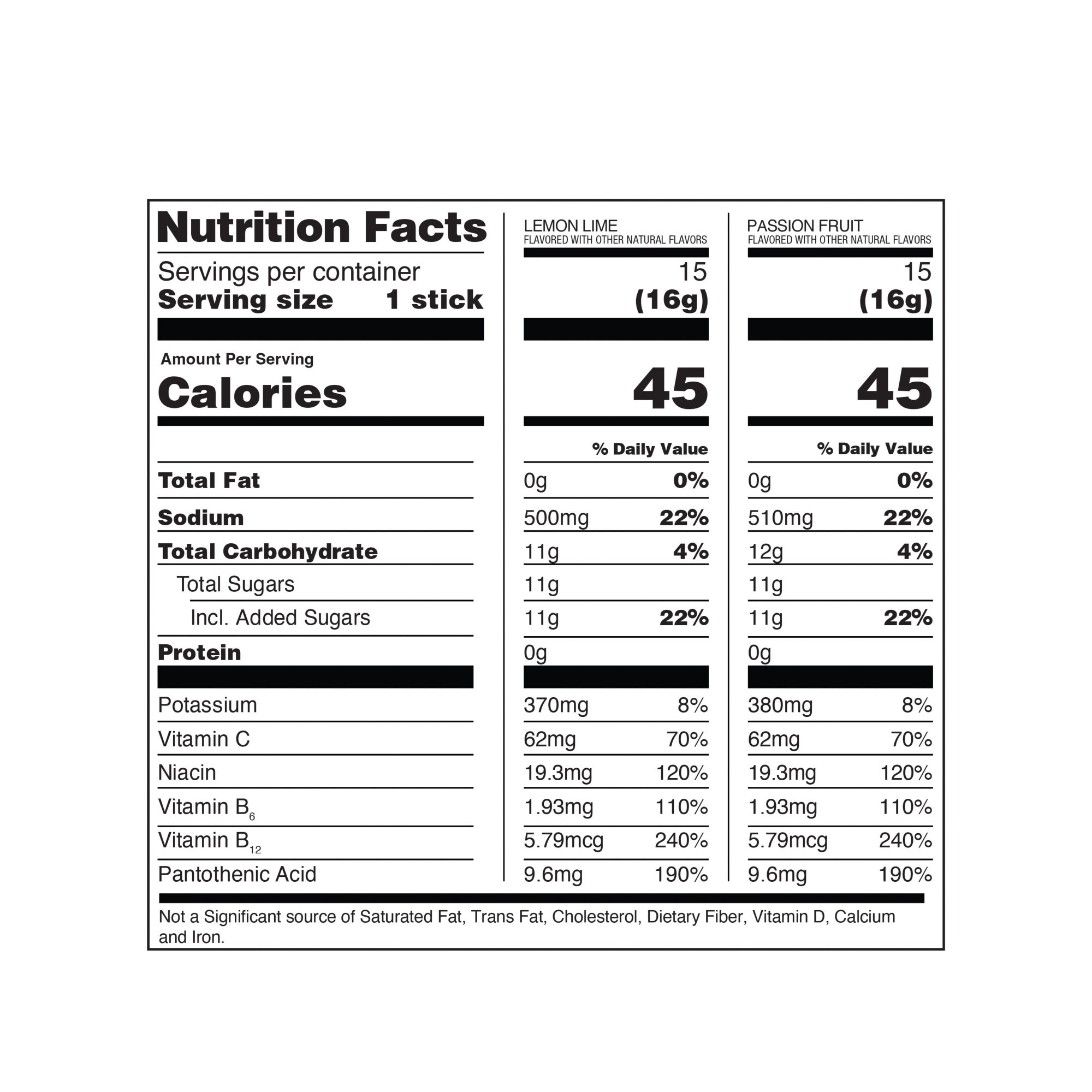 Ingredients: Lemon Lime - Pure Cane Sugar, Dextrose, Citric Acid, Salt, Potassium Citrate, Sodium Citrate, Dipotassium Phosphate, Silicon Dioxide, Rebaudioside-A (Stevia Leaf Extract), Natural Flavor, Vitamin C (Ascorbic Acid), Vitamin B3 (Niacinamide), Vitamin B5 (D-Calcium Pantothenate), Vitamin B6 (Pyridoxine Hydrochloride), Vitamin B12 (Cyanocobalamin). Passion Fruit - Pure Cane Sugar, Dextrose, Citric Acid, Salt, Potassium Citrate, Sodium Citrate, Dipotassium Phosphate, Silicon Dioxide, Rebaudioside-A (Stevia Leaf Extract), Vitamin C (Ascorbic Acid), Vitamin B3 (Niacinamide), Vitamin B5 (D-Calcium Pantothenate), Vitamin B6 (Pyridoxine Hydrochloride), Natural Flavor, Vitamin B12 (Cyanocobalamin).