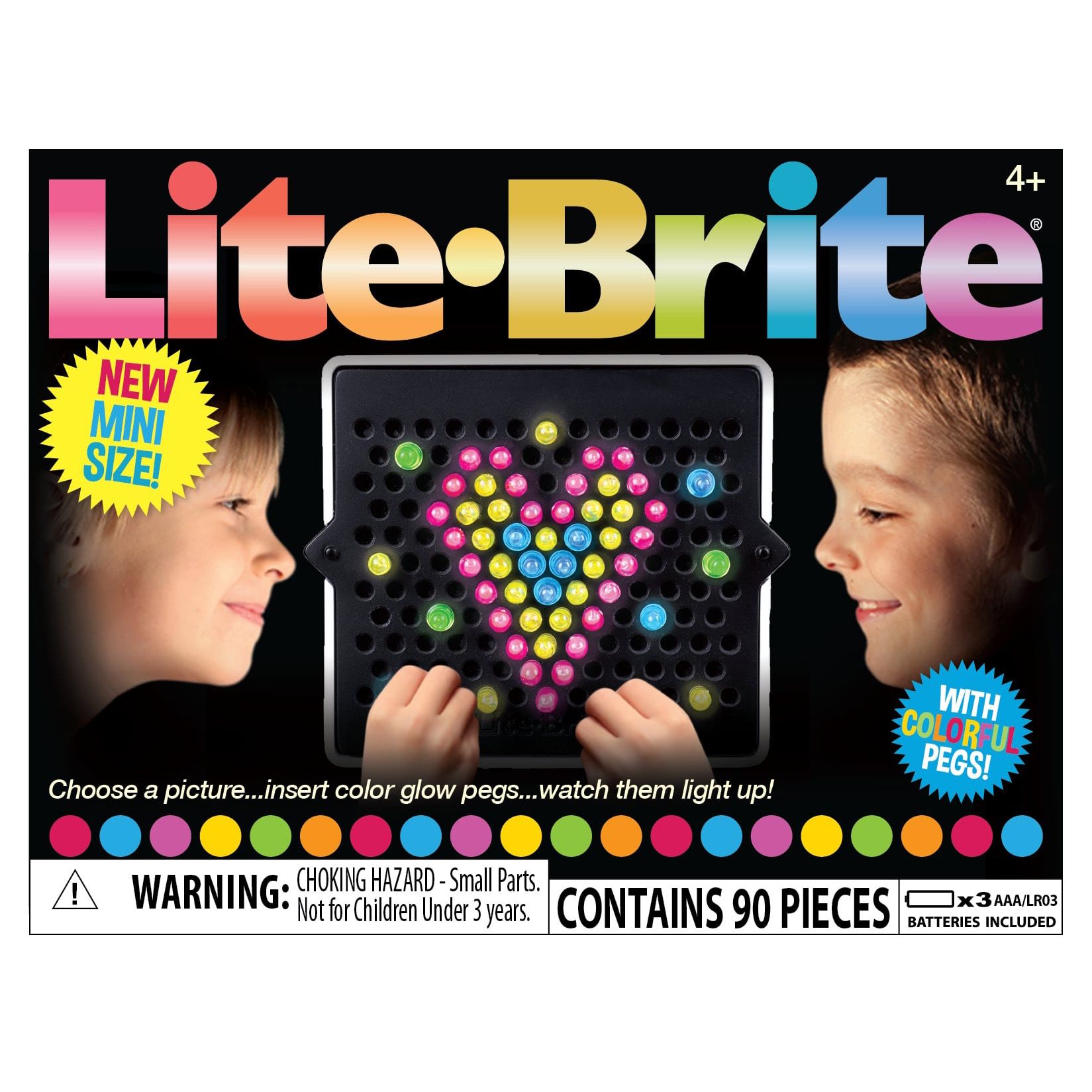 Each Lite-Brite Mini comes with 85 colorful mini-pegs that you can use to create your art. Turn on your Lite-Brite Mini and watch as the battery-powered LED bulbs light up your artwork