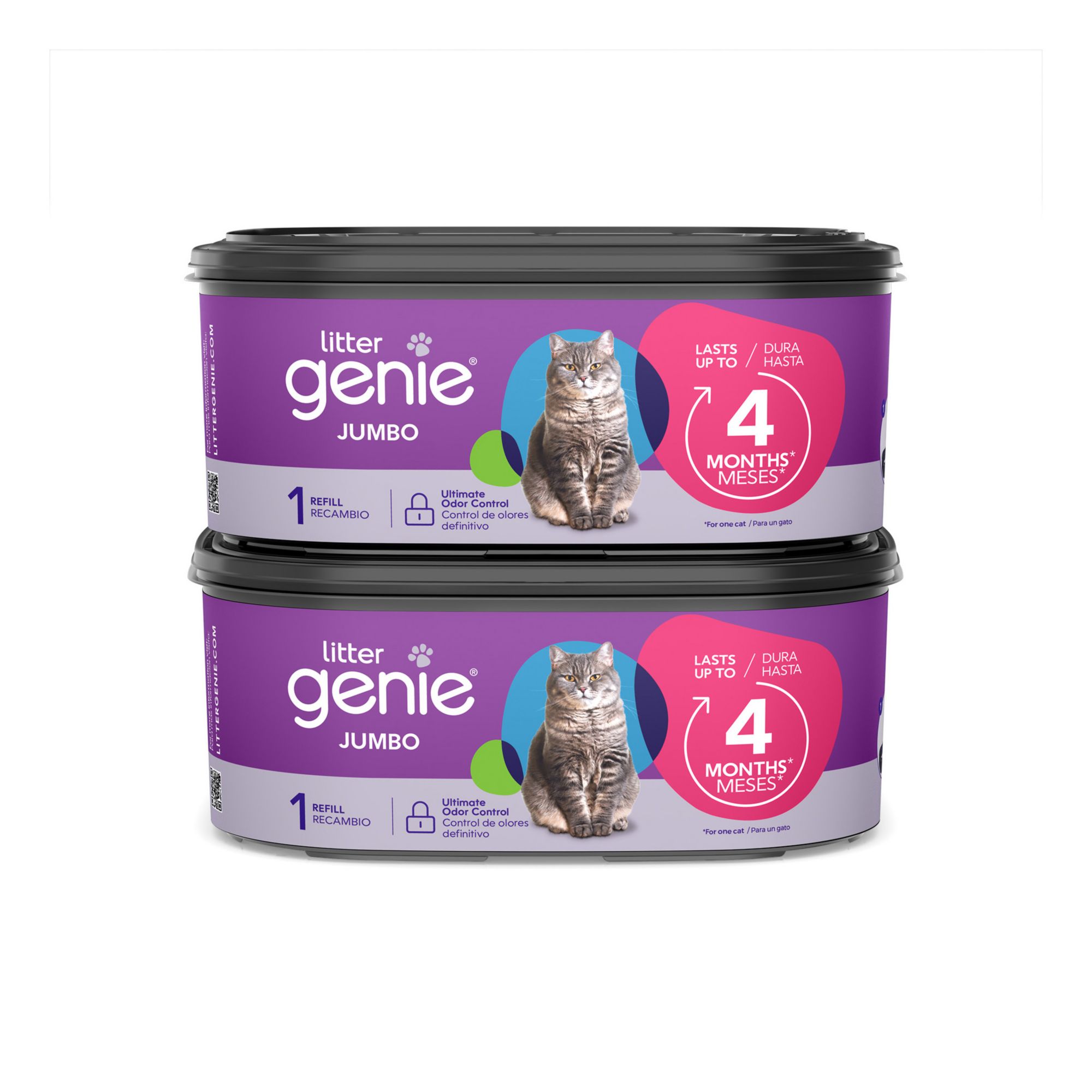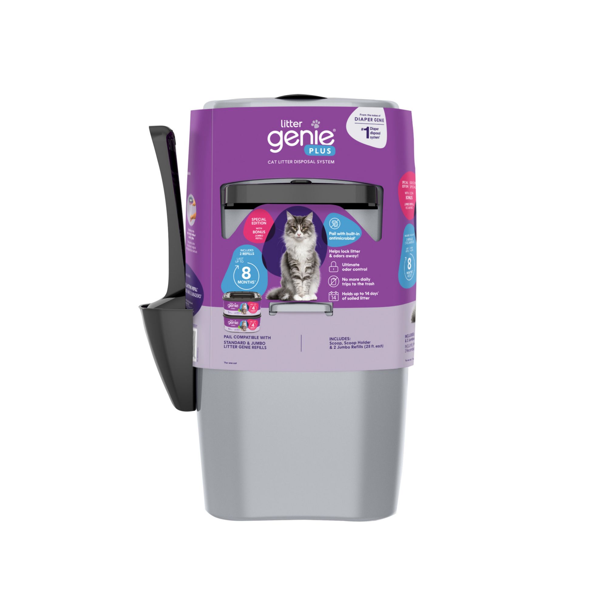 Exclusively at BJ's Ultimate odor control - The Plus Pail features a built-in antimicrobial to inhibit bacteria growth and comes with a multi-layer refill bag with odor-locking barrier technology that prevents odor from escaping Effortless clean up - No more daily trip to the trash; the pail holds up to 14 days of cat litter (for one cat) and the included refills last up to 8 months, so you can spend more time playing with your kitty Flexible - the included refill contains continuous film, allowing you to cut and tie it to any length A perfect fit – The compact design is ideal for small spaces and homes with multiple litter boxes A fresher home in 3 easy steps - Scoop clumps from the litter box, open the lid and drop the clumps, and pull the handle to lock away litter and odors Compatible With: Litter Genie Standard Square Refills and Jumbo refills Includes Litter Genie pail, two jumbo refills, scoop & scoop holder