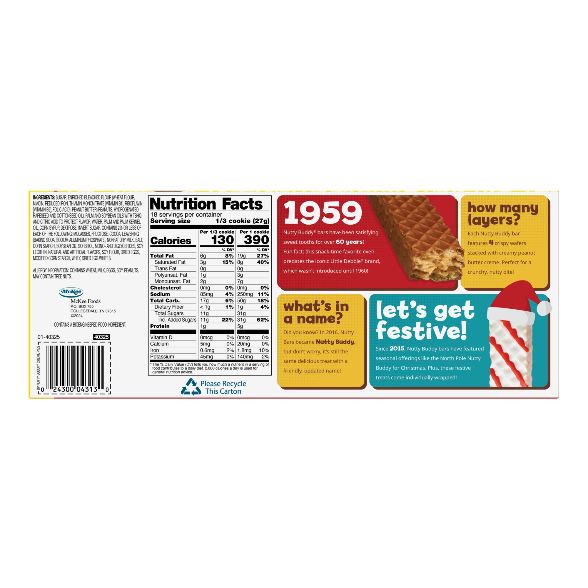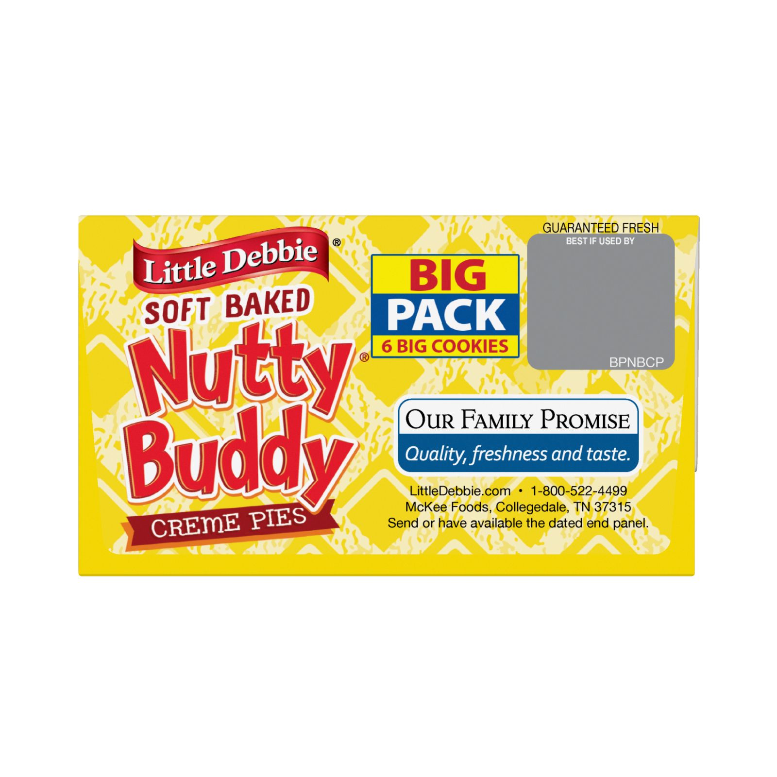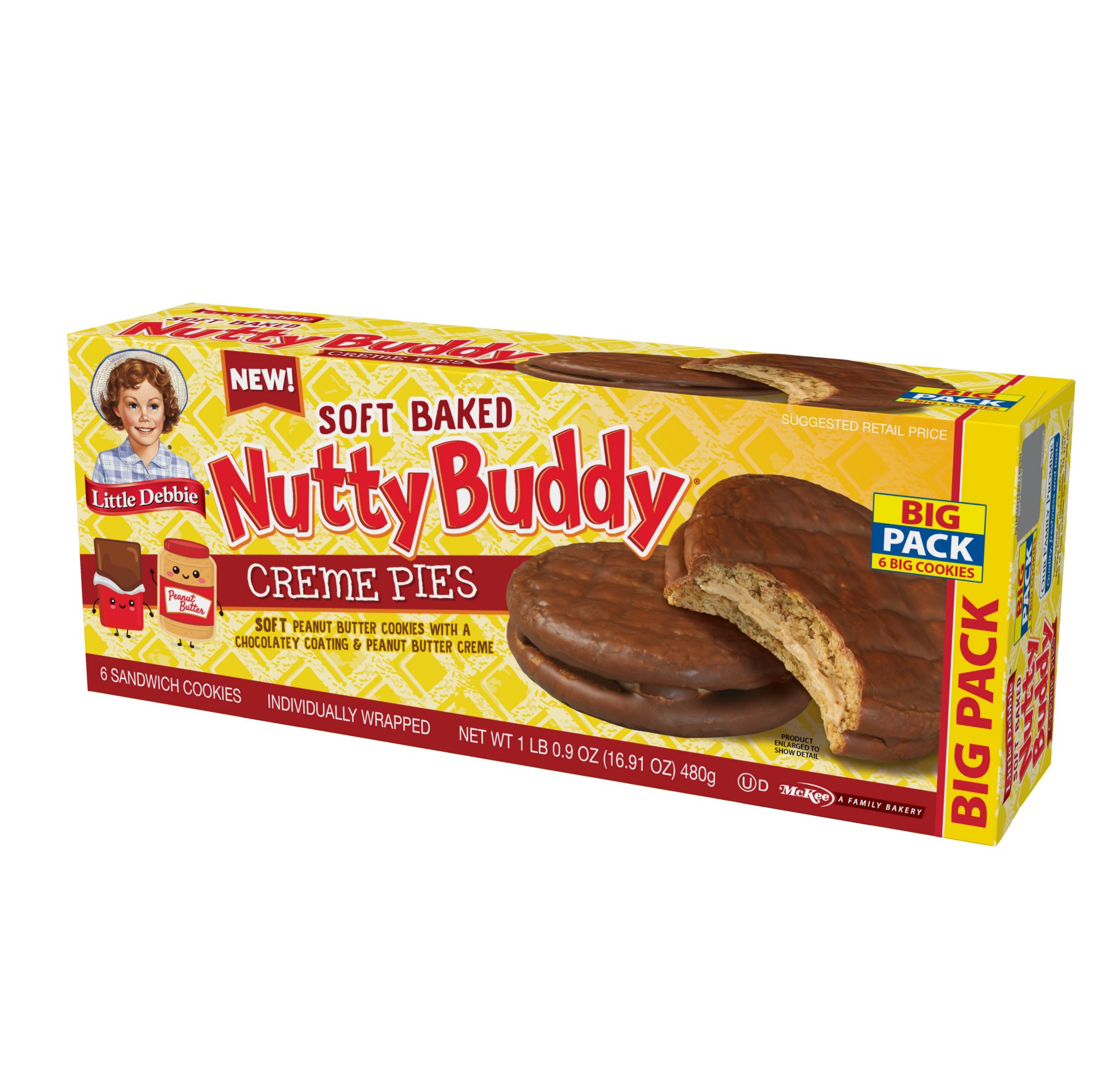 All the peanut buttery, chocolatey goodness of Nutty Buddy wafer bars is now available in an scrumptiously soft, chewy sandwich cookie! With six individually wrapped cookies per Big Pack carton, new Nutty Buddy Creme Pies are the perfect choice for those looking to enjoy this classic Little Debbie brand treat in a whole new way!