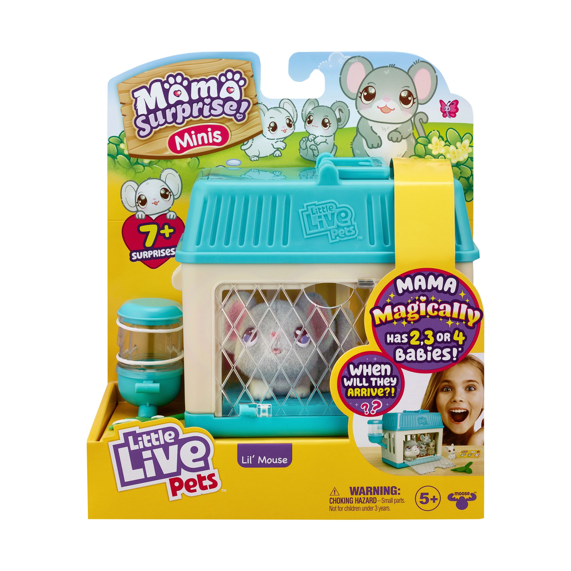 Little Live Pets Mama Surprise takes caring for your pet to a whole new level and now it's available in a mini format for everyone to be amazed. This Mama Surprise Mini comes as a Lil' Mama. She is going to be a Mama… But when? Feed Mama with the celery and her eyes will close. Then place her on top of the paper straw in the mini hutch and close the door. Don’t forget to remove the lock on the side of the hutch. Fill the water bottle and watch as the water disappears. She's ready to magically have two, three or four babies. You’ll be so surprised at who arrives. When will they arrive? There are up to four adorable baby mice to discover with sweet little unique poses. They even come with surprise accessories for the babies to wear - a bow or a bib so kids can dress their babies up. Also included is a birth certificate to fill out. This magical experience is repeatable, so that kids can go through the surprise and delight of caring for Mama and discovering her babies, again and again.