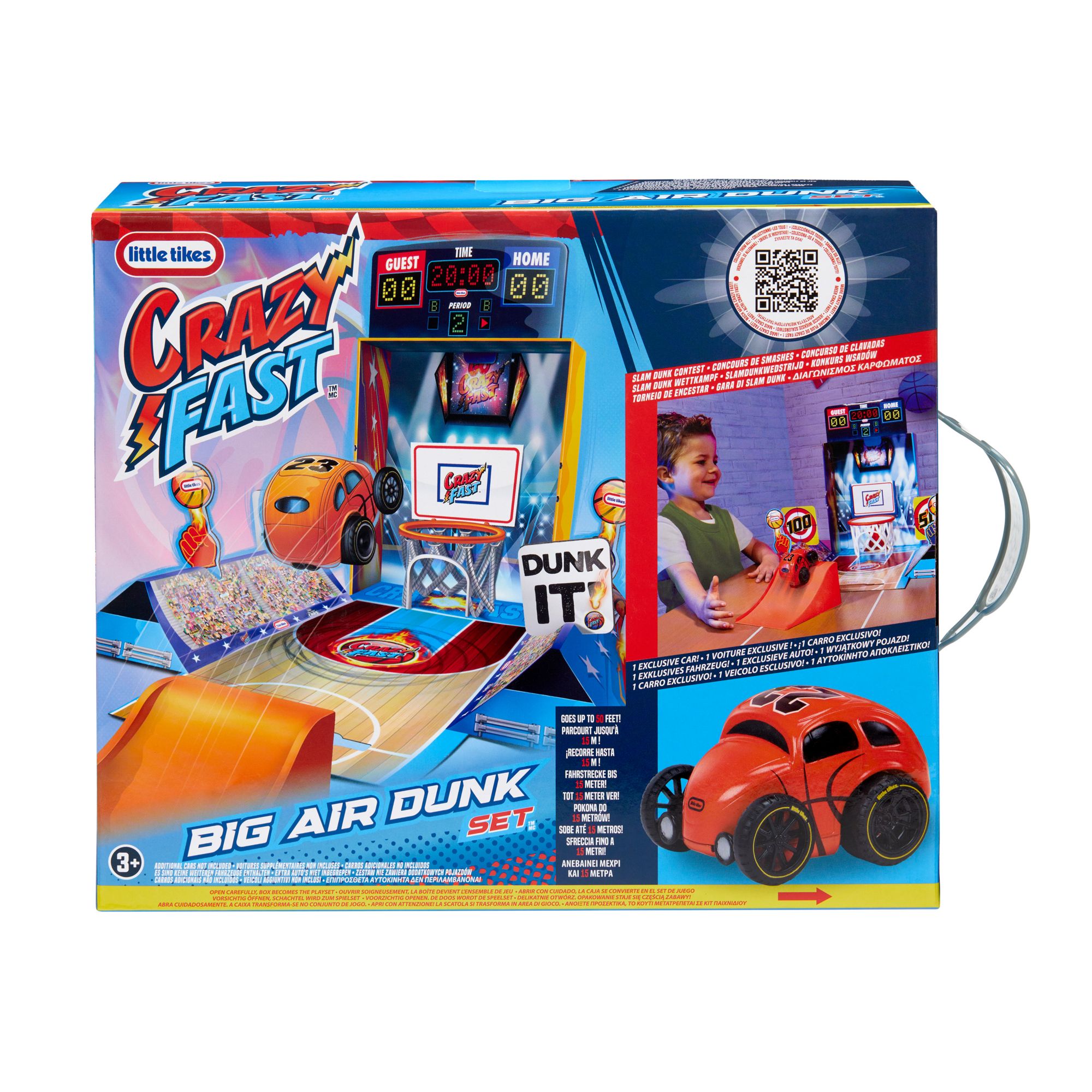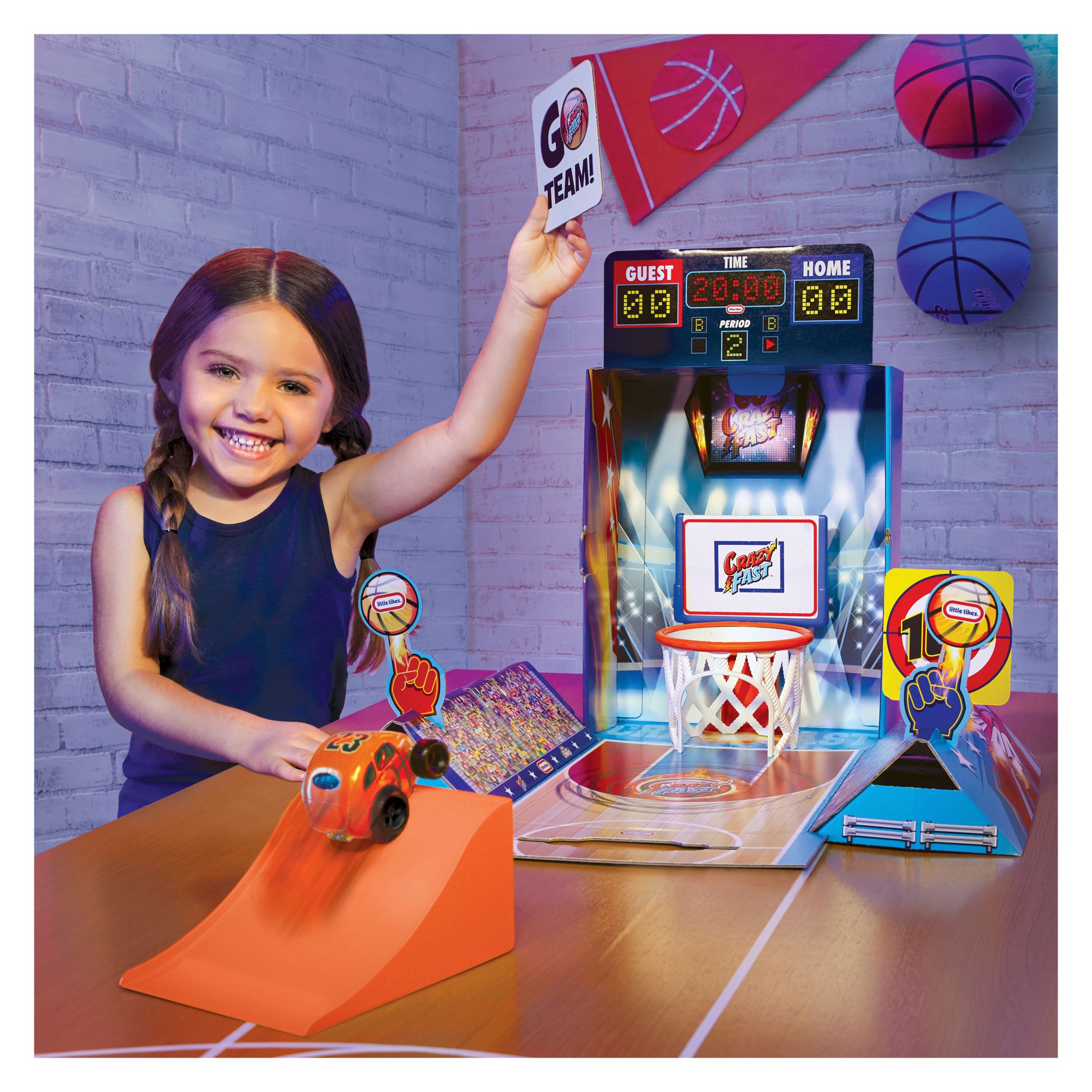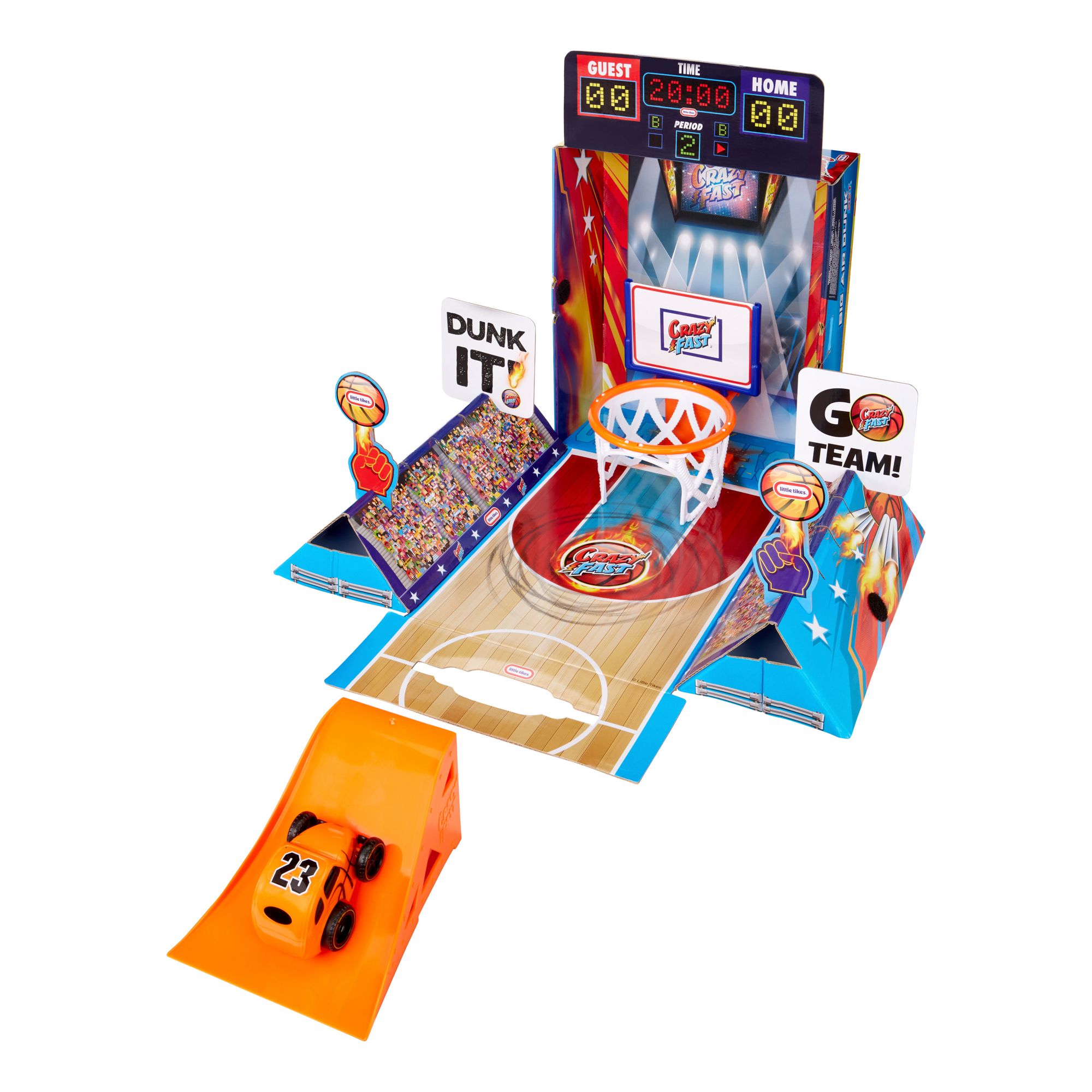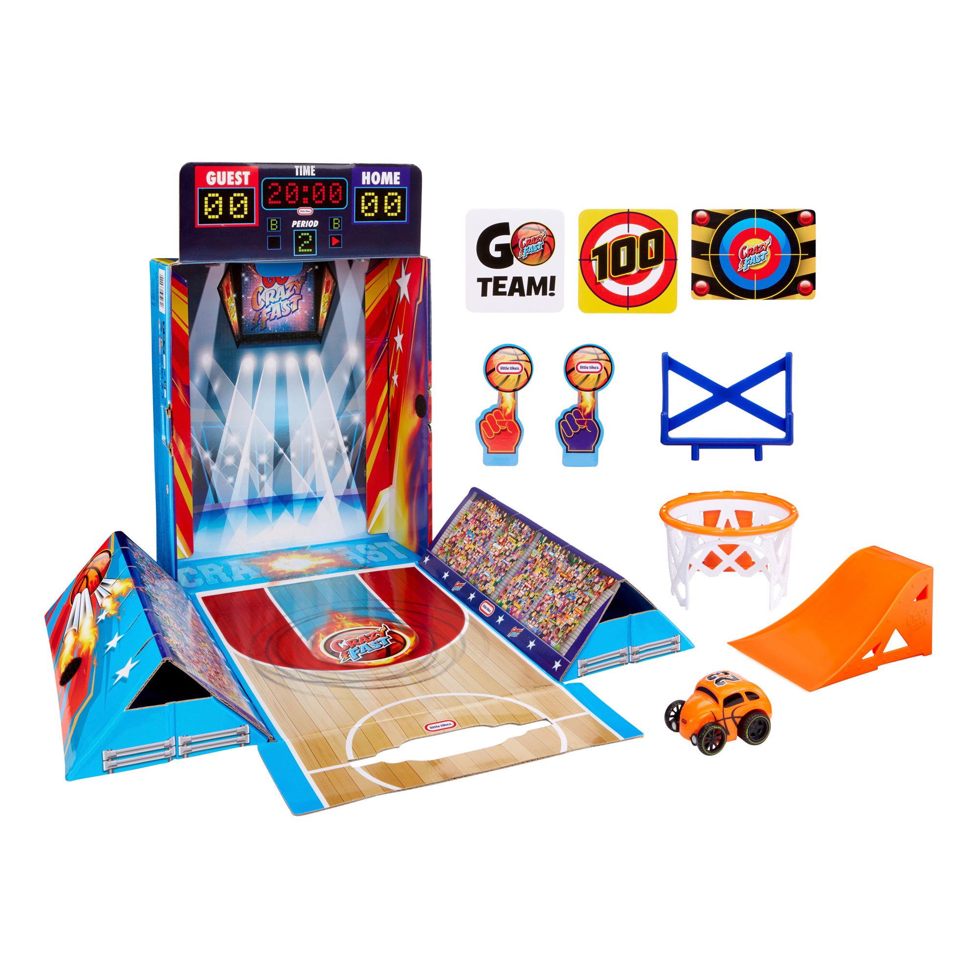Includes crazy fast car, flip ramp, basketball hoop