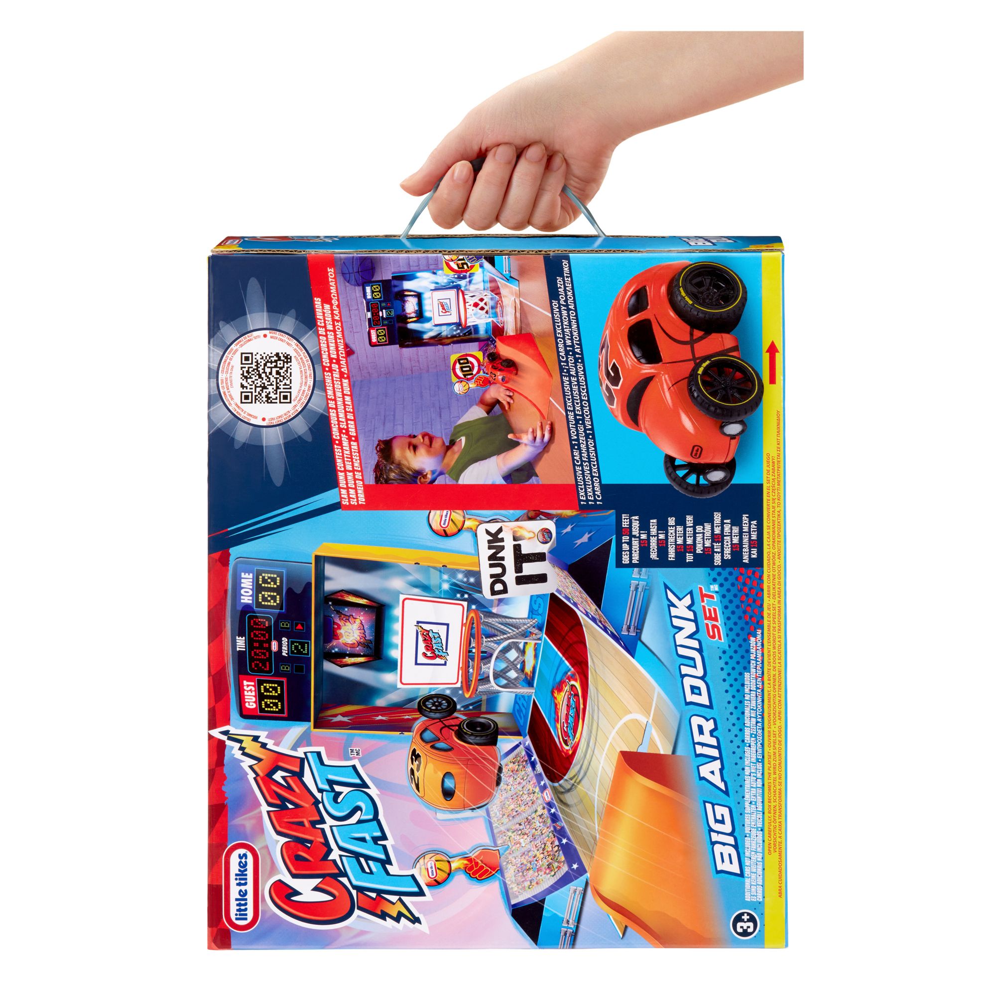 Let 'em race and play hoops with the Crazy Fast Big Air Dunk. Have a slam dunk contest and show off your all-star moves. The special ramp will launch your car into fancy flipping and flying maneuvers. Set-up is easy, thanks to the sturdy packaging that becomes part of the playset. Use it for multiple stunts, dunks, and tricks.