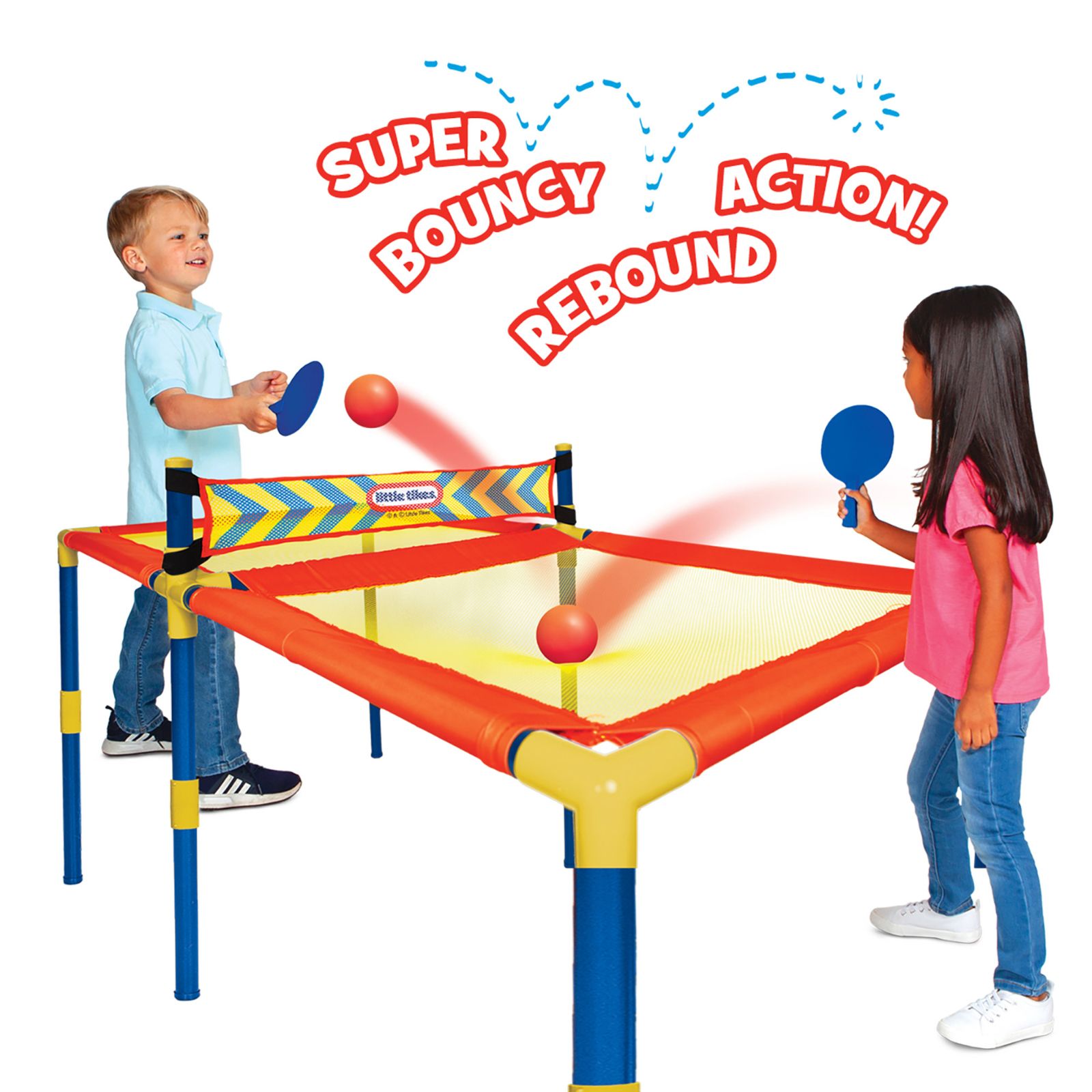 Great Family fun with the Little Tikes Super bouncy Rebound Tennis. Quick and easy setup. Two ways to play - 1 player or 2. It comes with two paddles and two balls. Stretch tech table. Easily converts to a single player. Set up size: 24"D x 50"W x 31"H (with net).