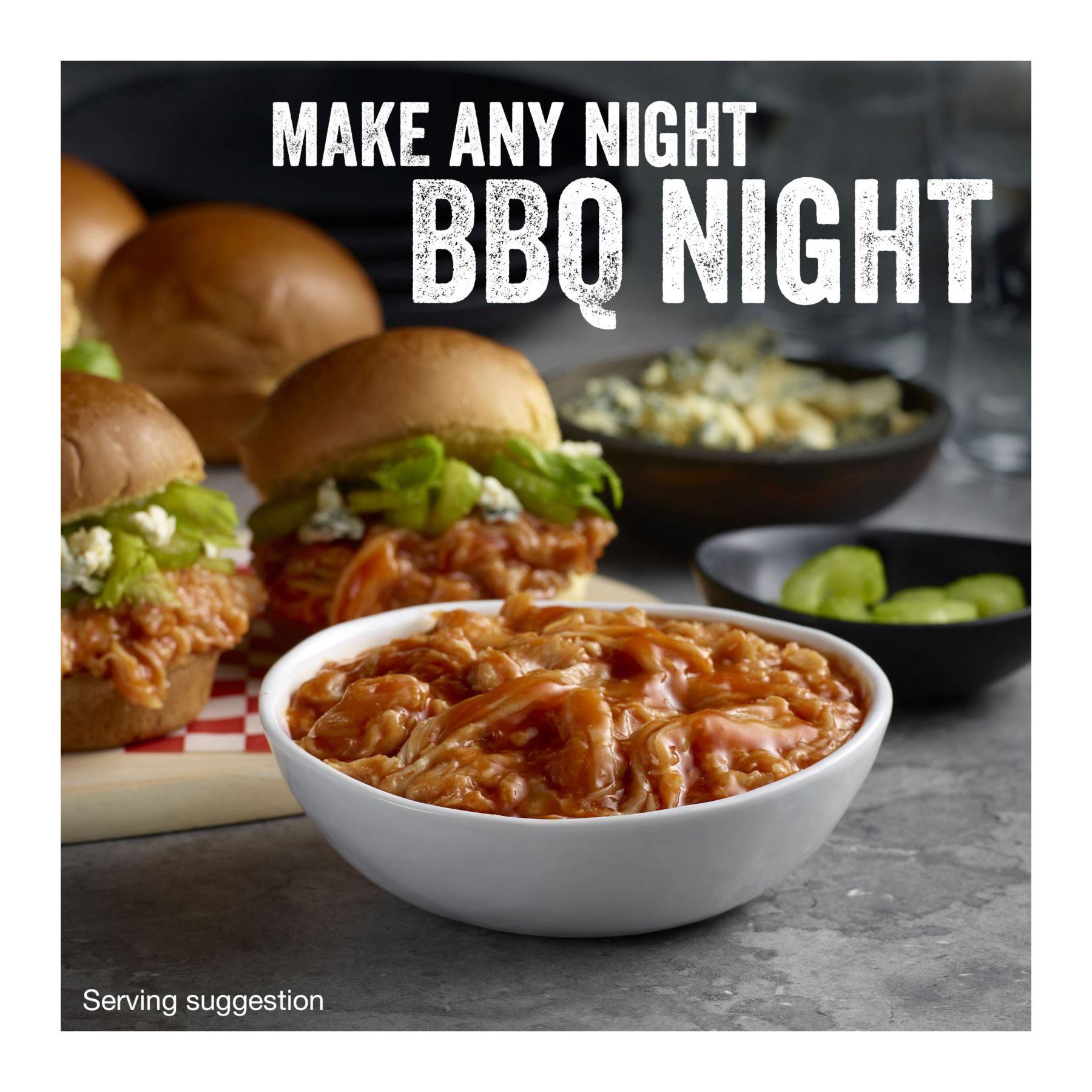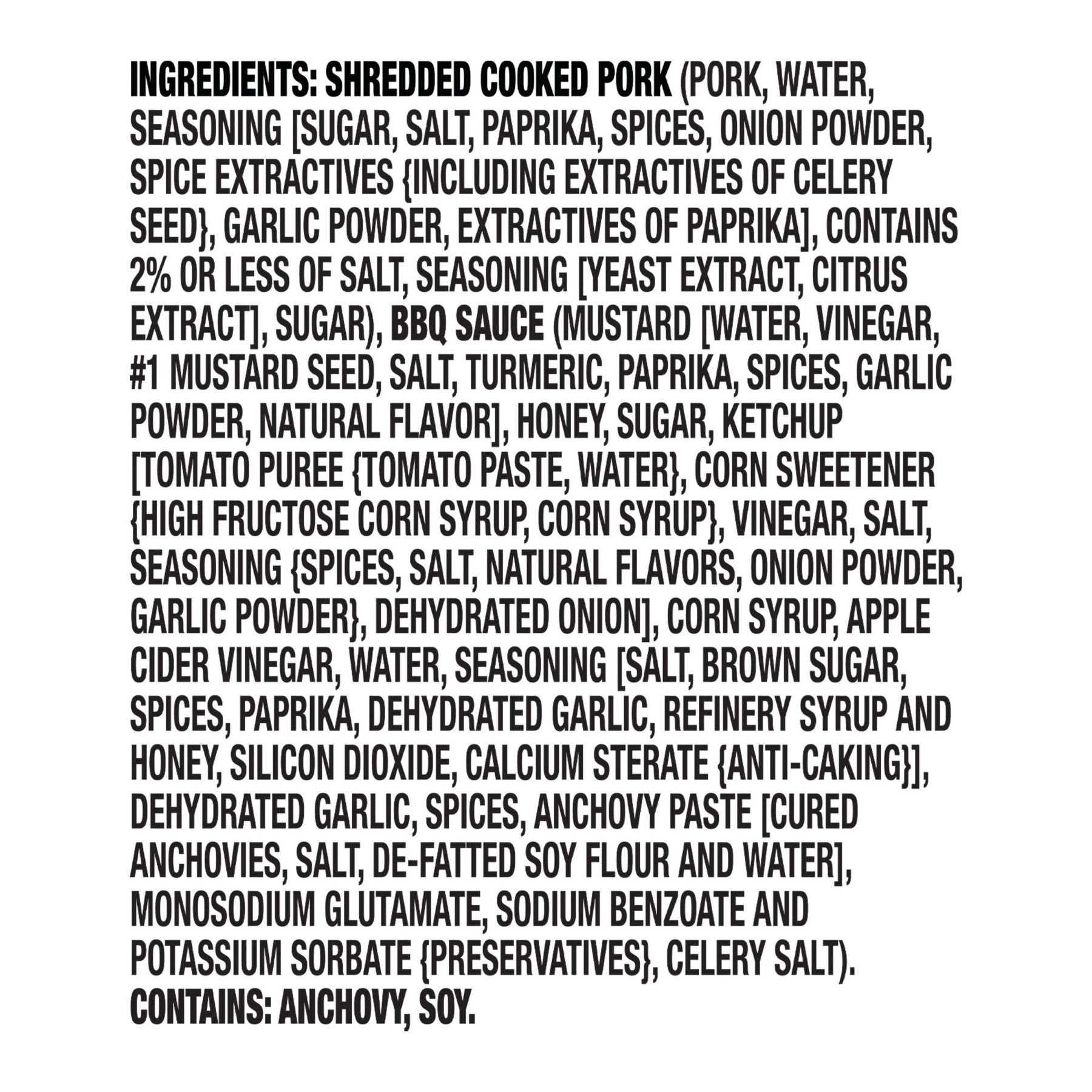 Ingredients:Shredded Cooked Pork (Pork, Water, Seasoning [sugar, Salt, Paprika, Spices, Onion Powder, Spice Extractives {including Extractives Of Celery Seed}, Garlic Powder, Extractives Of Paprika], Contains 2% Or Less Of Salt, Seasoning [yeast Extract, Citrus Extract], Sugar), Bbq Sauce (Mustard [water, Vinegar, #1 Mustard Seed, Salt, Turmeric, Paprika, Spices, Garlic Powder, Natural Flavor], Honey, Sugar, Ketchup [tomato Puree {tomato Paste, Water}, Corn Sweetener {high Fructose Corn Syrup, Corn Syrup}, Vinegar, Salt, Seasoning {spices, Salt, Natural Flavors, Onion Powder, Garlic Powder}, Dehydrated Onion], Corn Syrup, Apple Cider Vinegar, Water, Seasoning [salt, Brown Sugar, Spices, Paprika, Dehydrated Garlic, Refinery Syrup And Honey, Silicon Dioxide, Calcium Sterate {anti-caking}], Dehydrated Garlic, Spices, Anchovy Paste [cured Anchovies, Salt, De-fatted Soy Flour And Water], Monosodium Glutamate, Sodium Benzoate And Potassium Sorbate {preservatives}, Celery Salt).
