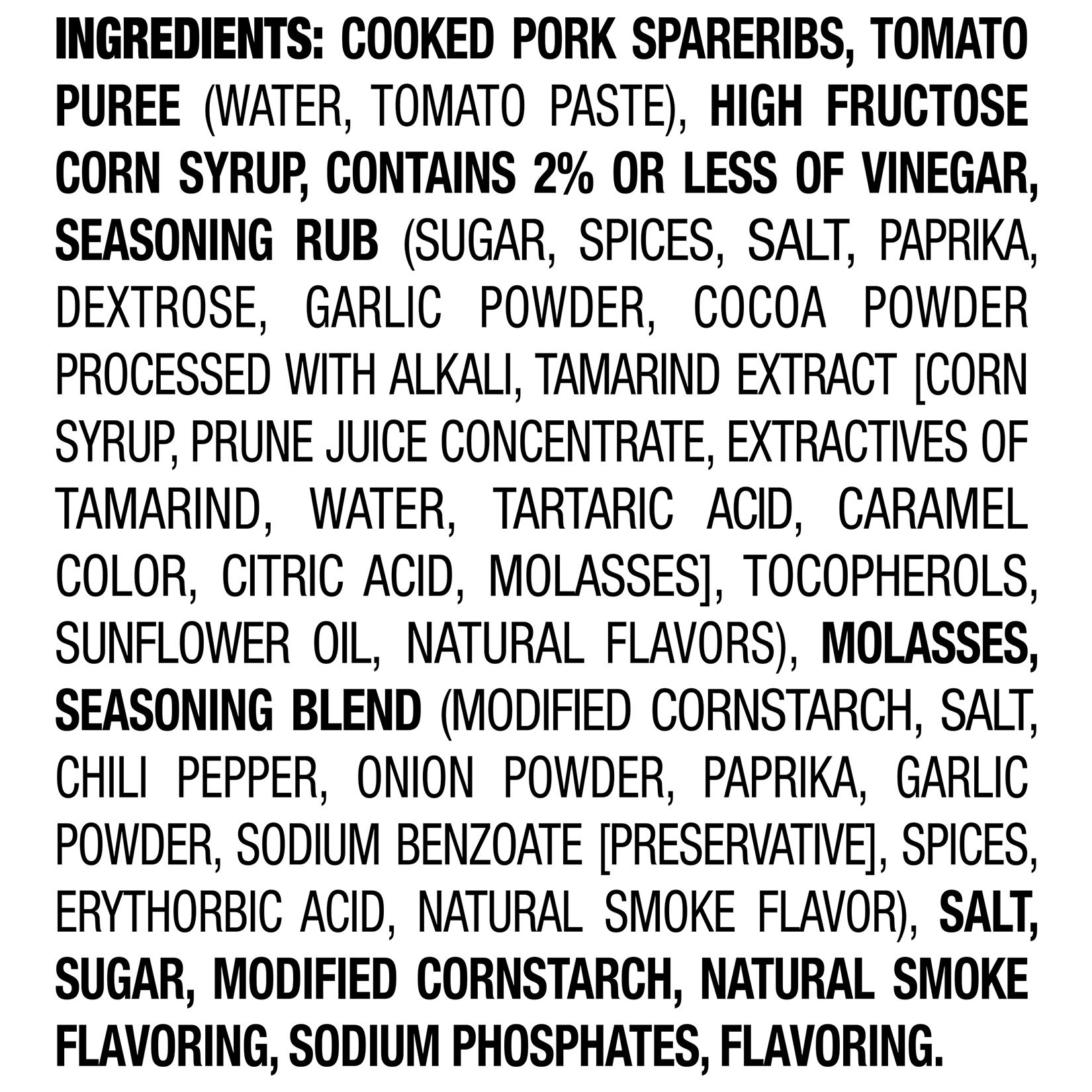Fully Cooked Ingredients: Cooked Pork Spareribs, Tomato Puree (Water, Tomato Paste), High Fructose Corn Syrup, Contains 2% or less of Vinegar, Seasoning Rub (Sugar, Spices, Salt, Paprika, Dextrose, Garlic Powder, Cocoa Powder Processed With Alkali, Tamarind Extract (Corn Syrup, Prune Juice Concentrate, Extractives of Tamarind, Water, Tartaric Acid, Caramel Color, Citric Acid, Molasses), Tocopherols, Sunflower Oil, Natural Flavors), Molasses, Seasoning Blend (Modified Cornstarch, Salt, Chili Pepper, Onion Powder, Paprika, Garlic Powder, Sodium Benzoate (Preservative), Spices, Erythorbic Acid, Natural Smoke Flavor), Salt, Sugar, Modified Cornstarch, Natural Smoke Flavoring, Sodium Phosphates, Flavoring