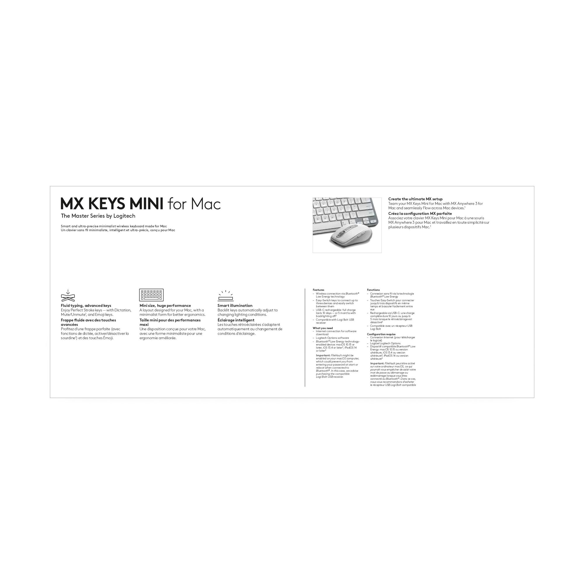 Meet MX Keys Mini Keyboard for Mac – a minimalist keyboard made for Apple creators. A smaller form factor and smarter keys result in a mightier way to create, make, and do. MX Keys Mini for Mac fits right into your Mac and iPad workflows – with a layout for Mac, so you never miss a beat. You’ll get more functionality, a superior key design, and a robust build quality in a design that blends perfectly into your Apple ecosystem. MX Keys Mini for Mac follows your Flow-enabled MX Anywhere 3 for Mac or MX Master 3 for Mac from one Apple device to another, meaning you can type on multiple devices in one fluid workflow. Smarter function (Fn) keys now gives you the power to send emojis, mute and unmute your mic, and activate talk-to-text. Proximity sensors detect your hands, illuminating the keyboard the moment your fingers approach. The backlit keys automatically adjust to lighting conditions and turn off when you step away — saving power for those moments of inspiration.