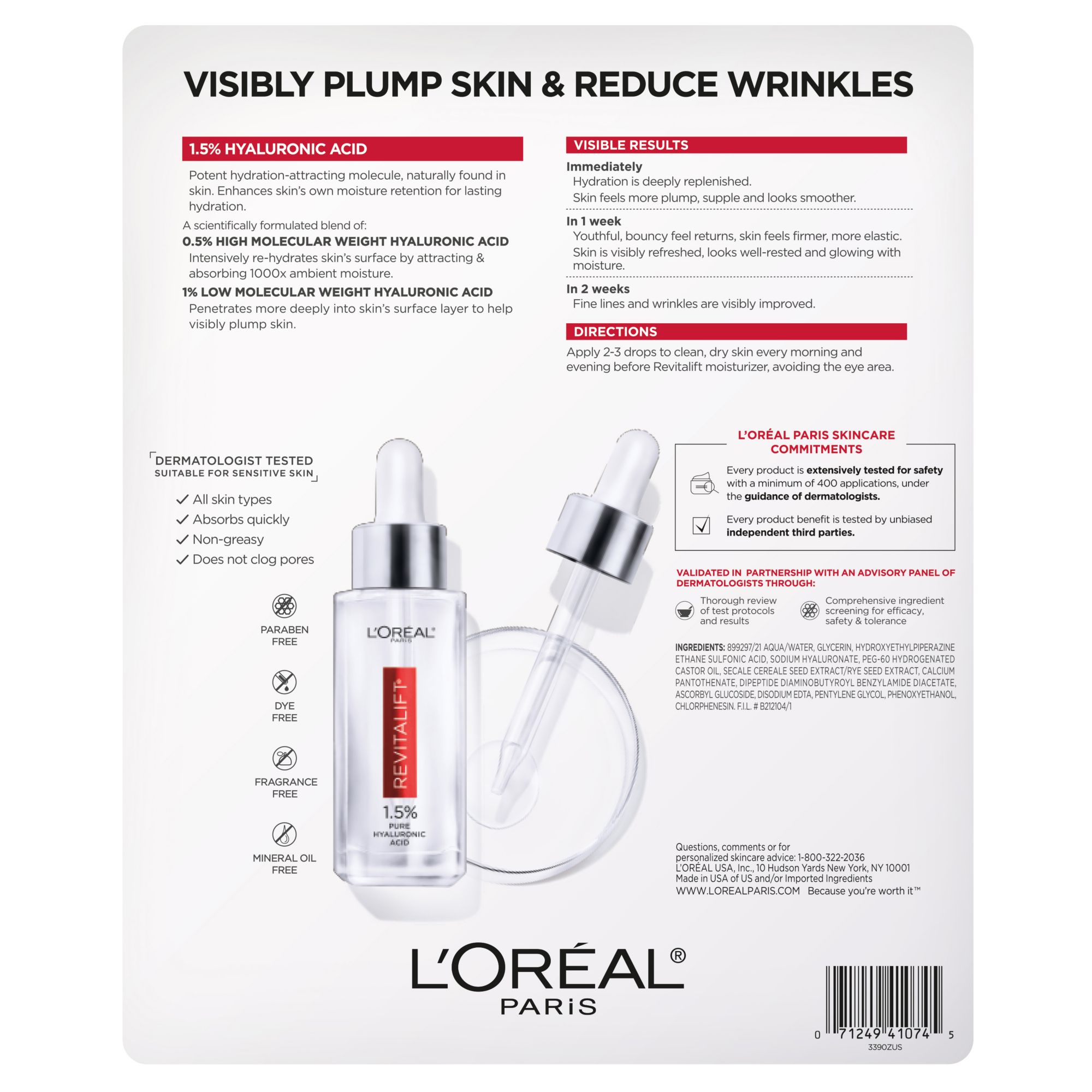 Hydrating serum that plumps skin and visibly reduces wrinkles in 1 week Formulated with 1.5% Pure Hyaluronic Acid Fragrance-free, paraben-free and does not clog pores Serum is quickly absorbed to deliver intense moisture that leaves the skin with a fully hydrated and dewy glow Try this Serum with L'Oreal Paris Triple Power Anti-Aging Moisturizer for visible anti-aging results to firm, brighten, and visibly reduce appearance of wrinkles in 1 week