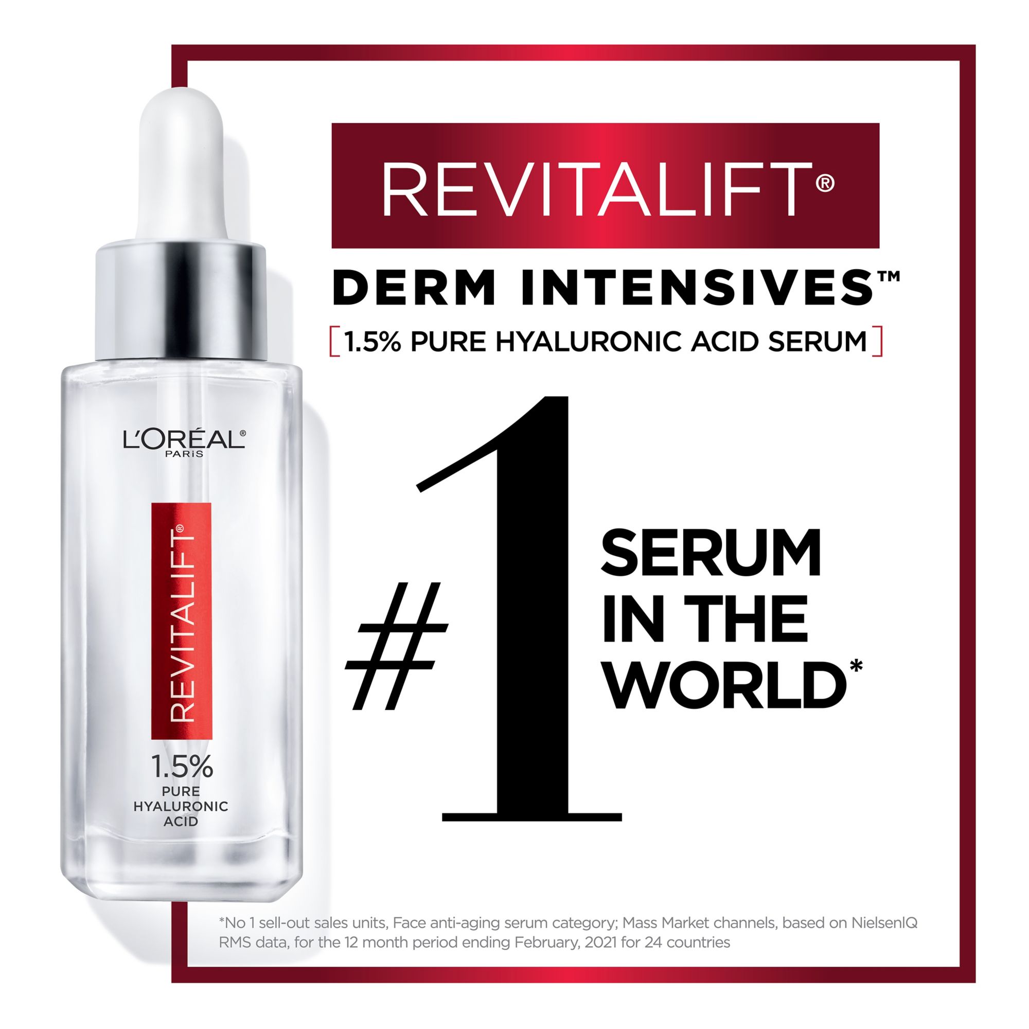 Revitalift Derm Intensives 1.5% PURE Hyaluronic Acid Serum is a potent hydrating formula with a high concentration of PURE Hyaluronic Acid. So effective, it immediately hydrates, plumps skin in 1 week, and reduces wrinkles. This replumping serum was validated by an external panel of dermatologists and is fragrance-free, paraben-free, and does not clog pores.
