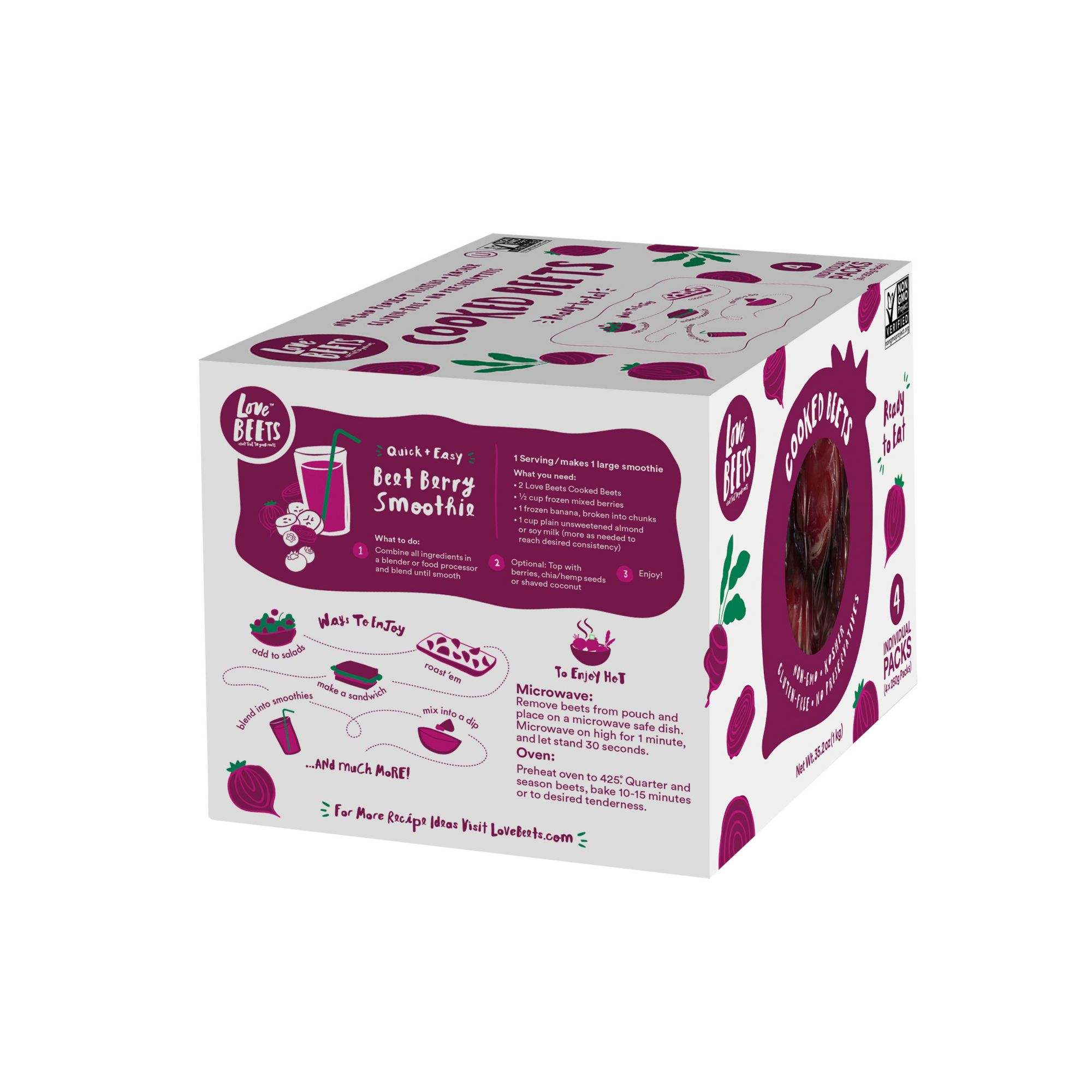 Love Beets does the work so you don't have to! Their no mess, no fuss Cooked Beets are cooked, peeled, and ready to eat! They're extremely versatile and can be enjoyed either hot or cold in a variety of dishes, from sandwiches to salads, and even smoothies, juices, and desserts. Try these deliciously simple beets in a classic beet and goat cheese salad or a beet-berry-banana smoothie! Love Beets' Cooked Beets are all-natural, non-GMO, kosher, gluten-free, vegan, have no added colors or preservatives, and are packaged in an allergen-free facility. No mess, no fuss - just delicious beets!