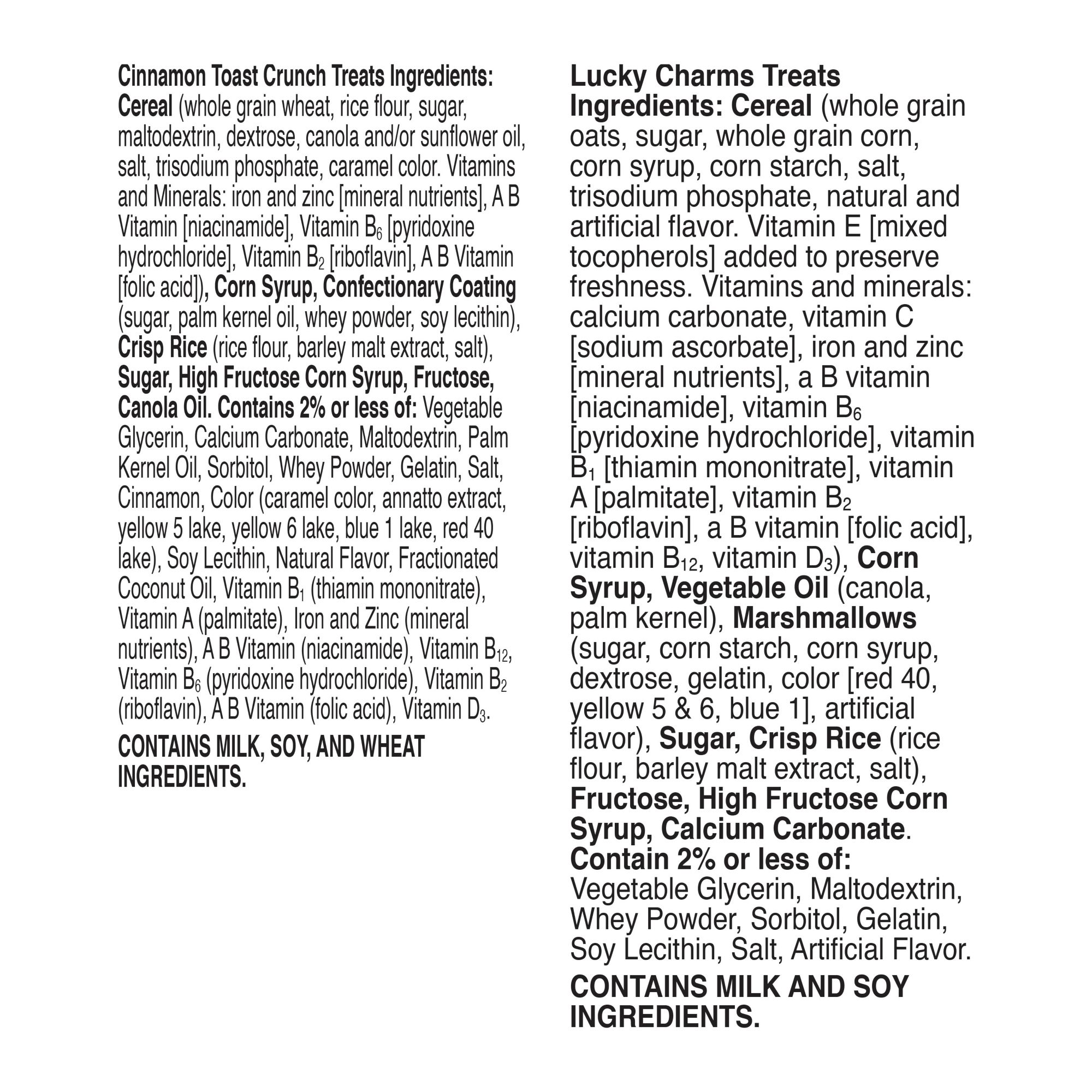 Product Warnings and Restrictions: Lucky Charms Ingredients: CONTAINS MILK AND SOY INGREDIENTS Cinnamon Toast Crunch Ingredients: CONTAINS MILK, SOY AND WHEAT INGREDIENTS"
