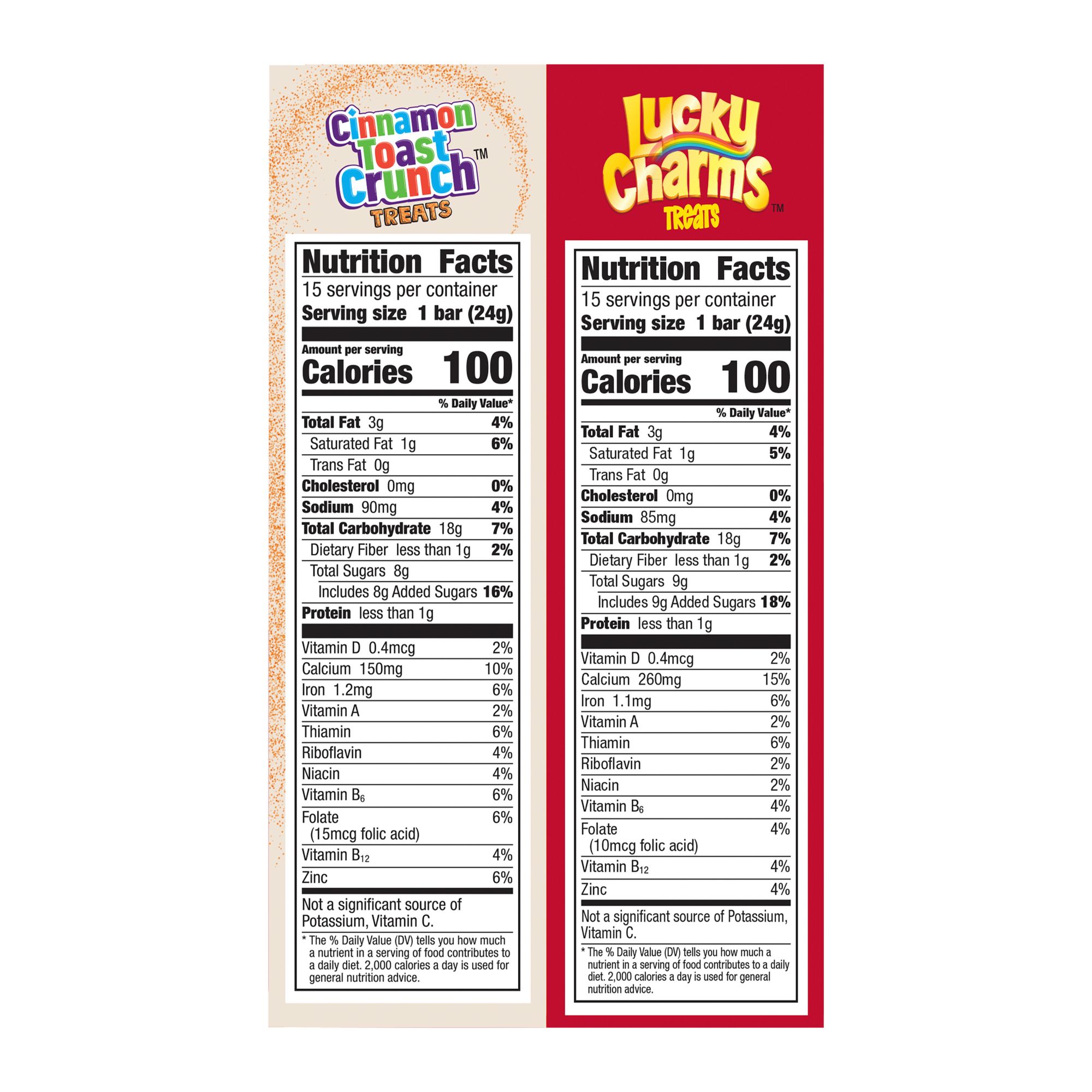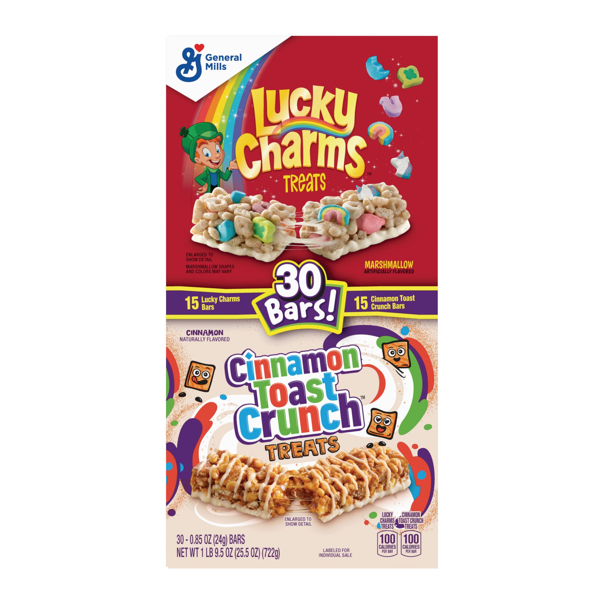 30 - 0.85 oz. (24g) bars net weight: 1 lb. 9.5 oz. (25.5 oz.) (722g) Variety Pack: Includes Lucky Charms and Cinnamon Toast Crunch treat bars; Portable snacks perfect for the pantry, lunch box, and breakfast treats Easy Morning Snack: These individually wrapped bars are an ideal on-the-go breakfast snack your whole family will love; 100 calories per treat bar Kids Treats: Fun cereal bars for school snack time, kids parties, college dorms, road trips and more; Packed with the cereal crunch and flavor kids and adults love Includes (15) Lucky Charms and (15) Cinnamon Toast Crunch treat bars, 30 ct. total
