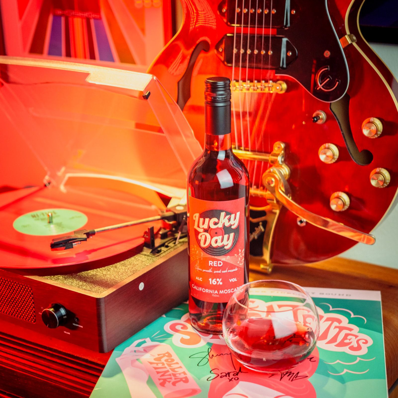 Lucky Day Red Moscato is proud to be Certified California Sustainable and made in the USA. Lucky Day 16% Moscato is a super smooth real California Moscato and is crafted with expertise from real, sun-ripened fruit with rich flavors and natural sweetness. At 16% alcohol, Lucky Day Red Moscato offers wine drinkers a premium choice when selecting a higher- alcohol sweet wine. Lucky Day Red is a Black Muscat blend with dark fruit flavors. Please serve well chilled while vibing with your friends to your favorite beats.