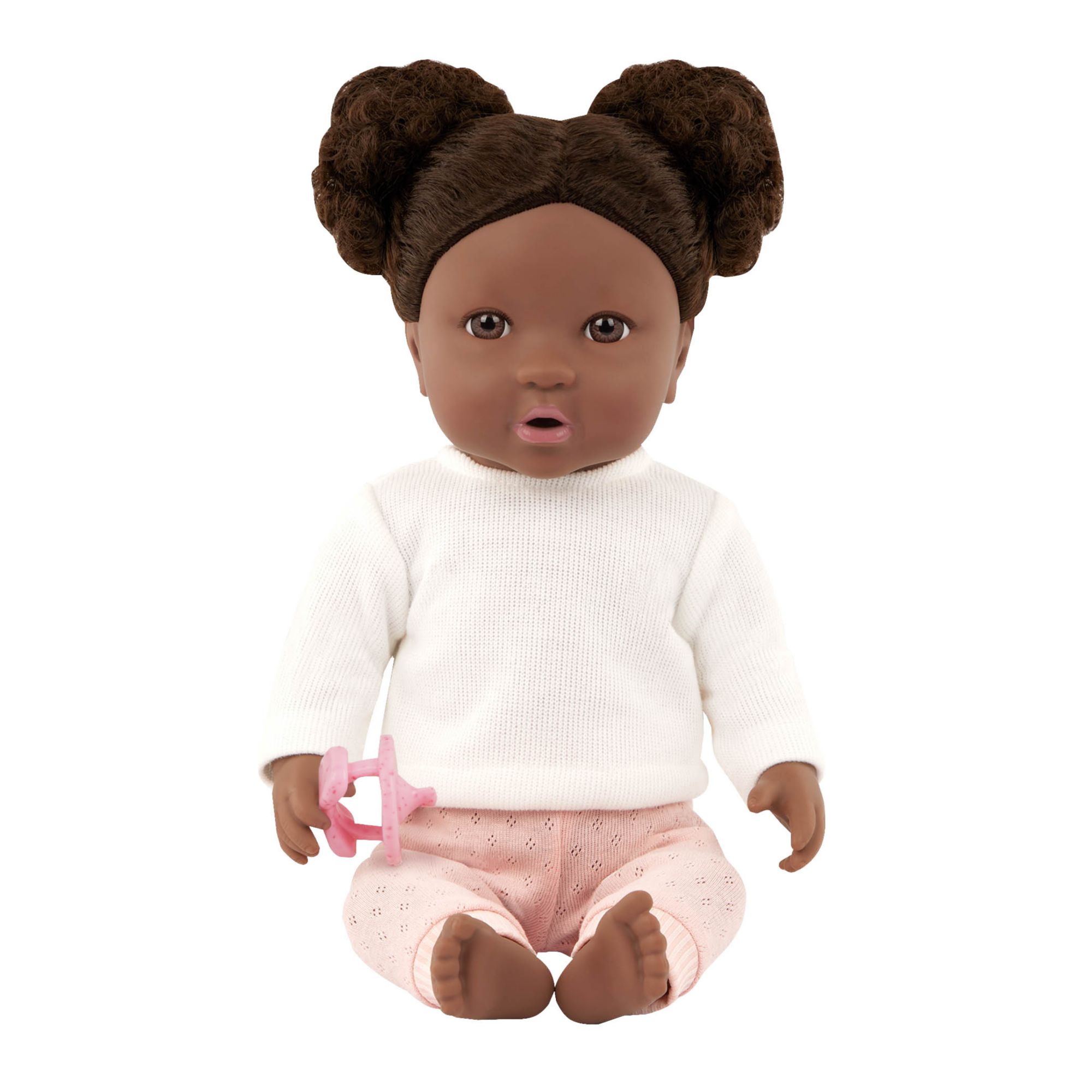 Discover precious playtime with LullaBaby. Designed with realistic features, this adorable 14" baby doll has curly, dark-brown hair to style, brown eyes, and a huggable soft body for sweet cuddles. Little hands can easily remove a baby's outfit when it's changing time. Plus, the pacifier accessory lets kids soothe their baby doll during role-play. LullaBaby dolls encourage imagination and inspire kindness as kids play and grow with their baby dolls. Safety tested to meet all regulatory phthalates and BPA requirements. Makes a wonderful gift for kids aged 2 years old and up and a perfect first baby doll for toddlers.