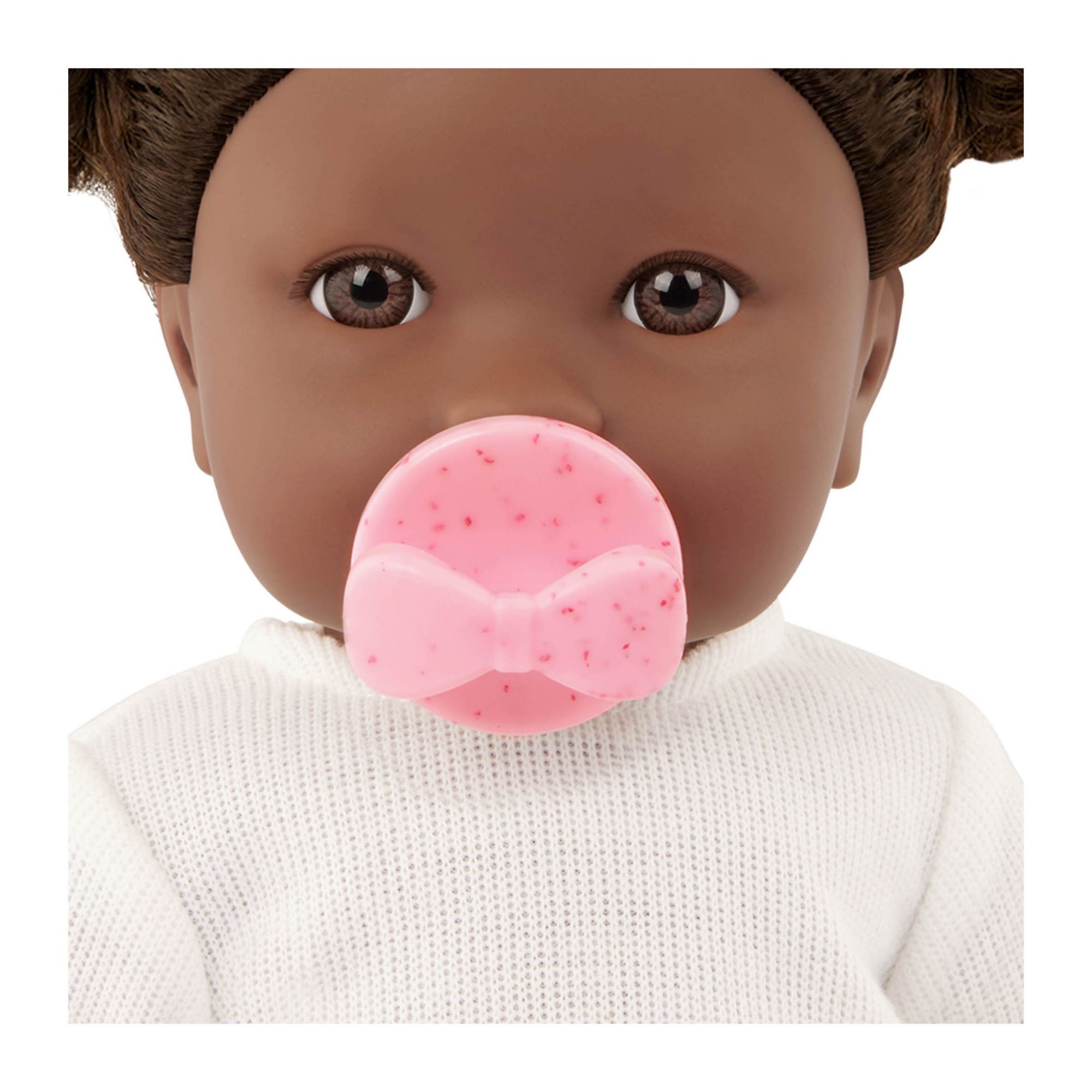 Easy-Change Clothing: Outfit has easy-open closures for little hands to quickly change baby. Includes two removable hair elastics and a pacifier that fits in baby’s mouth for gentle soothing