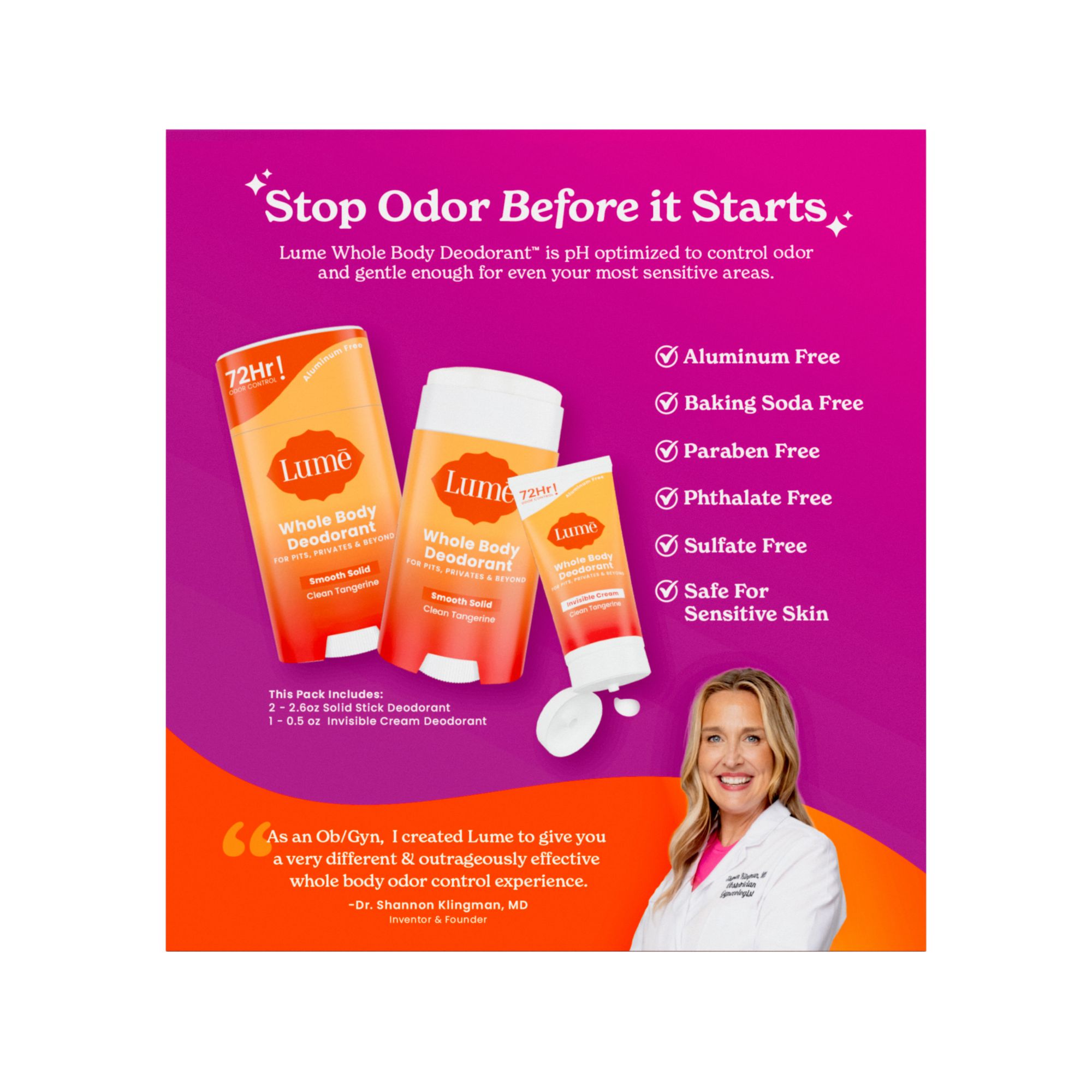 Smell better everywhere. Armpits aren’t the only place we have odor, and whole body deodorant for pits, privates and beyond is uniquely made to control all external body odor. One deodorant is all you need for underarms, underboobs, private parts, skinfolds and creases, belly buttons, and feet. Science bsed and clinically proven. Lume's science based approach has raised the bar for personal hygiene. Lume Whole Body Deodorant for women is pH optimized to block odor before it starts and clinically proven to control odor for 72 hours. Powered by Mandelic Acid–a gentle alpha hydroxy acid–this deodorant is clinically proven to gently exfoliate, brighten skin and reduce skin redness, visually even skin tone, and decrease the appearance of hyperpigmentation.