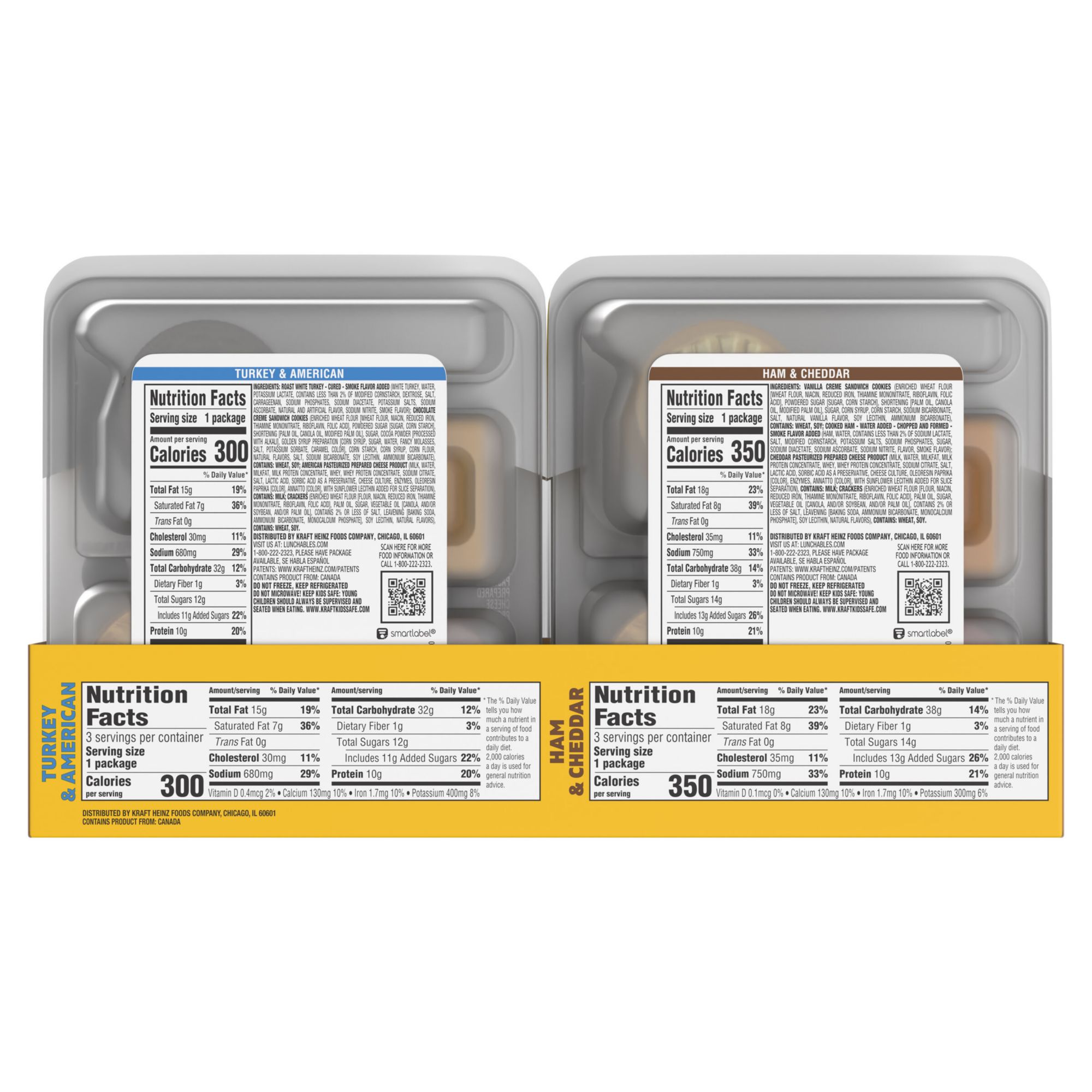 Have fun with lunch! This Lunchables Variety Pack lets kids eat it their way — no prep needed! The Ham & Cheddar contains ham with water and smoke flavor added and cheddar pasteurized prepared cheese product, while the Turkey & American contains cured roast white turkey, smoke flavor added and American pasteurized prepared cheese product. Whether you chose ham or turkey, both kits come with buttery, flaky crackers featuring the perfect combo of salty and sweet flavor. For a tasty treat, enjoy delicious sandwich cookies with smooth, velvety creme filling, crafted exclusively for Lunchables kits. Packed with protein and fun in every bite, each serving contains 10 grams of protein. These Lunchables kits taste great and are perfect as part of school lunches, weekend bites or any time hunger strikes. The real win is that kids get to make it and eat it their way! Stock up with the Lunchables Variety Pack so you always have a quick and easy option on hand. Keep Lunchables refrigerated until you're ready to enjoy.