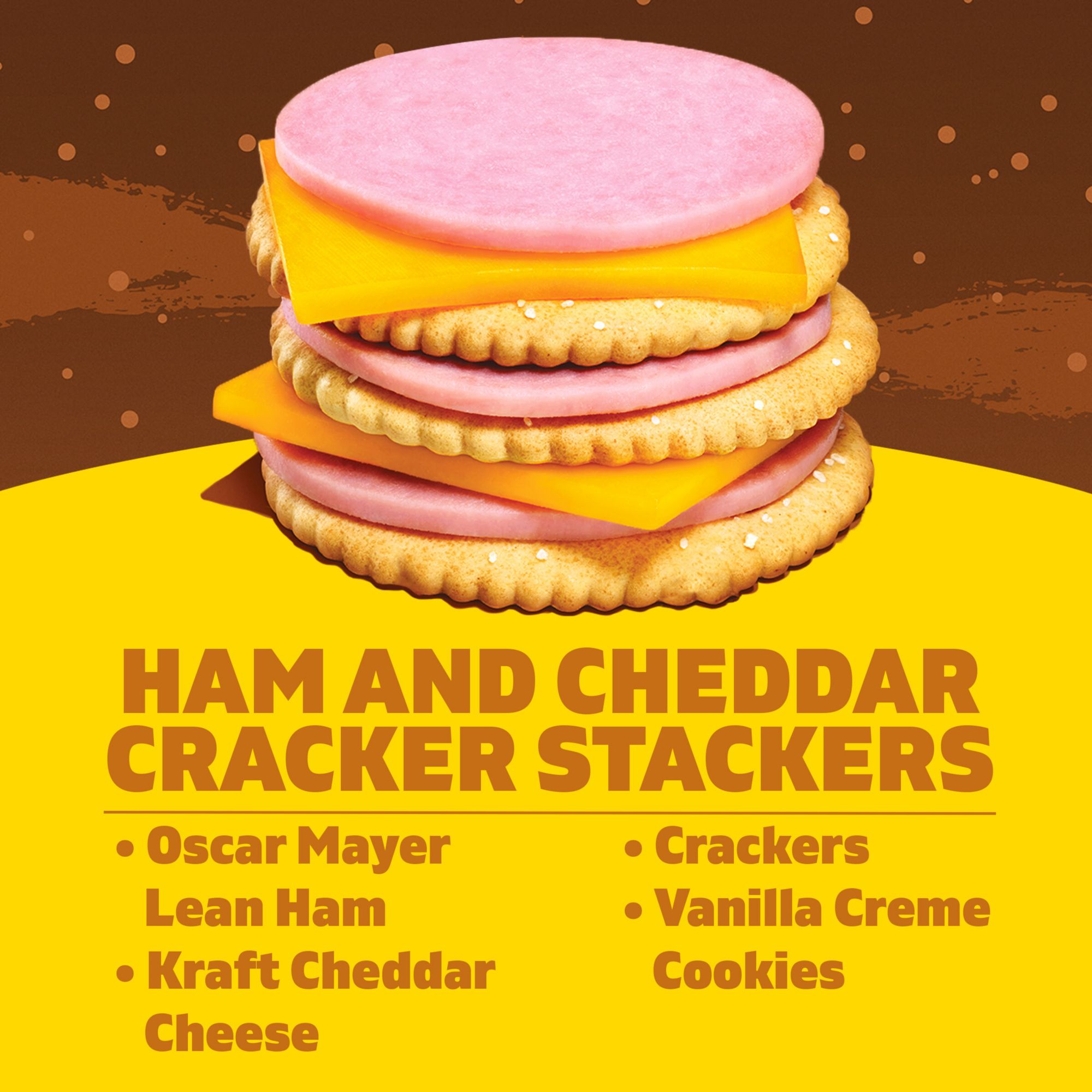 Ham & Cheddar contains ham with water and smoke flavor added, cheddar pasteurized prepared cheese product, buttery, flaky crackers and vanilla creme sandwich cookies