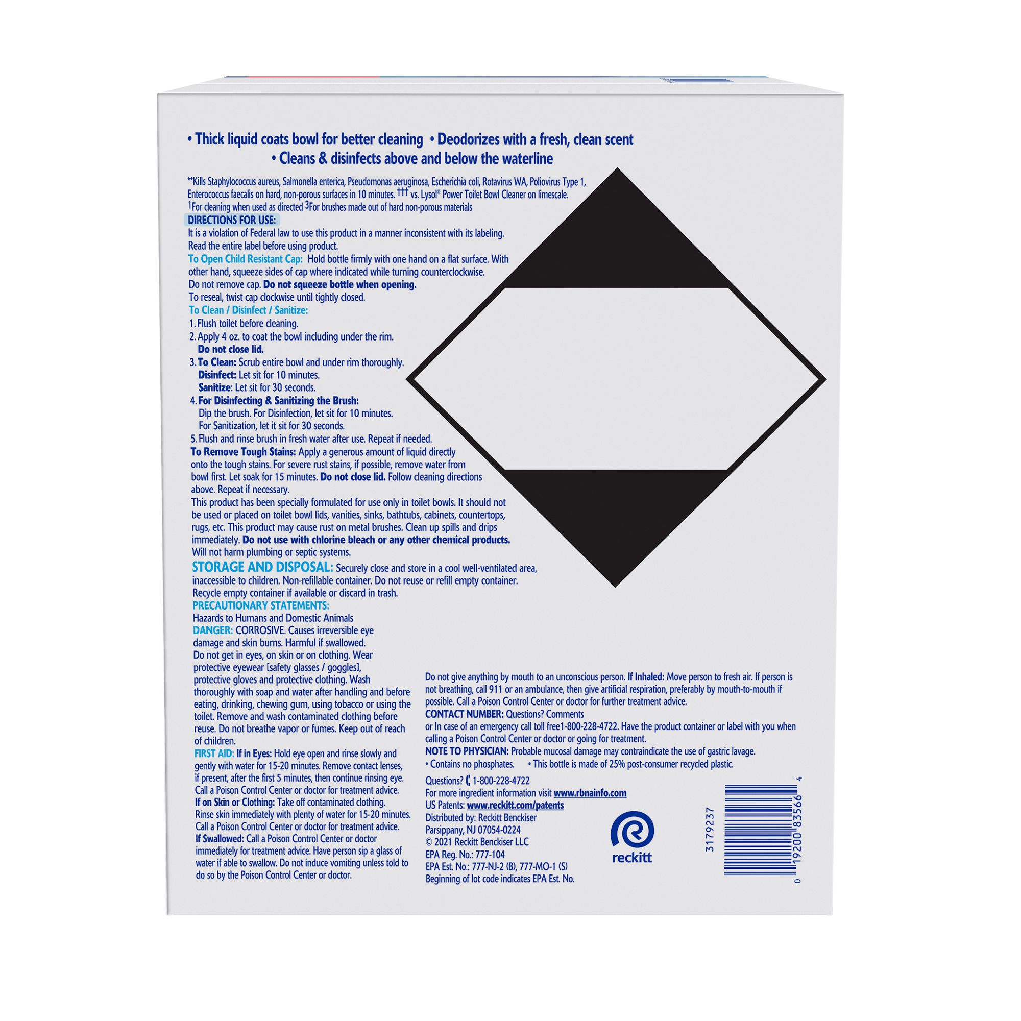 This product has been specially formulated for use only in toilet bowls. It should not be used or placed on toilet bowl lids, vanities, sinks, bathtubs, cabinet, counter tops, rugs, etc. Clean up spills and drips immediately. Do not use with chlorine bleach or any other chemical products. Will not harm plumbing or septic systems. Keep out of reach of children. Danger: Corrosive. Harmful if swallowed. Hazards to humans and domestic animals. Causes irreversible eye damage and skin burns. Harmful if swallowed. Do not get in eyes, on skin or on clothing. Wear protective eyewear [safety glasses/goggles], protective gloves and protective clothing. Wash thoroughly with soap and water after handling and before eating, drinking, chewing gum, using tobacco or using the toilet. Remove and wash contaminated clothing before reuse. Do not breathe vapor or fumes. Keep out of reach of children.