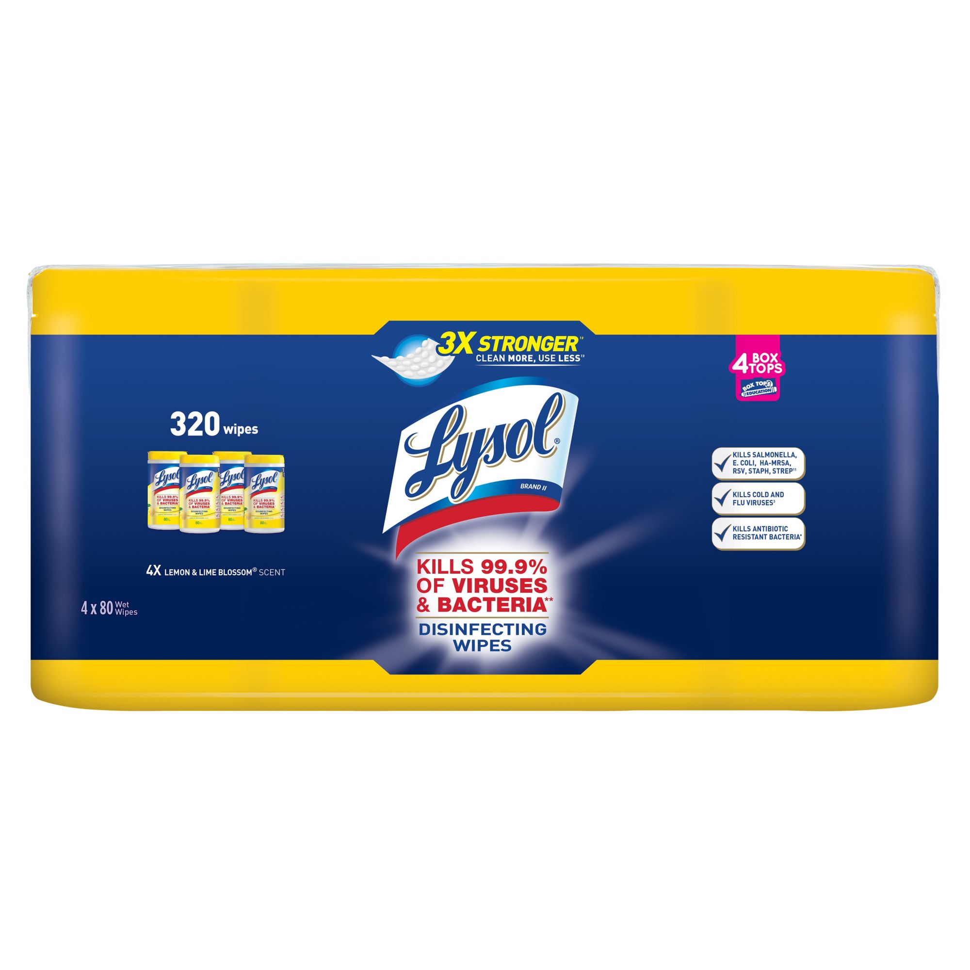 Premoistened wipes are ready-to-use Removes more than 95% of allergens Kills 99.9% of viruses and bacteria Ideal for counters, appliances, cabinets, floors, garbage cans and toilets Includes 2 canisters of 80 Lemon & Lime Blossom disinfecting wipes and 2 canisters of 80 Ocean Fresh disinfecting wipes (320 wipes total)