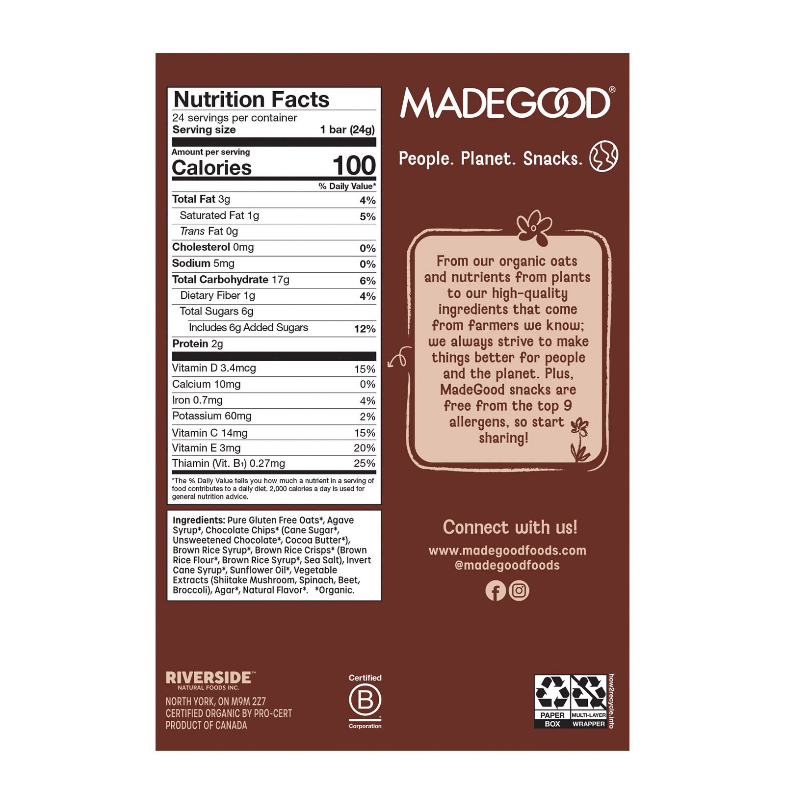 Granola bars and chocolate chips are two of a kind. Together they create a delicious sweet and hearty bar that kids and adults absolutely love. It’s a classic for a reason. MadeGood is not one to mess with a good thing, but they did make it even better, by choosing , vegan and gluten-free ingredients, proving that there's always room for improvements. Introducing MadeGood Chocolate Chip Granola Bars, the perfect blend of delicious and nutritious. These shelf-stable, ready-to-eat bars are crafted with ethically sourced oats and rich dark chocolate, making them a treat for your taste buds. MadeGood snacks are produced in a peanut and tree nut-free facility, ensuring a worry-free snacking experience for all. Packed with the goodness of six different vegetable extracts while still satisfying your sweet tooth. These gluten-free, kosher, non-GMO, organic, and vegan bars are also a good source of various essential vitamins. Enjoy twenty-four healthy snack bars that are easy to share, making healthy snacking a breeze.