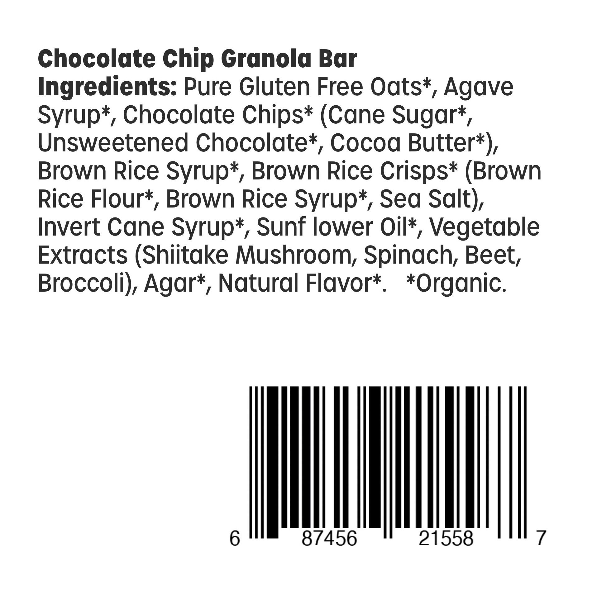 Ingredients: Pure Gluten Free Oats*, Agave Syrup*, Chocolate Chips* (Cane Sugar*, Unsweetened Chocolate*, Cocoa Butter*), Brown Rice Syrup*, Sunflower Oil*, Invert Cane Syrup*, Brown Rice Crisps*, Vegetable Extracts (Spinach, Broccoli, Carrots, Tomatoes, Beets, Shiitake Mushrooms), Natural Flavor*, Agar*, Salt. *Organic.