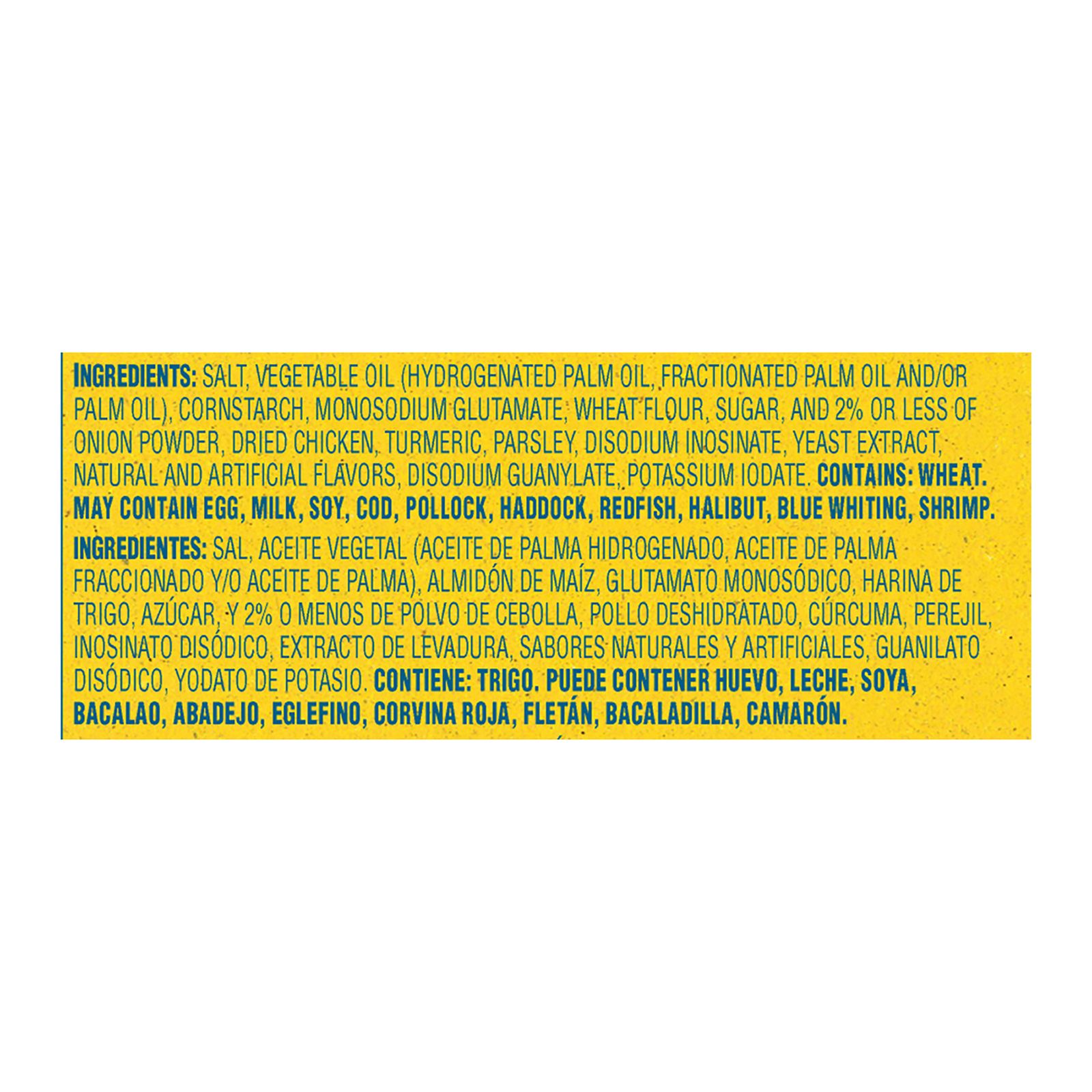 Salt, palm oil, monosodium glutamate, corn starch, wheat flour, sugar, dehydrated chicken, onion powder, less than 2% of yeast extract, turmeric, spice, disodium inosinate, natural flavor.