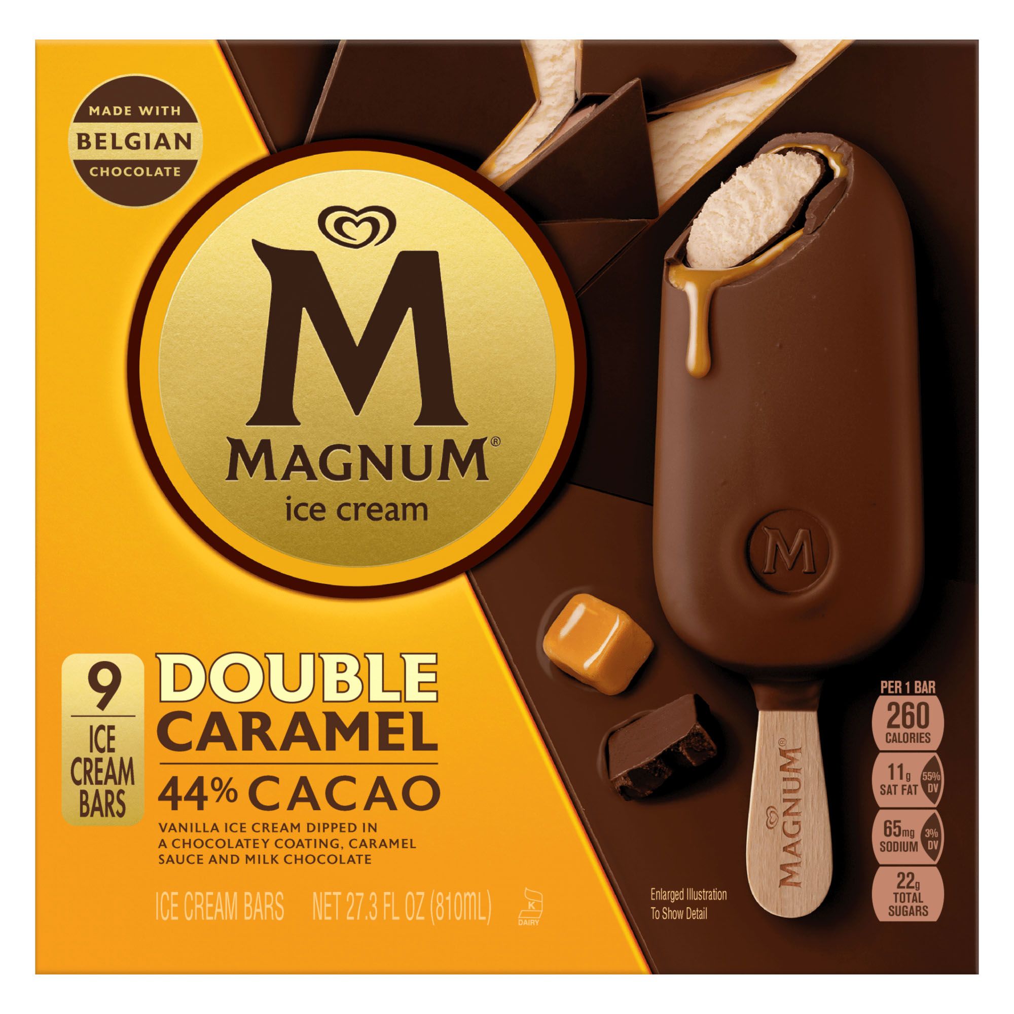 Magnum Double Caramel Bars offers our ultimate indulgence for true pleasure seekers. Each ice cream bar is made with velvety smooth ice cream and is covered in a chocolatey layer, a layer of luscious sauce, and a final thick chocolate coating made with Belgian chocolate. The result is the perfect combination of delicious flavors and textures in every bite.