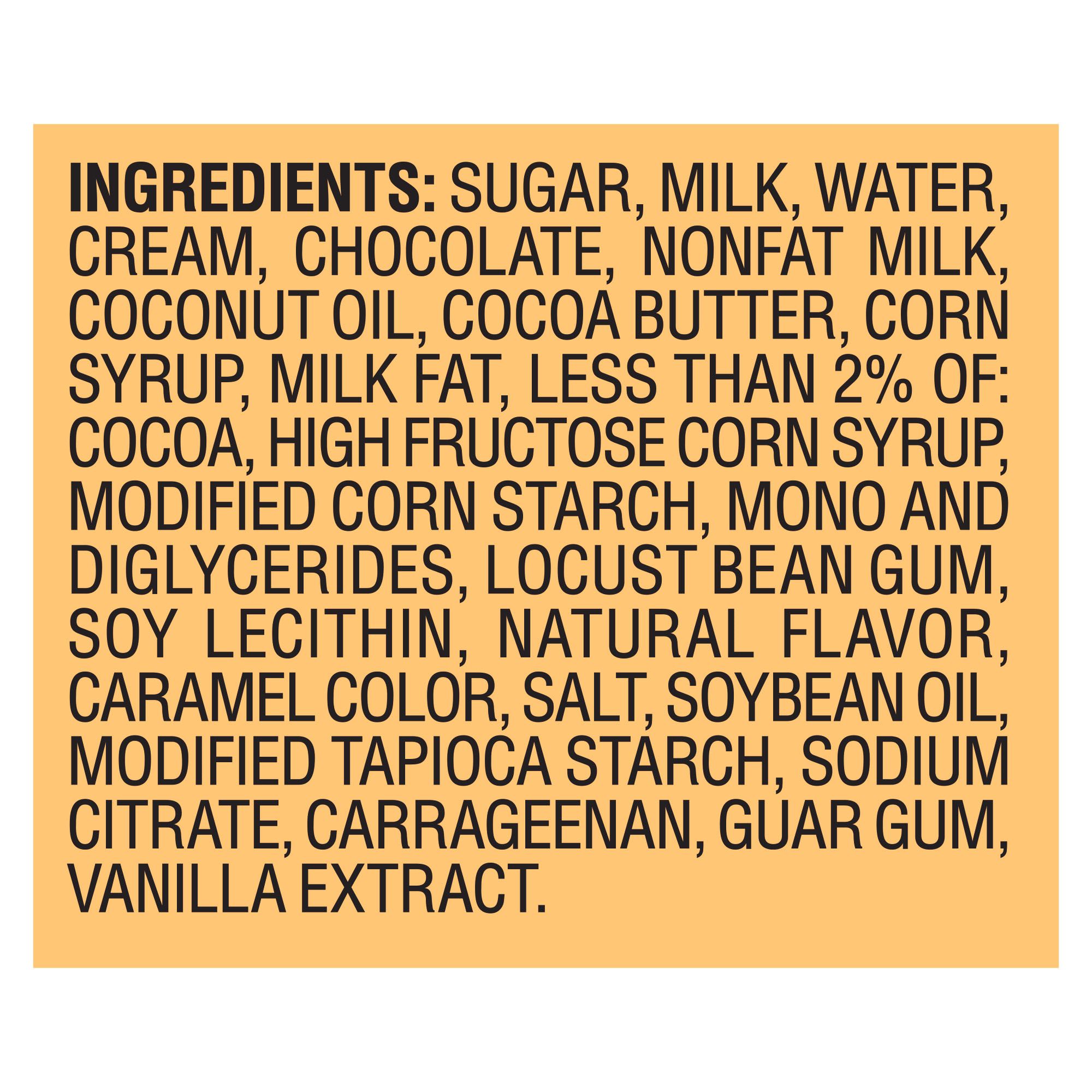 Ingredients: Silk Chocolate [Sugar, Chocolate, Cocoa Butter, Milk, Milkfat, PGPR (Emulsifier) and Soy Lecithin (Emulsifier), Vanilla Extract], Milk, Caramel Sauce [Water, Sugar, Corn Syrup, High Fructose Corn Syrup, Nonfat Dry Milk, Coconut Oil, Modified Corn Starch, Caramel Color, Salt, Mono & Diglycerides, Carrageenan, Soybean Oil, Modified Tapioca Starch, Sodium Citrate, Potassium Sorbate (Used to Protect Quality), Carob Bean Gum And Natural Flavor], Cream, Chocolatey Coating [Coconut Oil, Sugar, Cocoa, Soy Lecithin, Vanilla Extract], Sugar, Corn Syrup, Contains 1% or Less of: Whey, Mono and Diglycerides, Locust Bean Gum, Water, Guar Gum, Natural Flavor, Carrageenan, Caramel and Annatto Extract (Color))