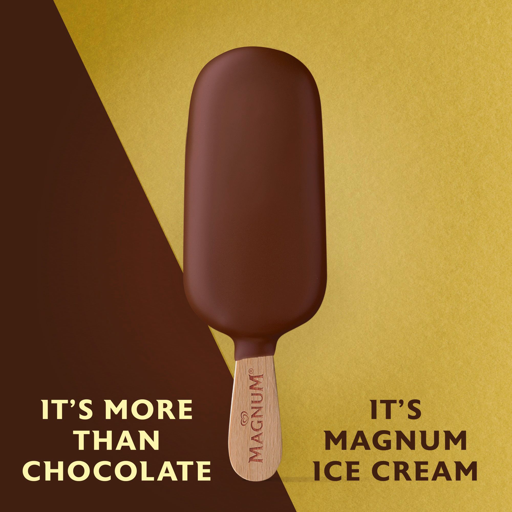 At Magnum, they believe that a day without indulgence is a day lost. That's why they have been creating decadent ice cream indulgences since 1989. Magnum Classic features rich, creamy vanilla ice cream dipped in decadent chocolate, for a classic taste that everyone loves. And because these bars are mini, they're the perfect anytime treat. Beyond Magnum's Mini multi-pack, you can explore the full range of Magnum ice cream bars and discover an expansive world of pleasure. Magnum premium ice cream bars are crafted with a signature Belgian chocolate recipe developed specifically for them. While still warm, this delicious coating wraps around our velvety ice creams, instantly cooling to leave the signature solid, thick shell – ready and waiting to be cracked. From intense to sweet to salty to dark, which one will satisfy your next snack indulgence?