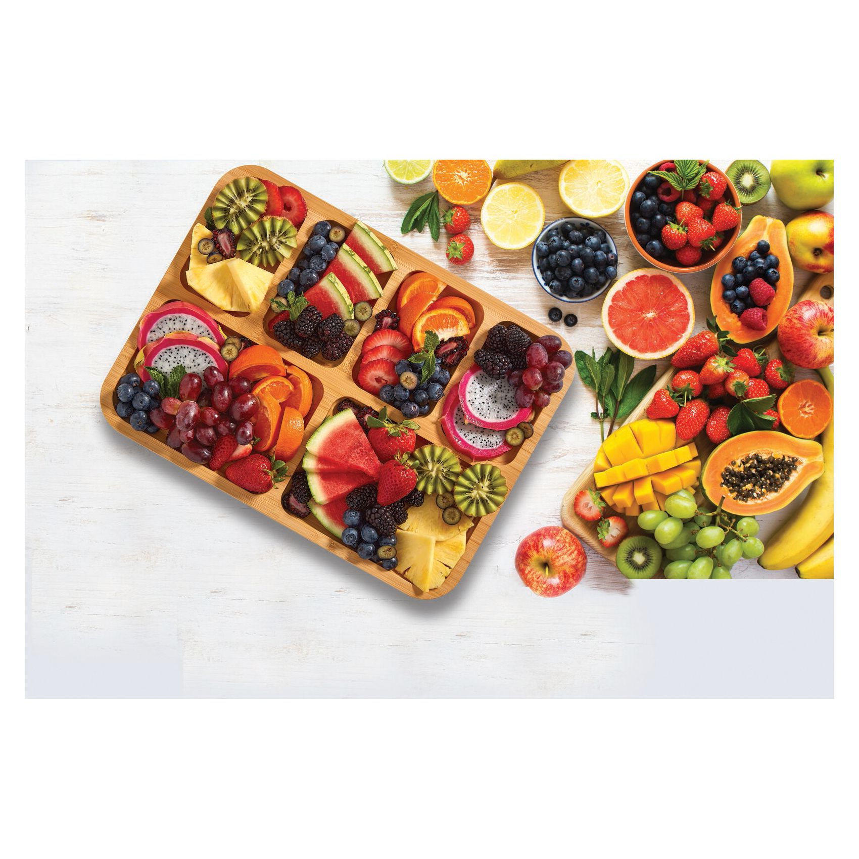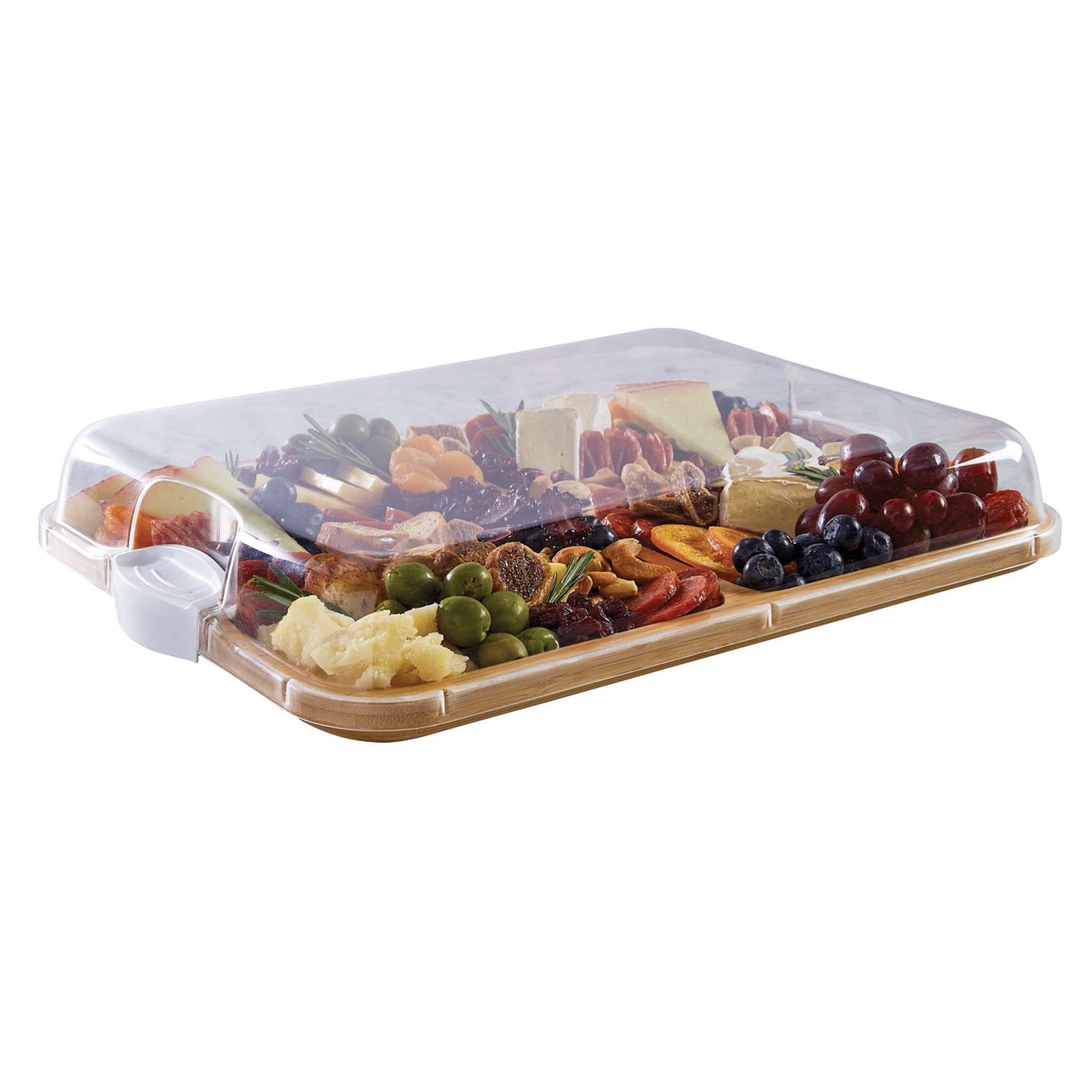 Build a Board is an all-in-one solution for food prep and presentation. Cut and prep on one side; flip to reveal six compartments ideal for charcuterie boards, snack trays, or veggie platters. Arrange cheeses, fruits, nuts, and meats in the compartments to create personalized, eye-catching displays. The SAN clear locking lid keeps everything fresh and in place, ideal for picnics, parties, and more. More than just a cutting board, this product adds elegance to any event. It's an ideal item for holidays, parties, and family gatherings, and a great gift for weddings, housewarmings, and other special occasions. This 12" x 16" board size offers ample space with six compartments for a variety of foods, from candy to crudite.