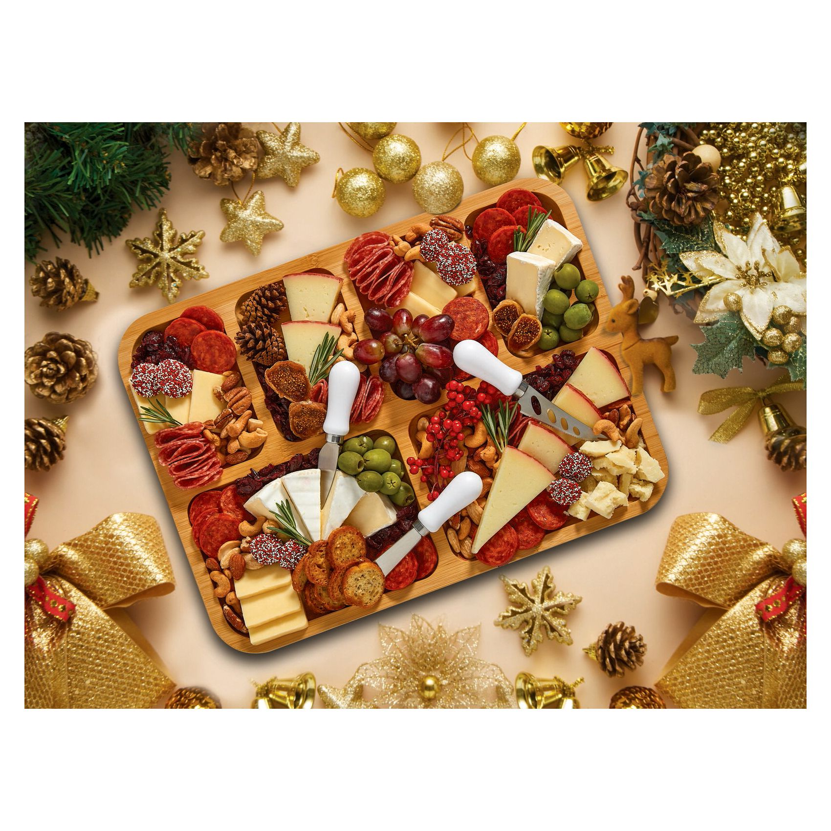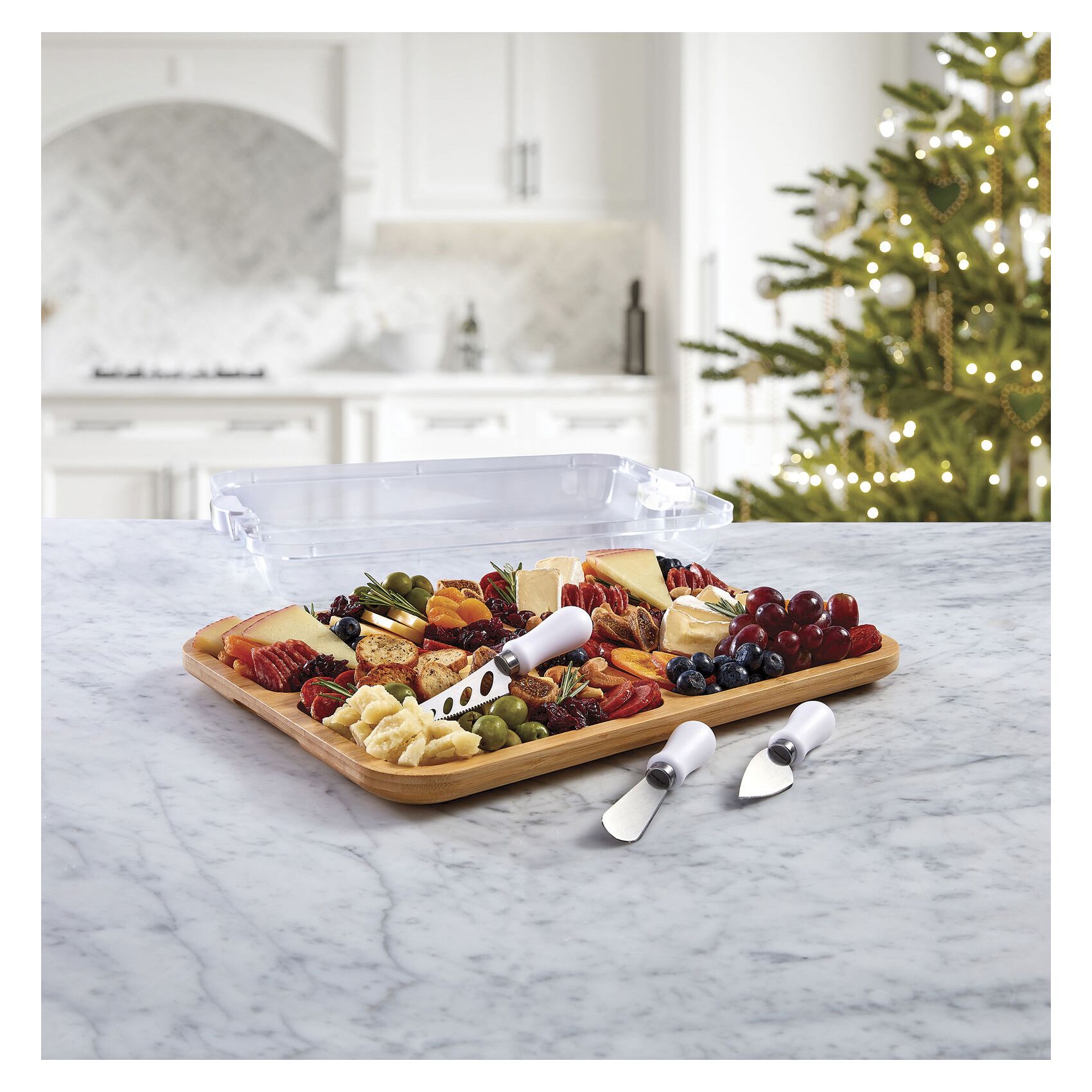 Exclusively at BJ's Make It - Dual-Function Design: The Farberware "Build a Board" is an all-in-one solution for food prep and presentation Take It - Customizable & Portable: Arrange cheeses, fruits, nuts, and meats in the compartments to create personalized, eye-catching displays Enjoy It - Elevate your Hosting Game: This set adds elegance to any event and is an ideal gift for special occasions Secure & Fresh: The clear locking lid offers an extra layer of protection during transport Generous Size: 12" x 16" board size offers ample space for a variety of foods Includes 12" x 16" bamboo cutting board with 6 sections, clear locking lid, 3-pc. cheese knife set