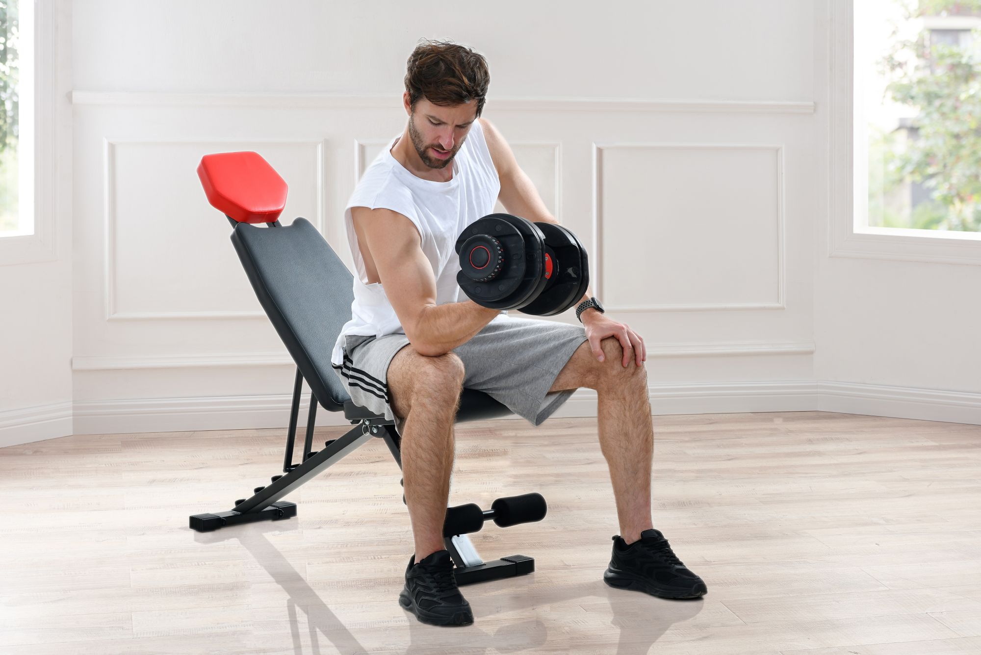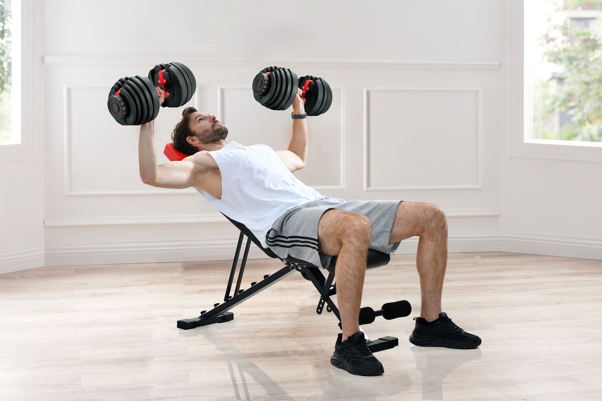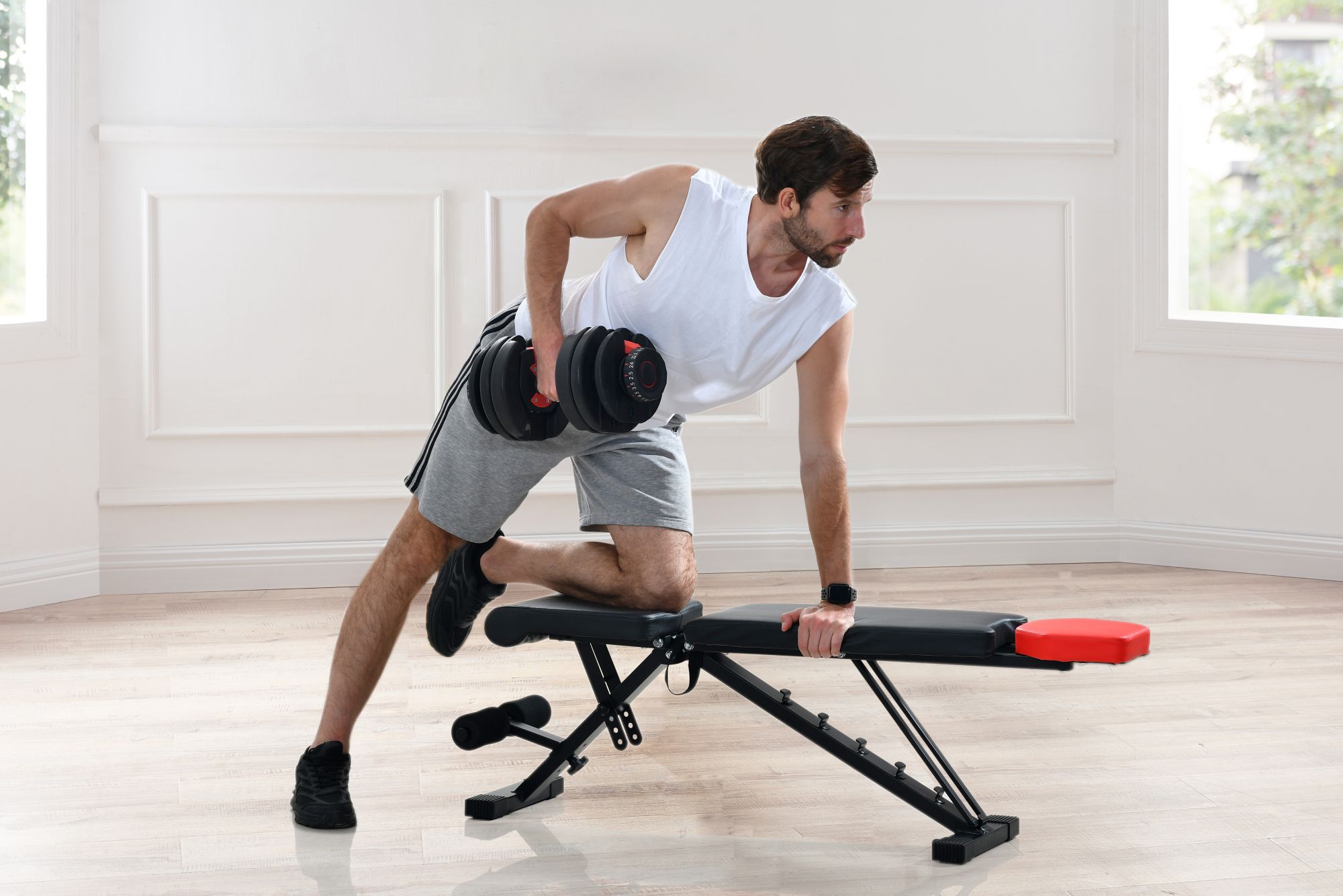 This adjustable weight bench is perfect for all your home workout needs. The padding is thick for extra comfort, and you can choose from six pre-set backrest adjustments, four seat adjustments, and you can even adjust the headrest. This bench’s heavy-duty steel construction has a total weight capacity of 500 lbs.