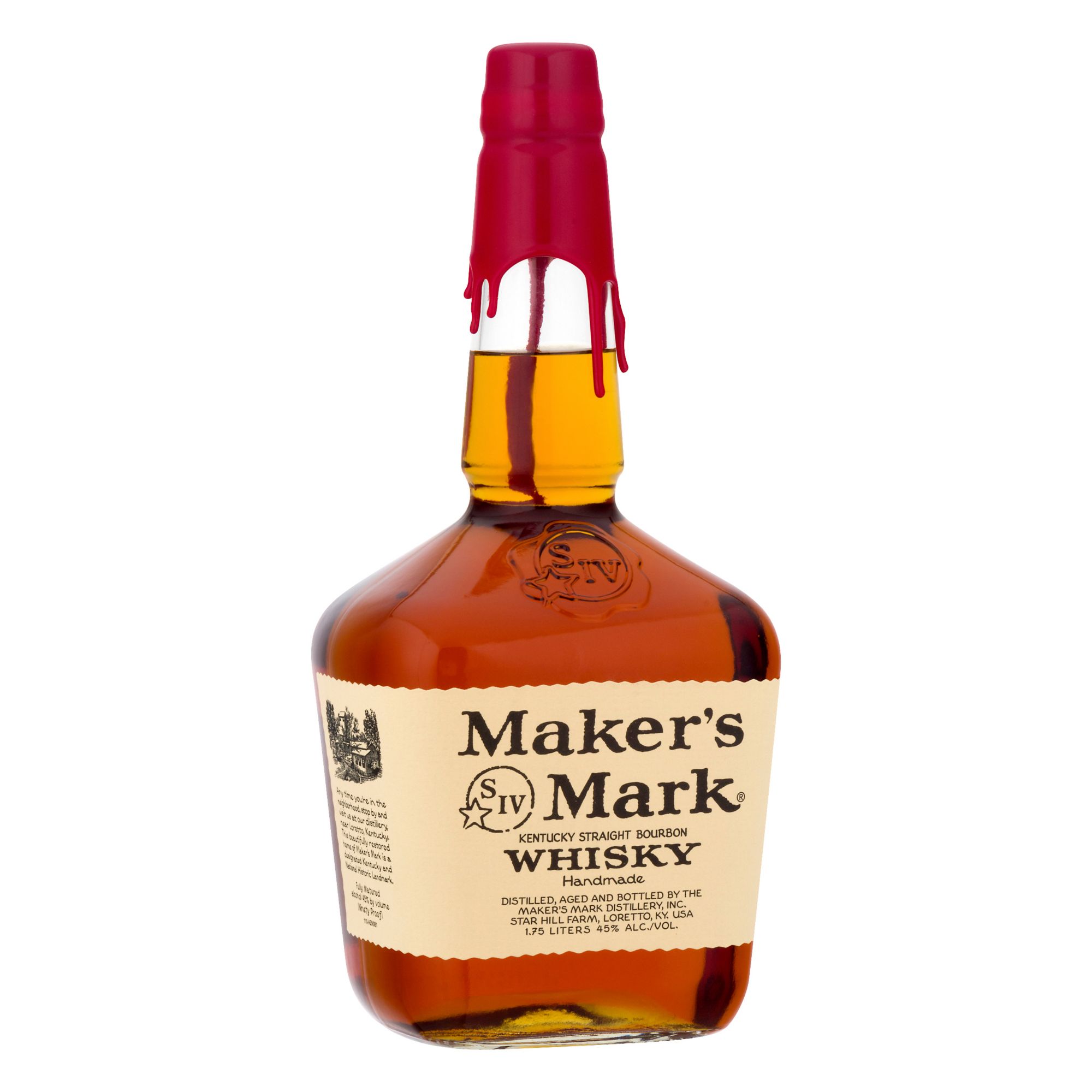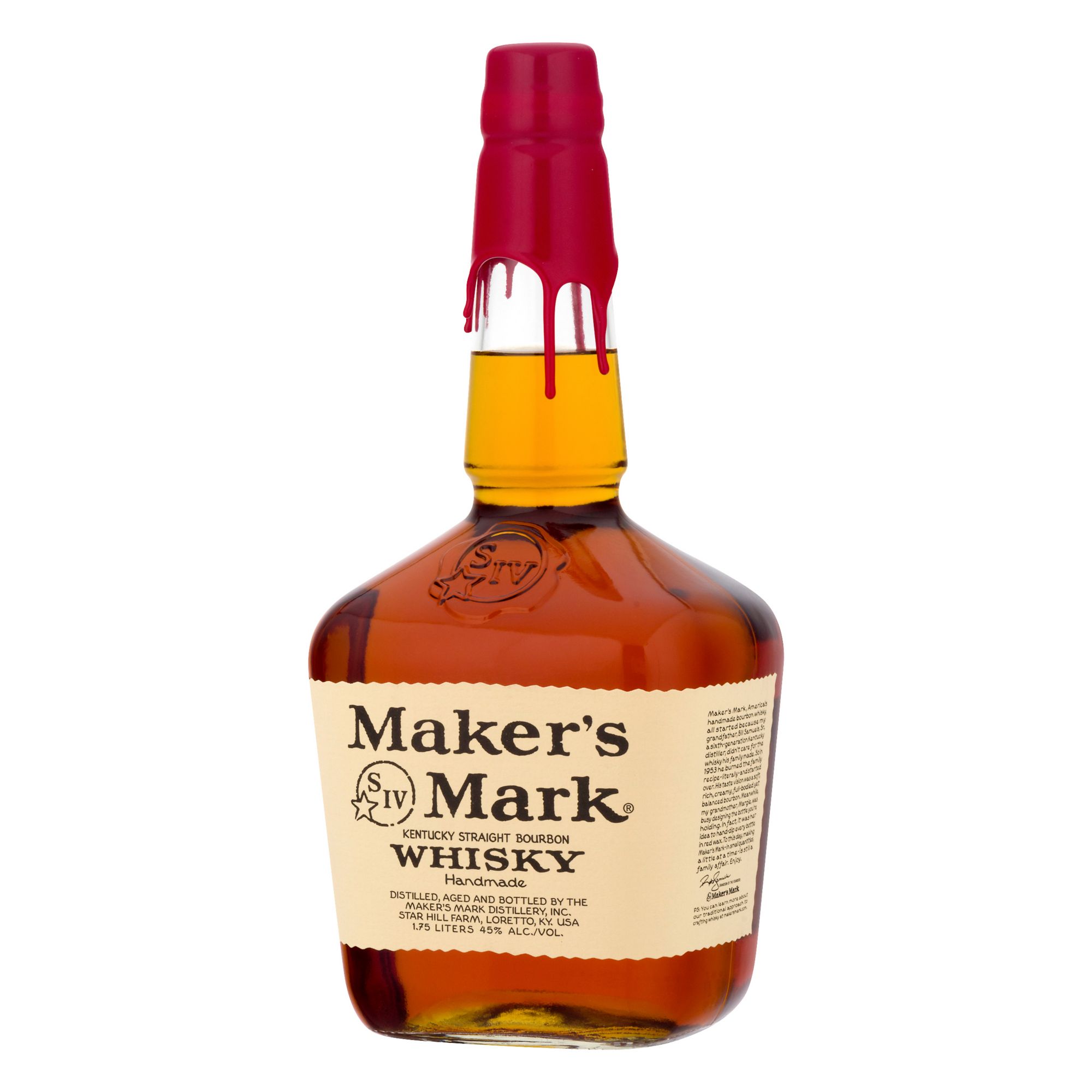 Maker's Mark, America's handmade Bourbon whisky, all started because Bill Samuels, Sr., a sixth-generation Kentucky distiller, didn't care for the whisky his family made. So in 1953 he burned the family recipe-literally- and started over. His taste vision was a soft, rich, creamy, full- bodied yet balanced bourbon. Meanwhile, his wife, Margie, was busy designing the bottle you're holding. In fact, it was her idea to hand-dip every bottle in red wax. To this day, making Maker's Mark- in small quantities, a little at a time-is still a family affair. Enjoy. 45% Alc./vol. 90 Distilled, aged and bottled by the Maker's Mark Distillery, Inc. Star Hill Farm, Loretto, KY, USA.