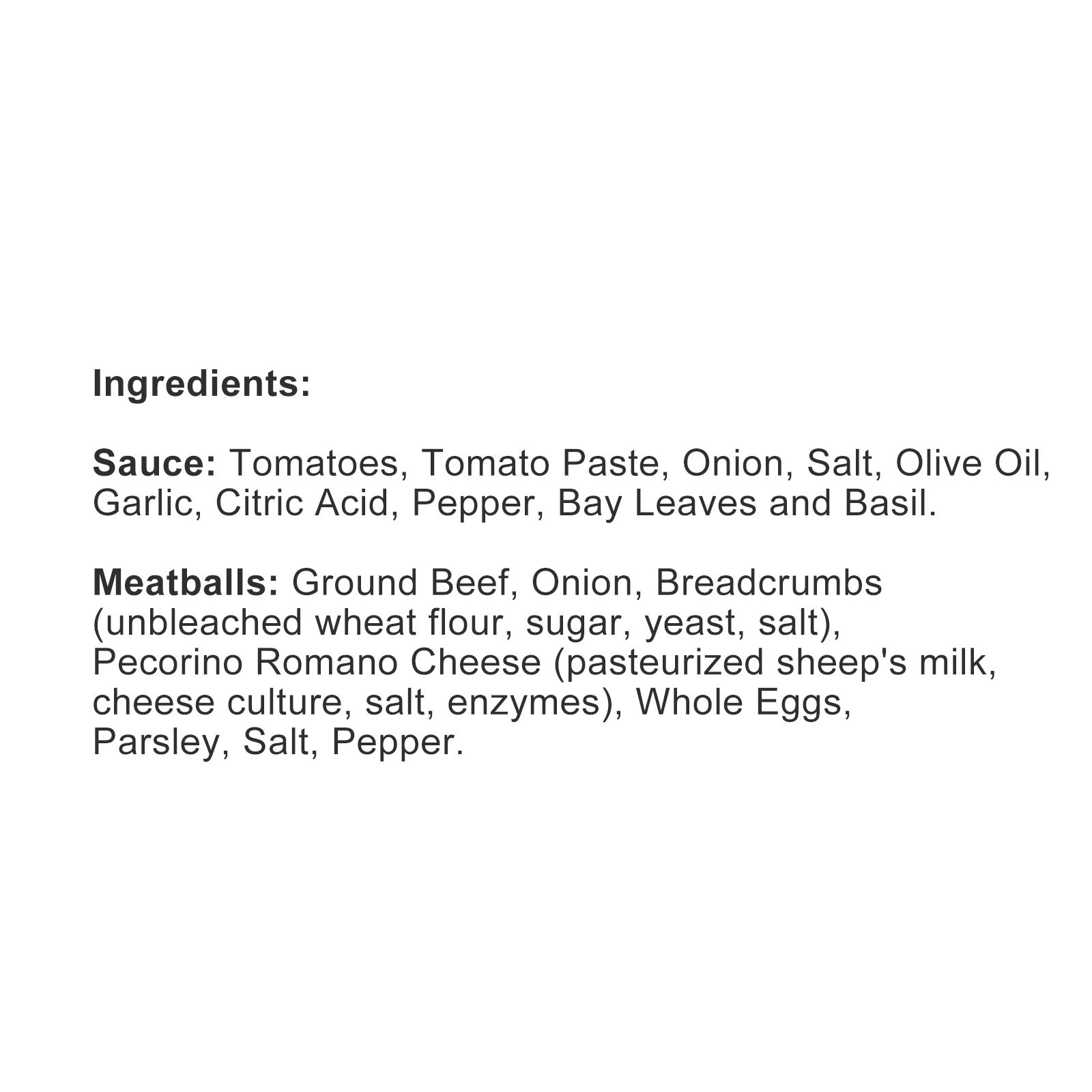 Ingredients: Sauce Tomatoes, Tomato Paste, Onion, Salt, Olive Oil, Garlic, Citric Acid, Pepper, Bay Leaves, Basil, Meatball Ground Beef, Onion, Breadcrumbs (Unbleached Wheat Flour, Sugar, Yeast, Salt), Pecorino Romano Cheese (Pasteurized Sheep's Milk, Cheese Culture, Salt, Enzymes), Whole Eggs, Parsley, Salt, Pepper.