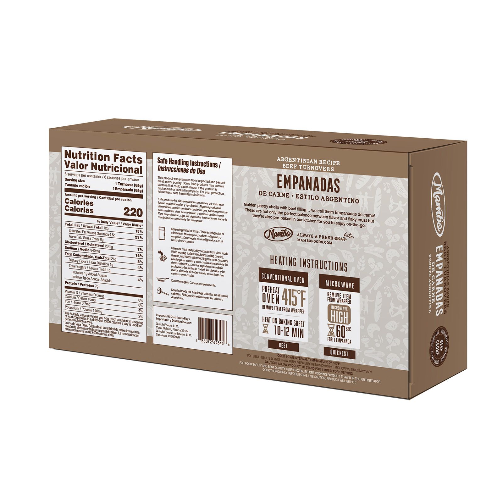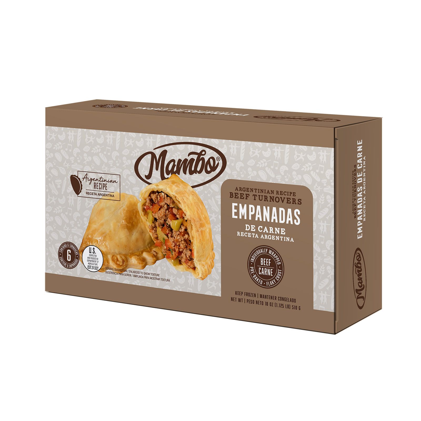 Mambo Argentinian Beef Empanadas are golden pastry shells filled with Argentinian style beef. Every delectable bite is filled with tender beef, Argentinian flavors and a crispy, flaky crust, making each bite perfectly balanced and your taste buds wanting more. Pre-baked in Mambo's kitchen for your convenience, these are perfect for an on-the-go meal. For the quickest way to enjoy, unwrap and microwave each empanada on high for 60-seconds or bake in a conventional oven for 10 to 12 minutes at 450°F. Each box contains six individually wrapped empanadas made with your perfect authentic and traditional Argentinian recipe.