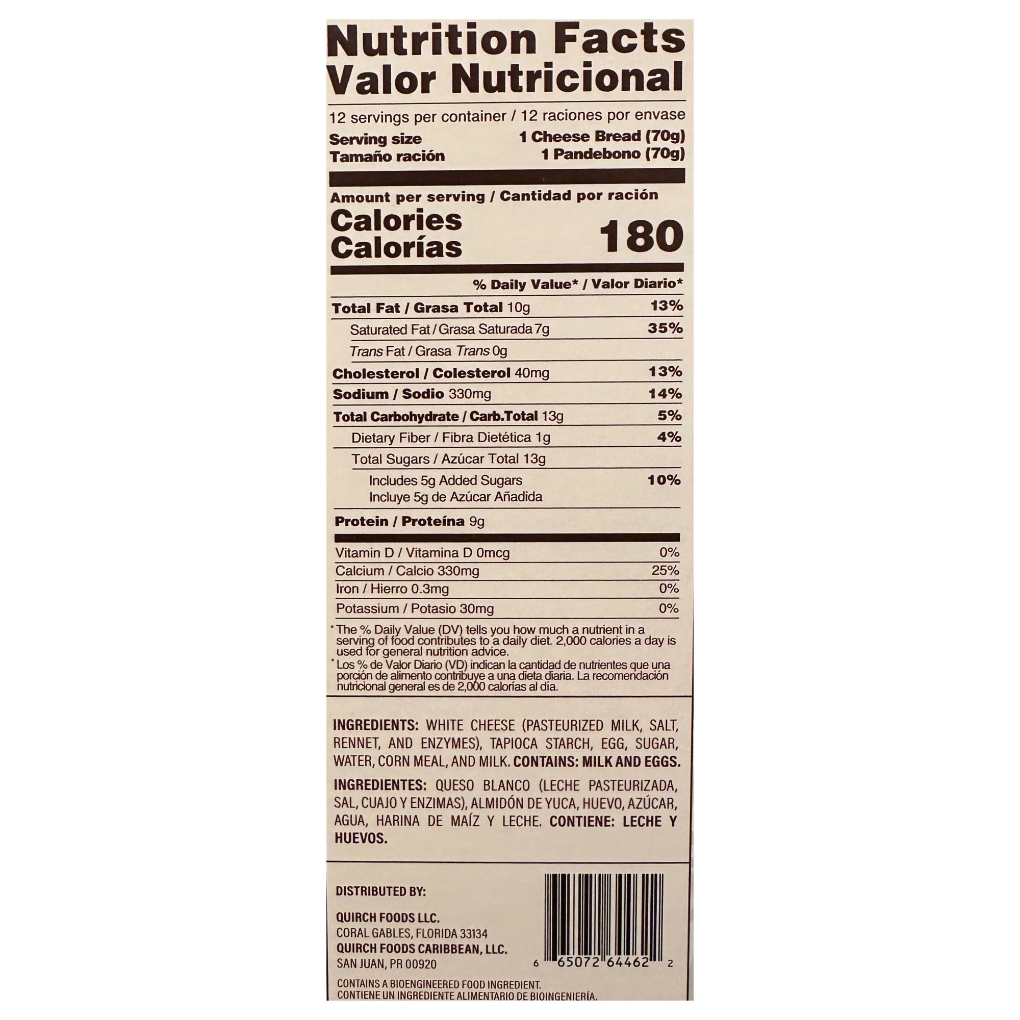 Ingredients: White Cheese (Pasteurized Milk, Salt, Rennet And Enzymes) Tapioca Starch, Eggs, Sugar, Water, Corn Meal And Milk. Contains: Milk And Eggs.