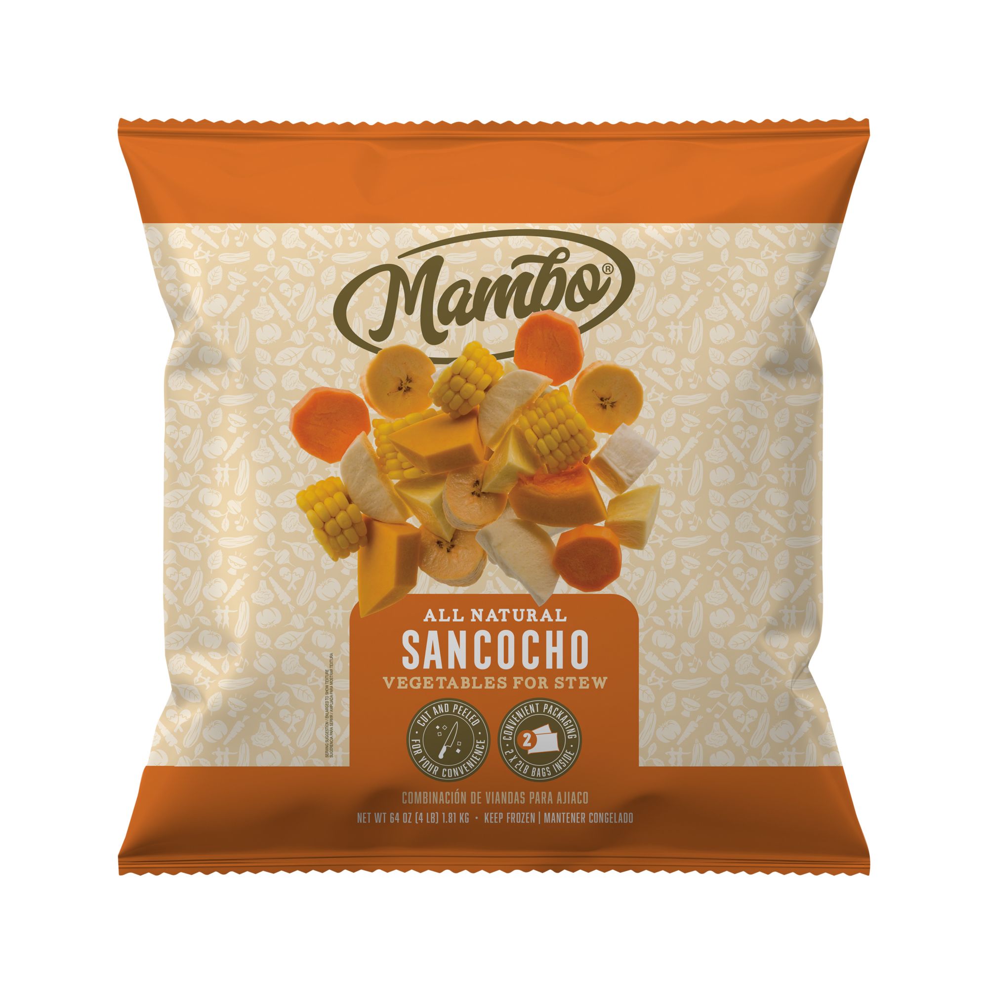 Mambo Sancocho is a combination of vegetables that are perfect for stews and soups. Frozen at their peak of freshness, these seven Hispanic kitchen staples: Pumpkin, Cassava, White Dasheen, Sweet Potato, Plantain, Corn, Yam, are washed, peeled and cut for your convenience. Traditional recipes are easier to prepare and enjoy when you don't have to worry about cutting or peeling ingredients. Some call them Hispanic vegetables or viandas, or you can call them a taste of home.